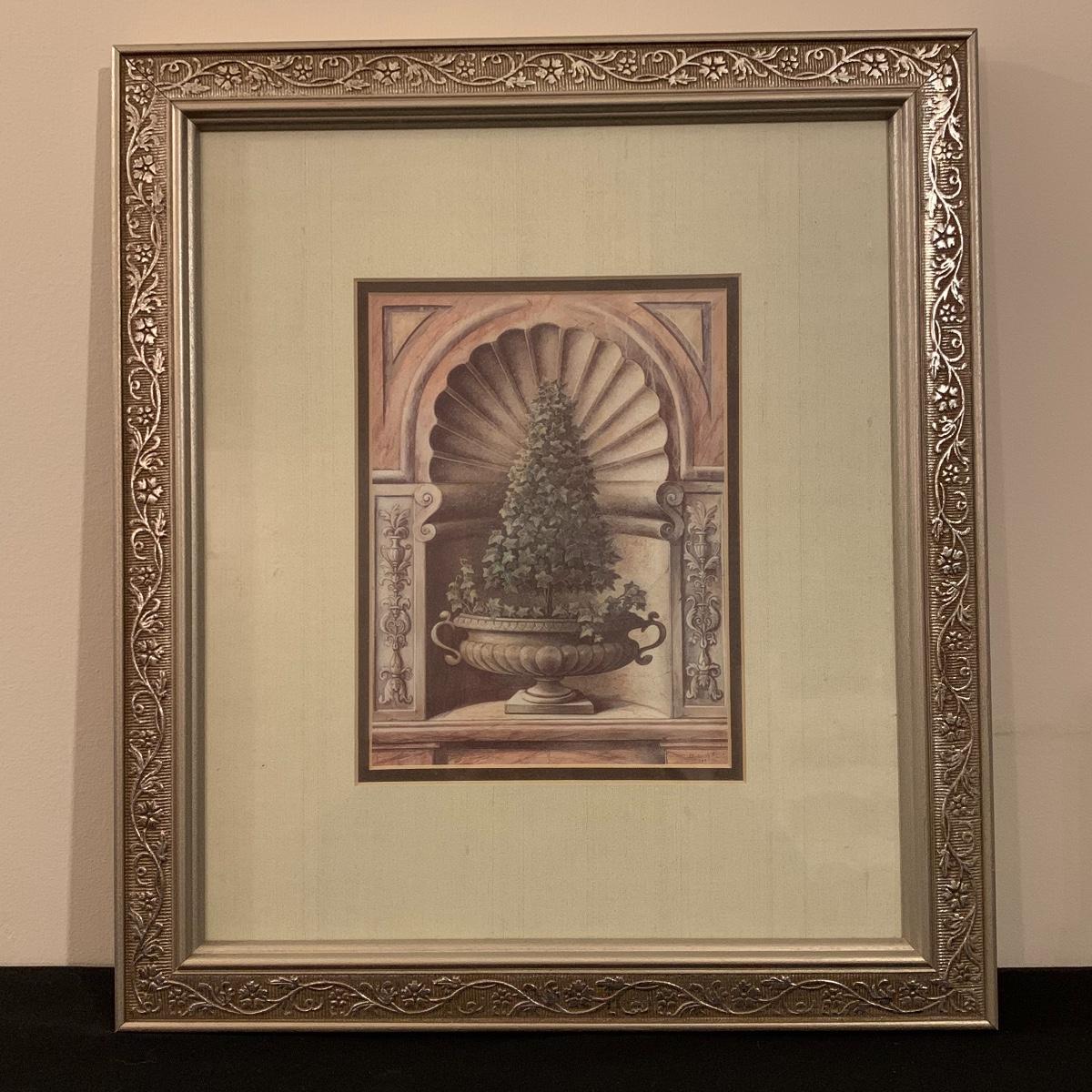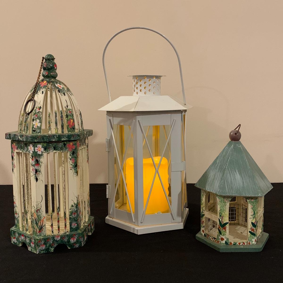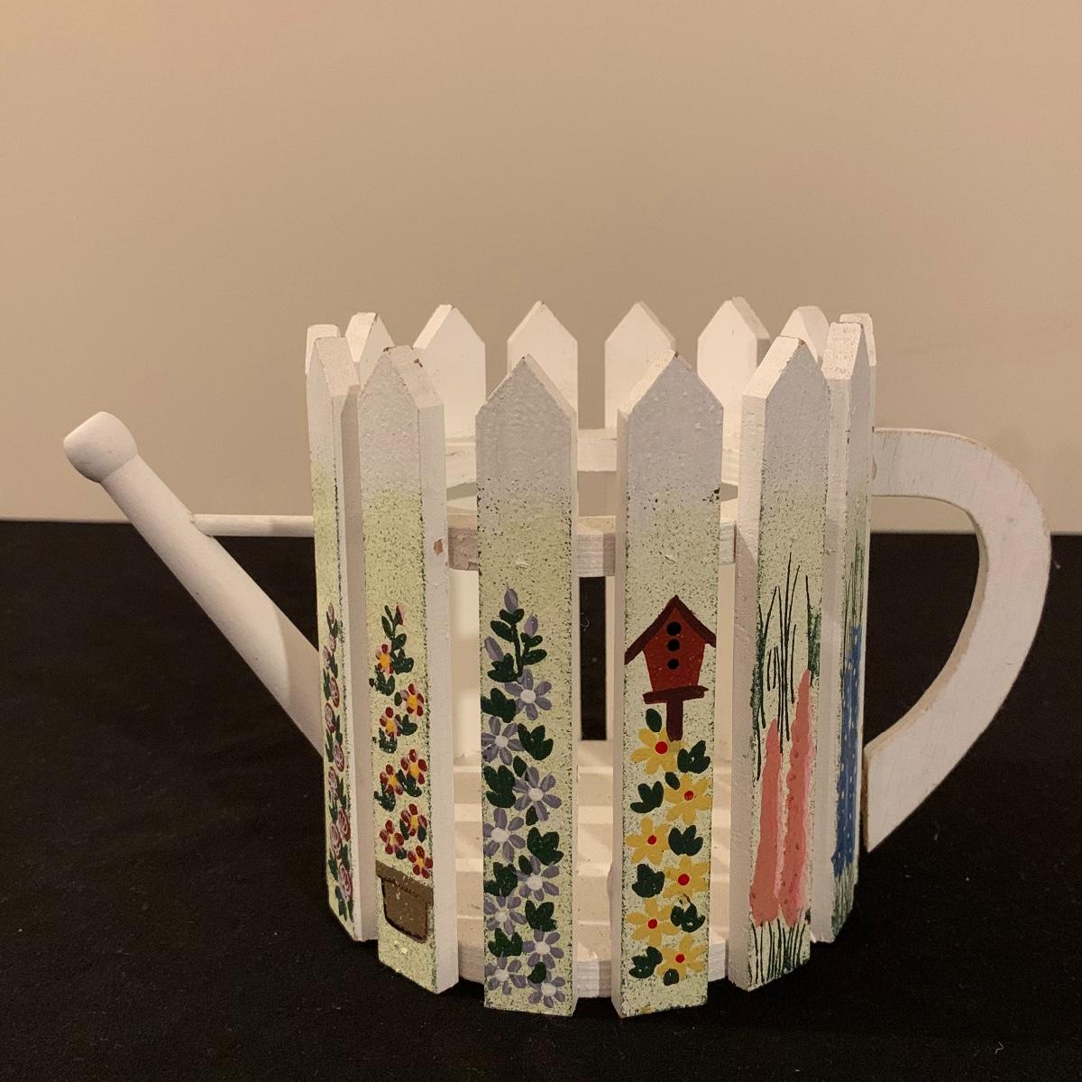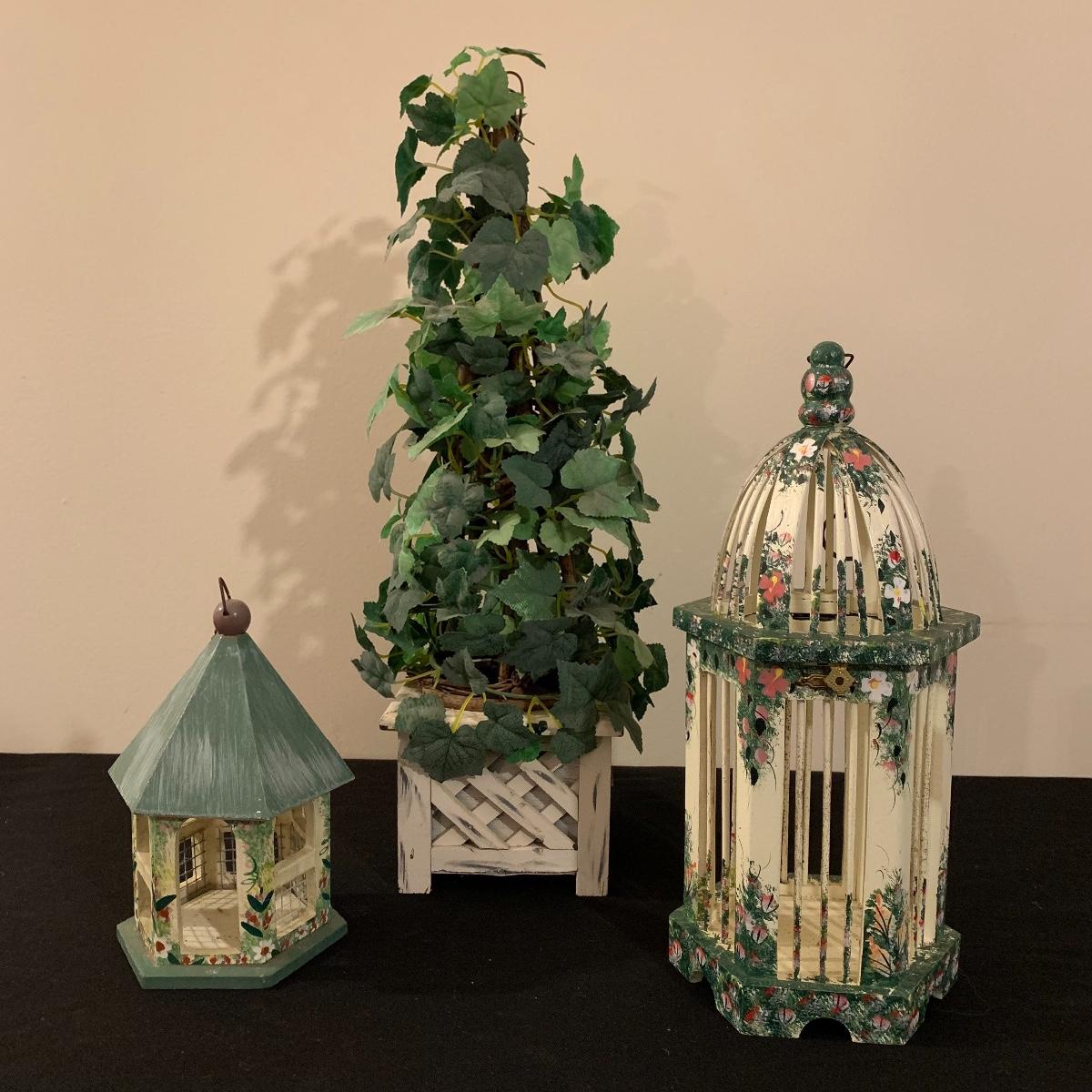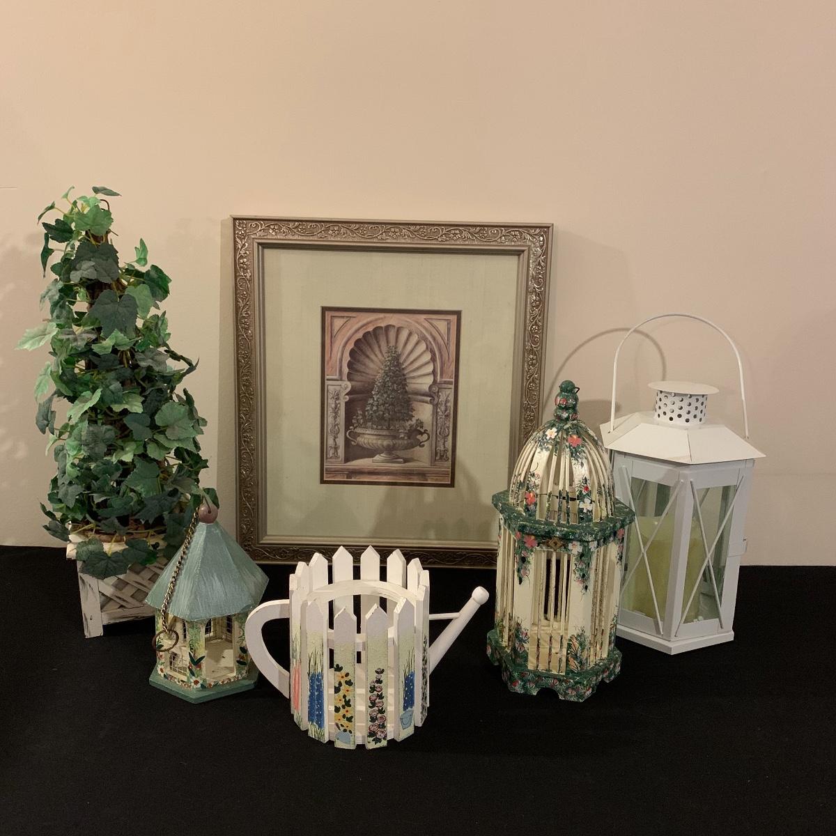 This lot includes various garden themed art and decor. There are two wooden hanging pieces and a watering can-shaped item with hand painted flowers, as well as a small topiary (18” tall). Also included is a battery powered lantern. Additionally, there is a framed print of topiary artwork. The frame is ornate and metallic and is in good condition. There is hardware attached to the back for hanging with a nail. Shipping Available