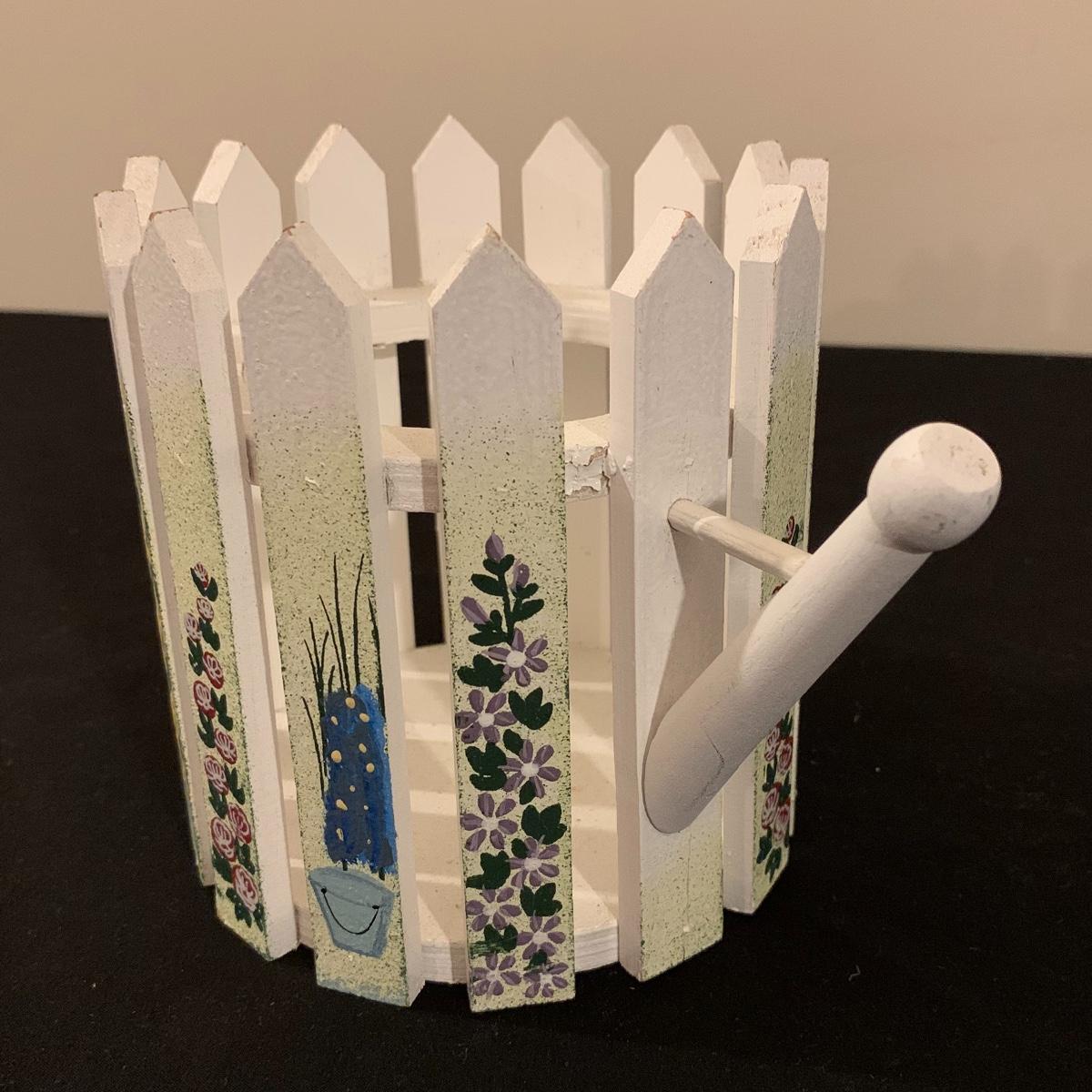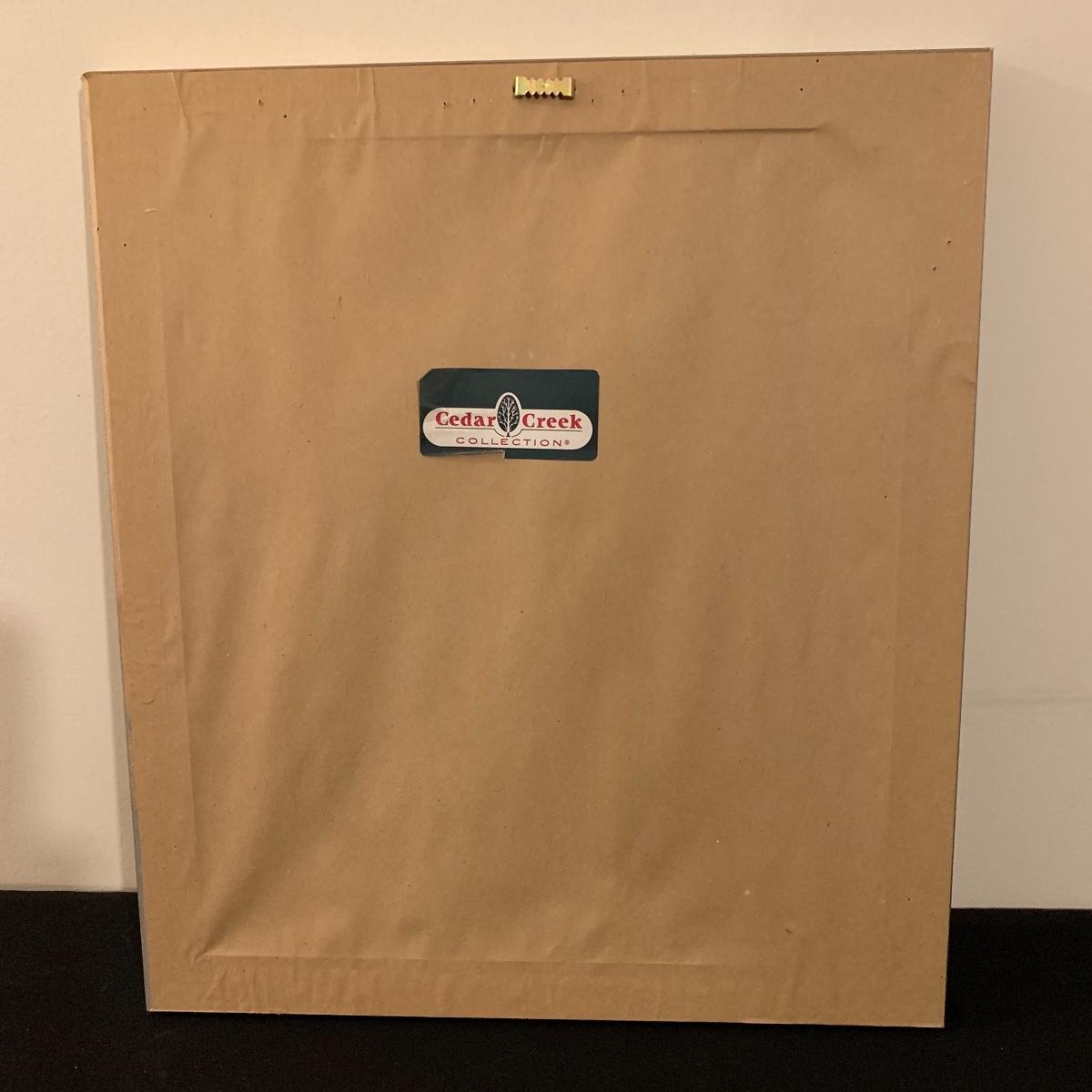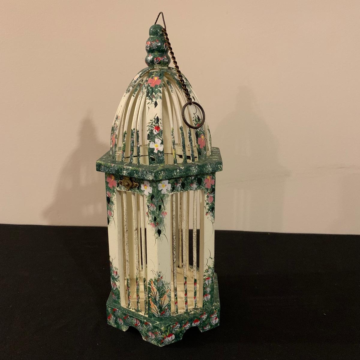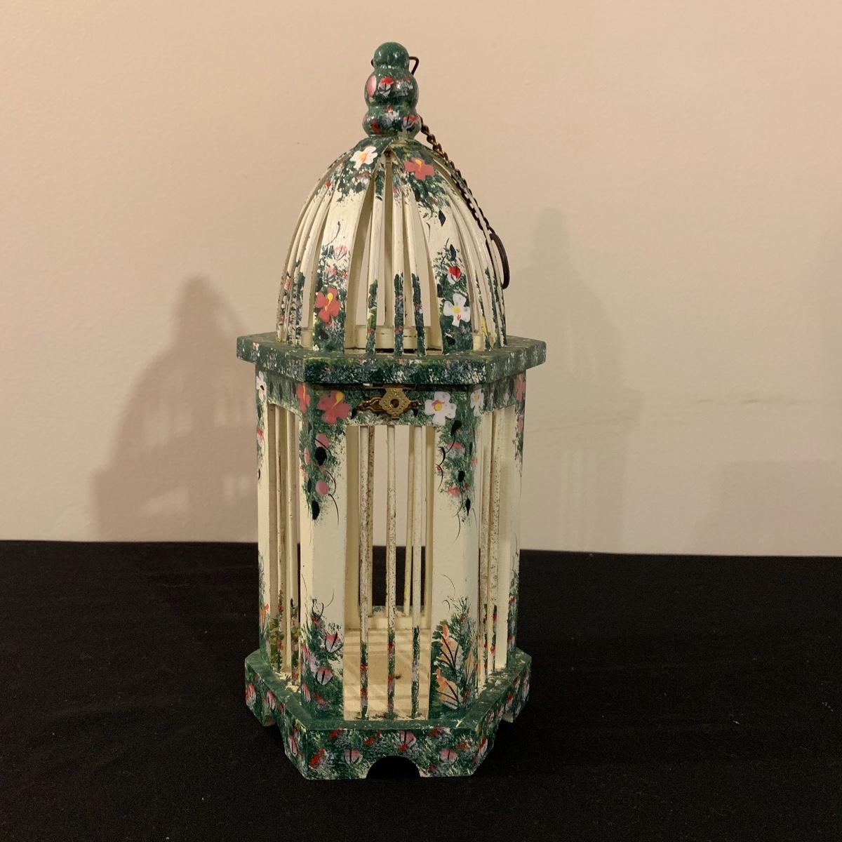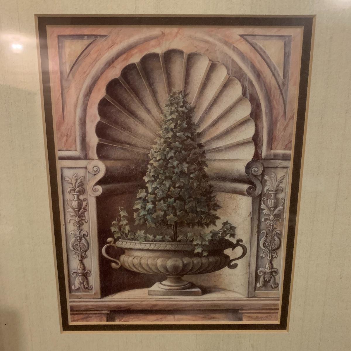This lot includes various garden themed art and decor. There are two wooden hanging pieces and a watering can-shaped item with hand painted flowers, as well as a small topiary (18” tall). Also included is a battery powered lantern. Additionally, there is a framed print of topiary artwork. The frame is ornate and metallic and is in good condition. There is hardware attached to the back for hanging with a nail. Shipping Available