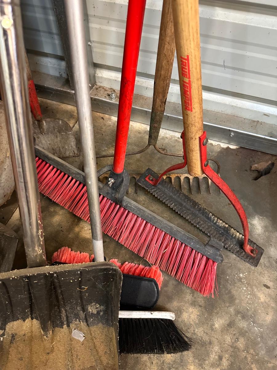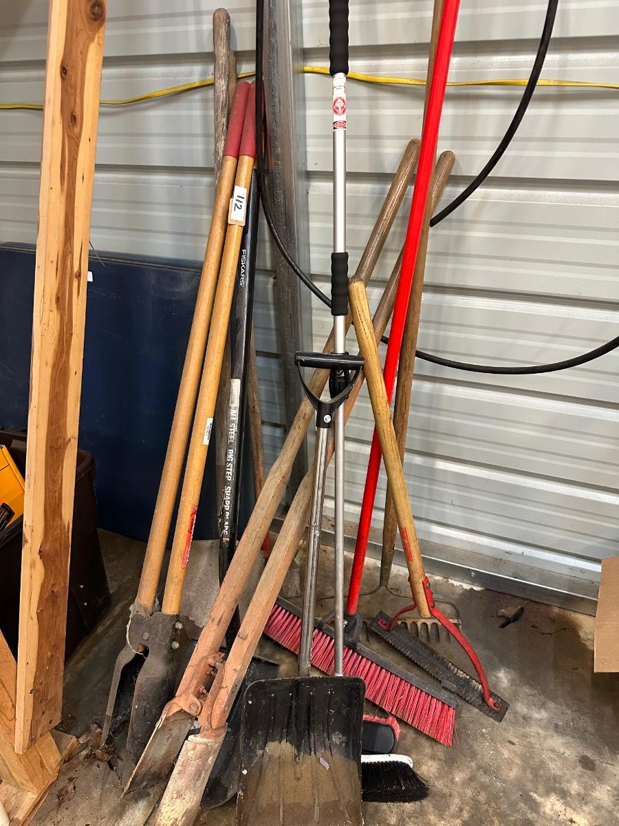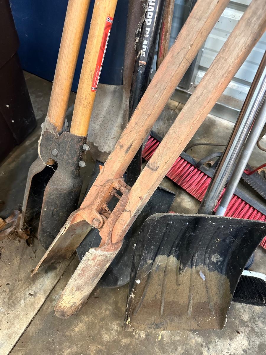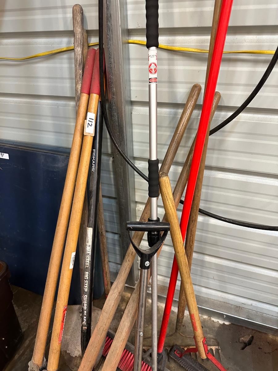 GARDEN TOOL LOT, POST HOLE DIGGERS, SHOVEL, BROOMS, RAKES AS PICTURED
