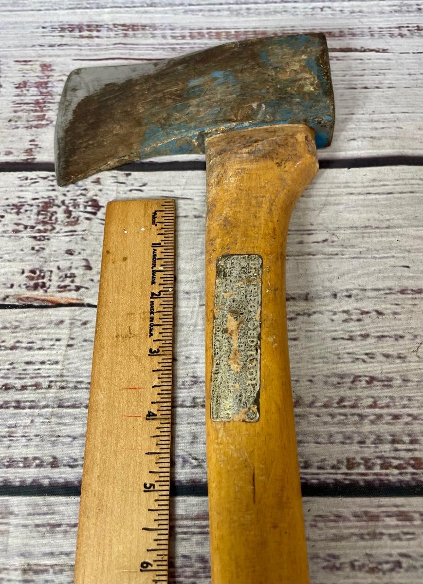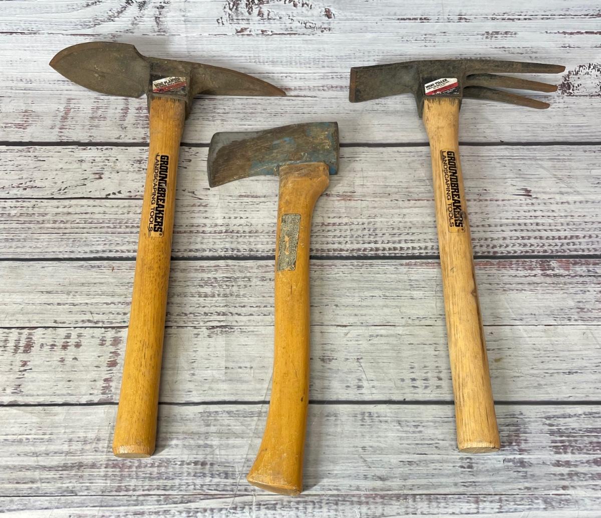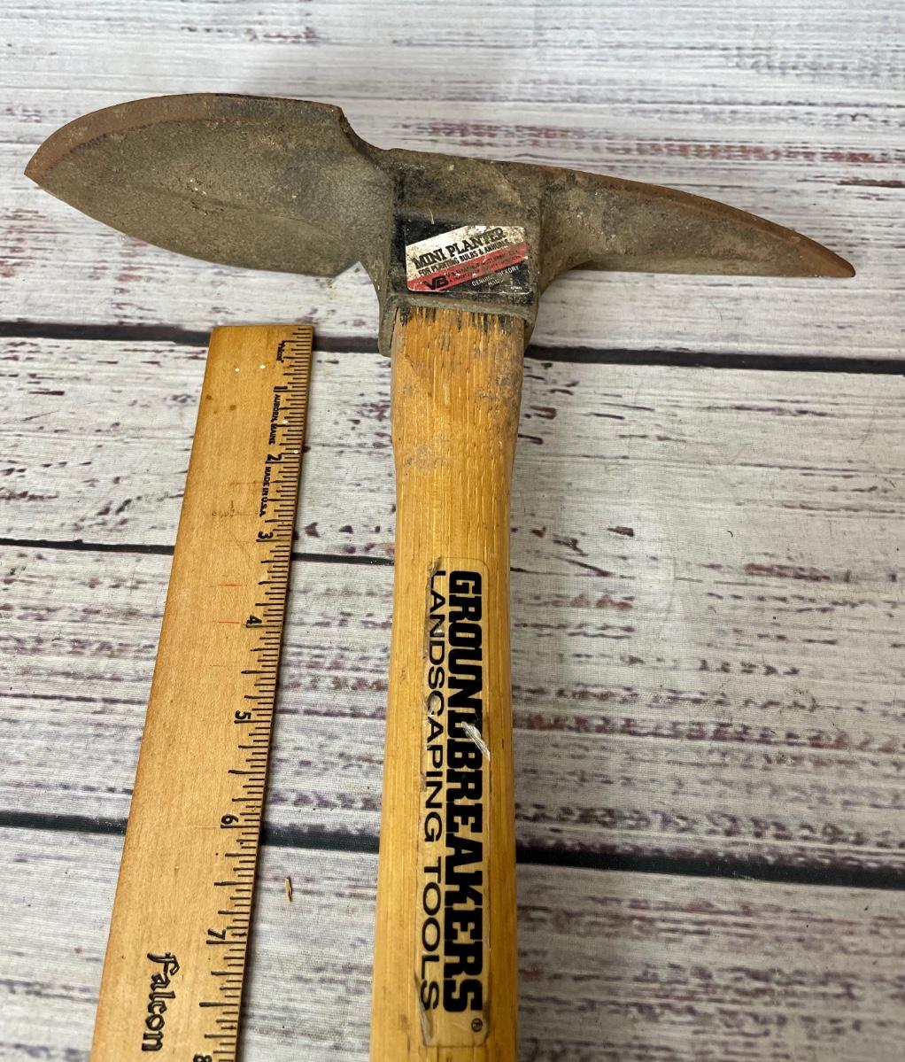 Garden tool lot. Mini Tiller, Mini Planter (both approx 16” long) and Hand Axe, approx 15” long.