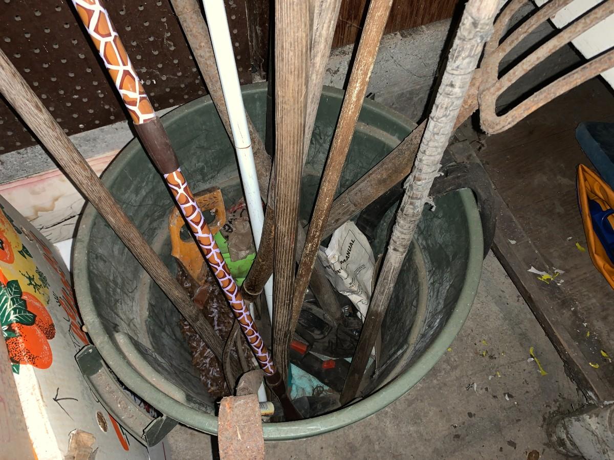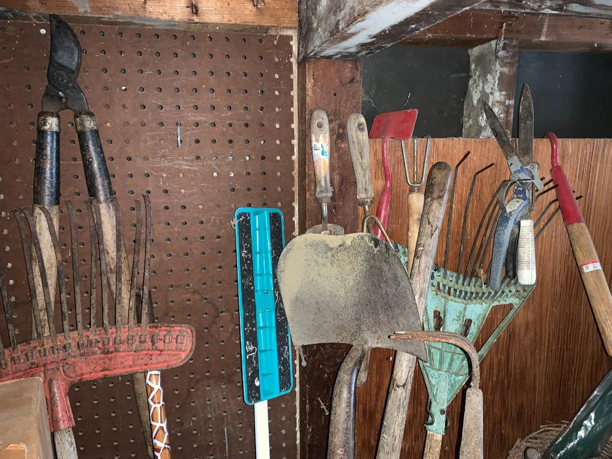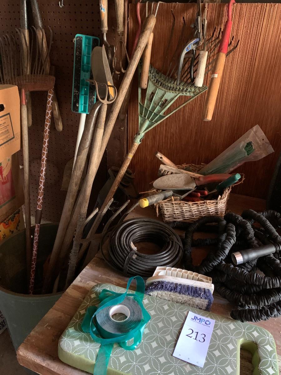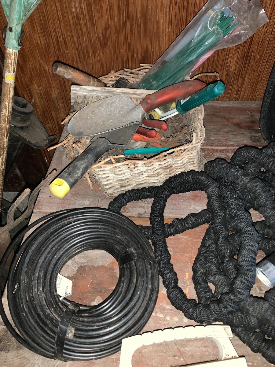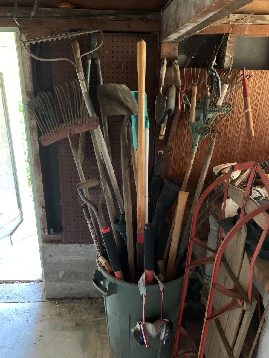 Long handled tools and plastic garbage can. Short handled tools. Expanding hose, 1/4" tubing and more as shown. Does not include sled in last photo.