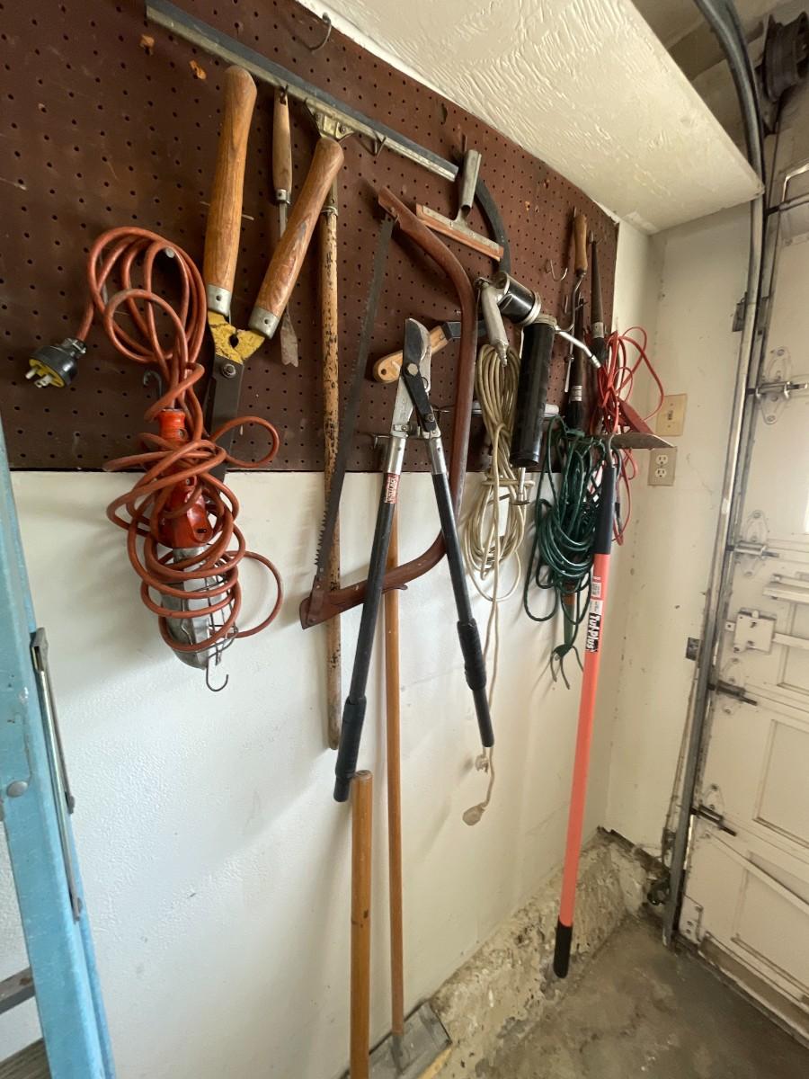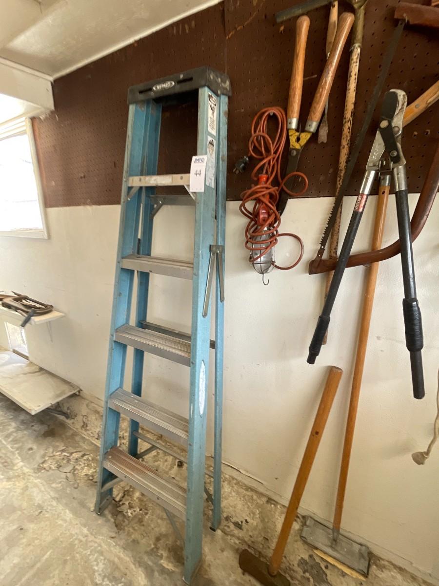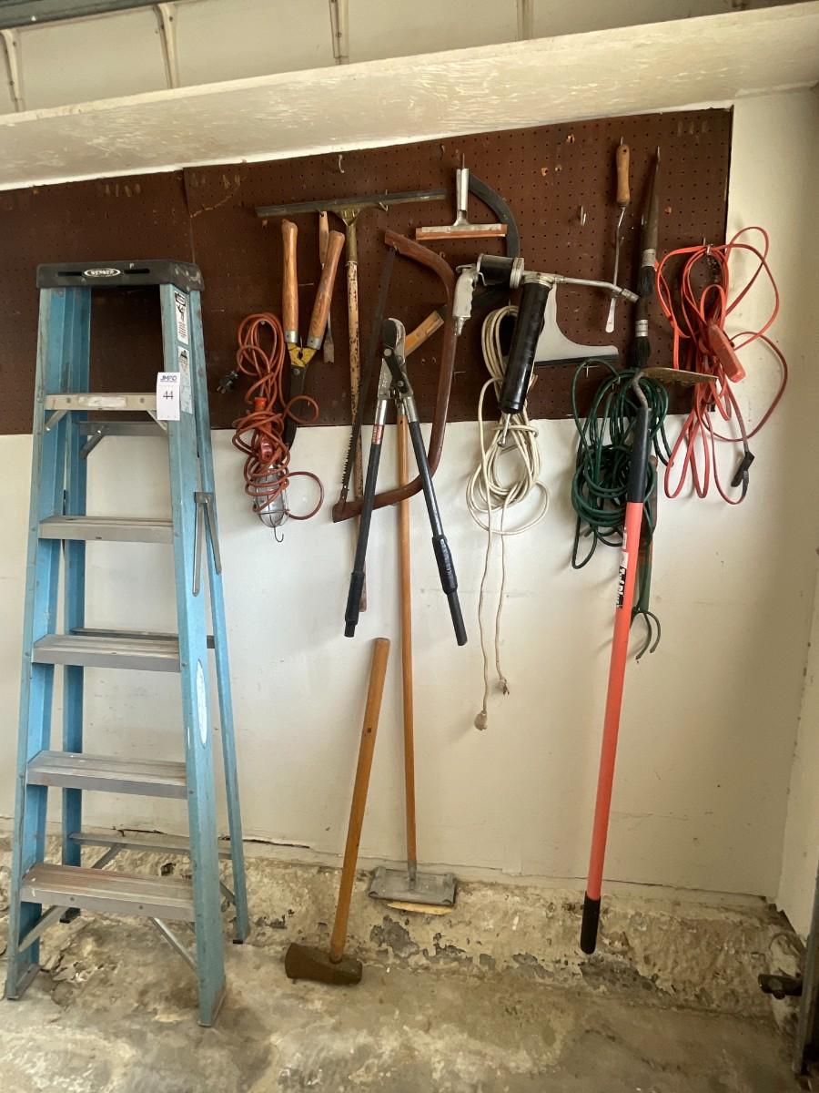 Hedge clipper, bypass lopper, hoe, bow saw, fiberglass 6 ft. step ladder and more.
