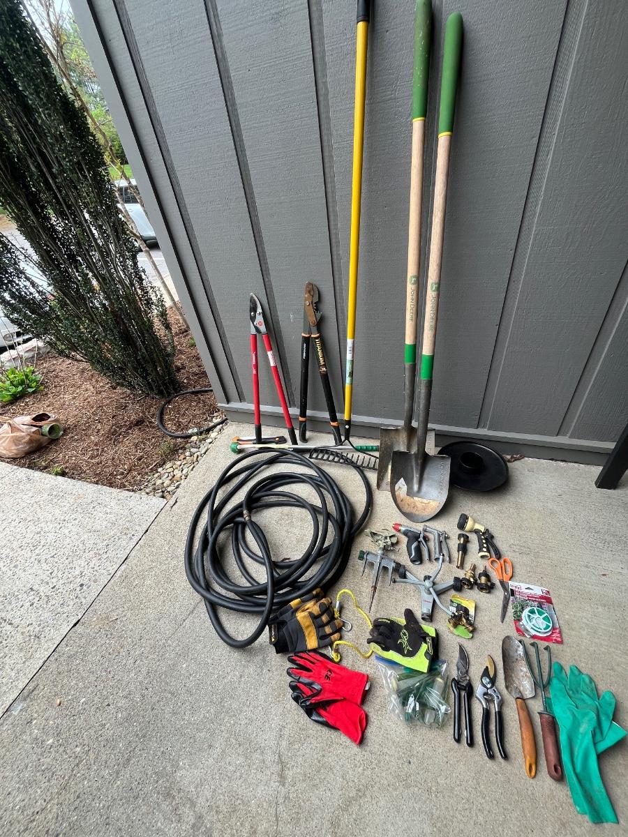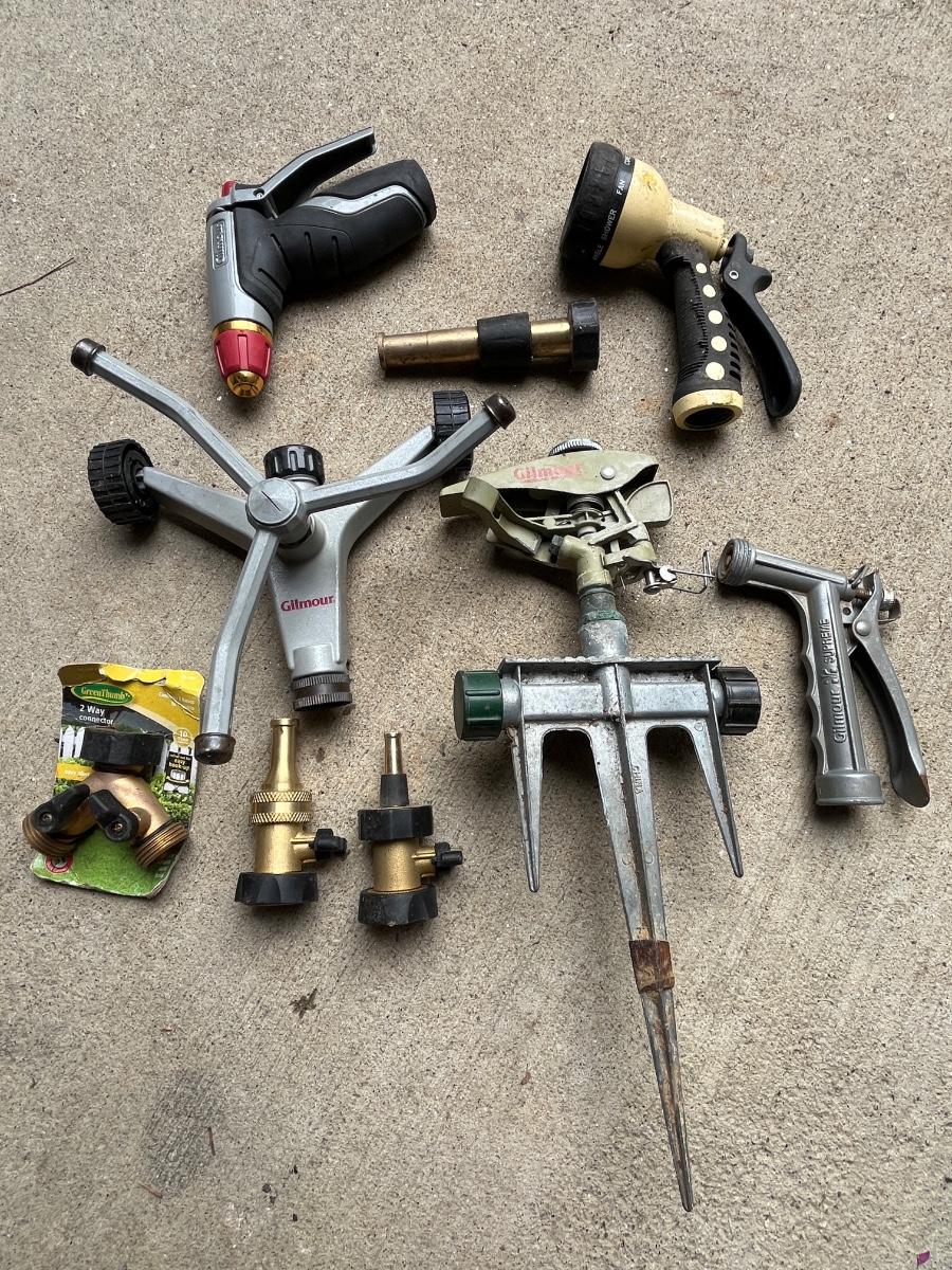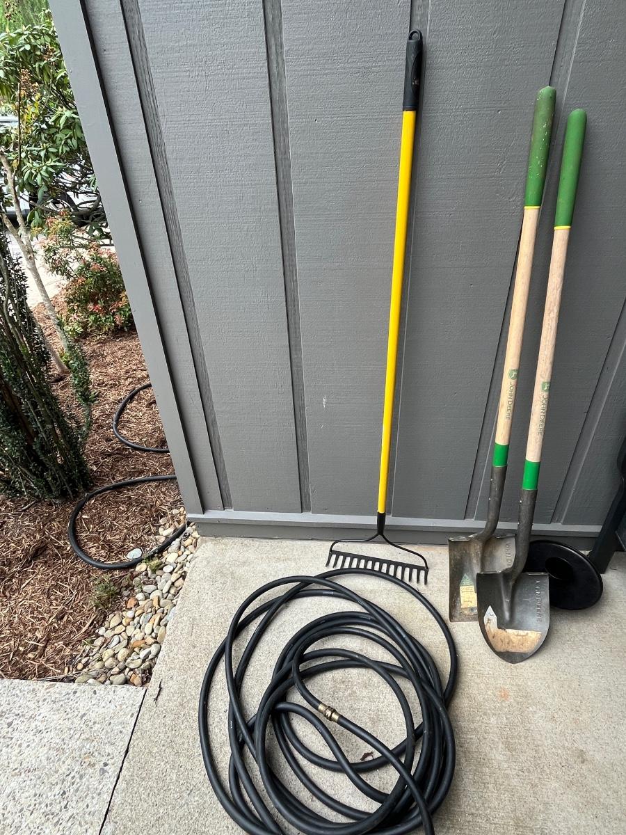 Lot includes Fiskars & Corona loppers, hose, John Deere shovels, two Gilmour sprinklers, brass hose nozzles, gloves, Fiskars and unbranded hand pruners and more. Please see photos for inventory.