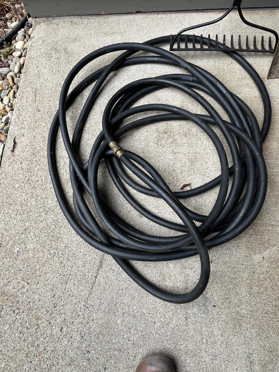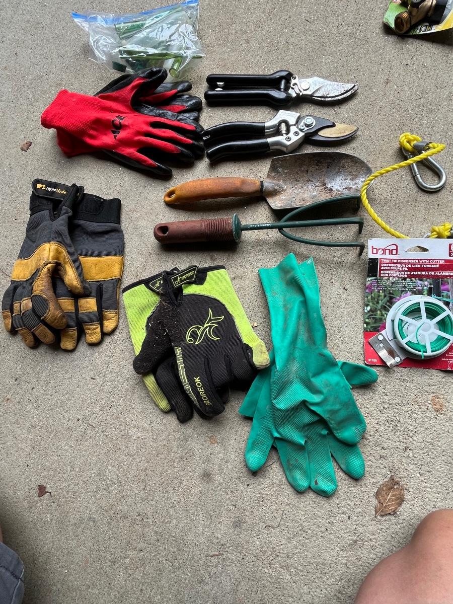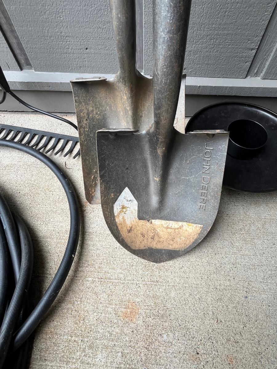 Lot includes Fiskars & Corona loppers, hose, John Deere shovels, two Gilmour sprinklers, brass hose nozzles, gloves, Fiskars and unbranded hand pruners and more. Please see photos for inventory.