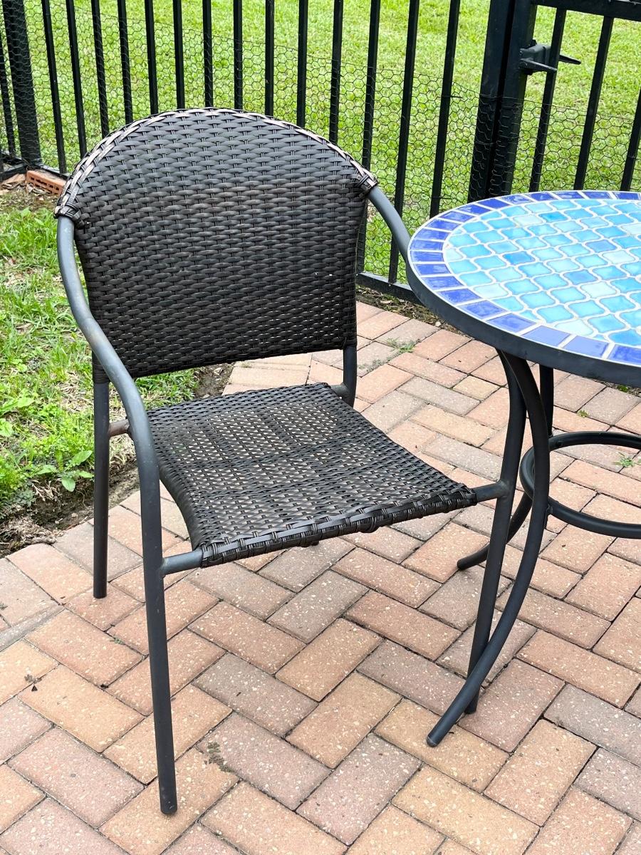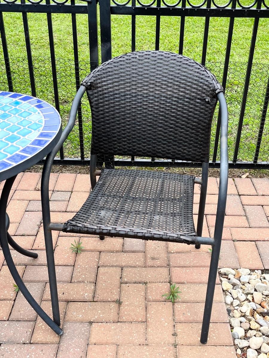 Chairs have minor surface rust & wicker is showing wear ~ Table = 29” H x 28” Round ~ (2) Chairs = 33.5” H x 22” W x 18” D ~ Seat = 17” H