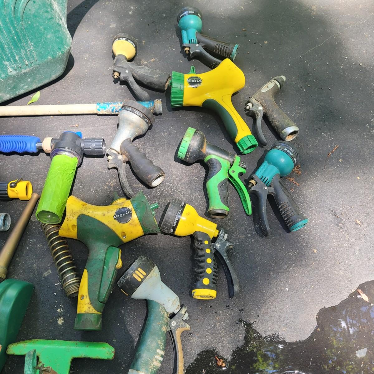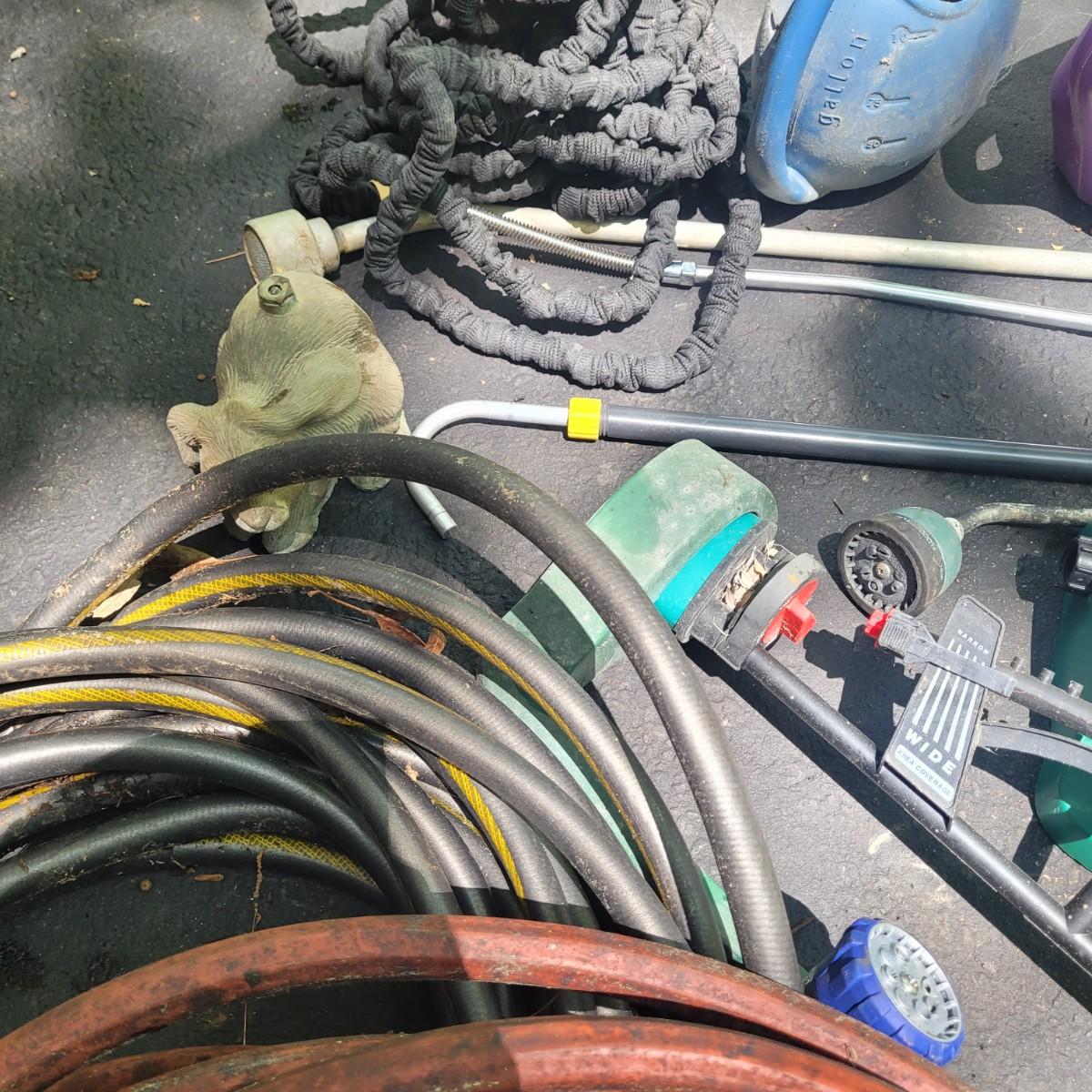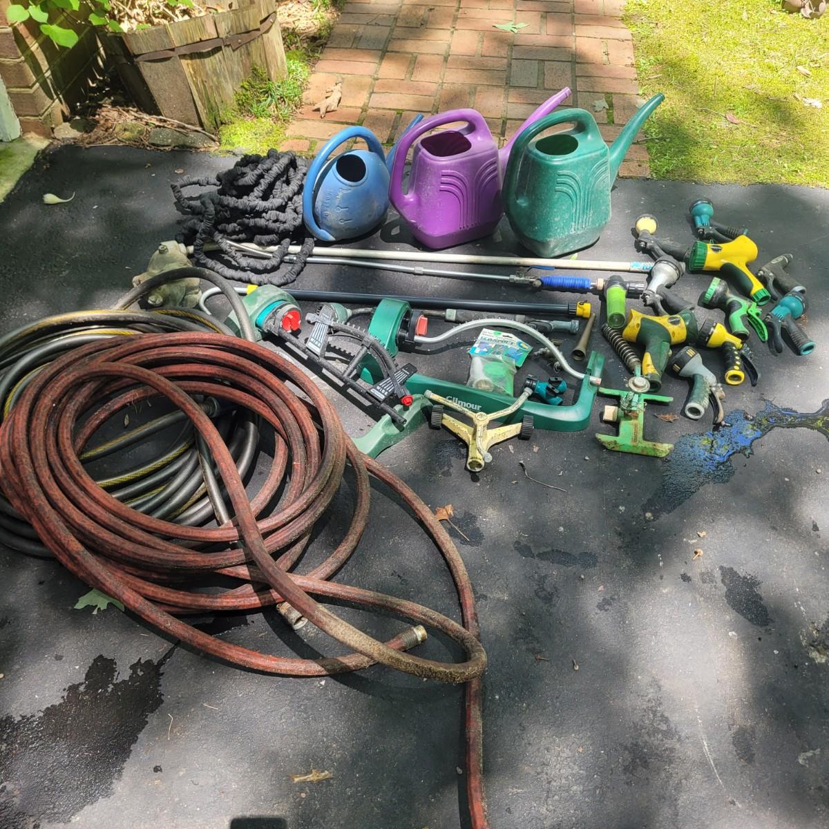 This lot includes a variety of watering tools. Items included are three watering cans, two hoses, five sprinklers, an expandable hose, and more than ten sprayer heads. Some sprayer heads are the extended and flexible type. See photos for individual items.
