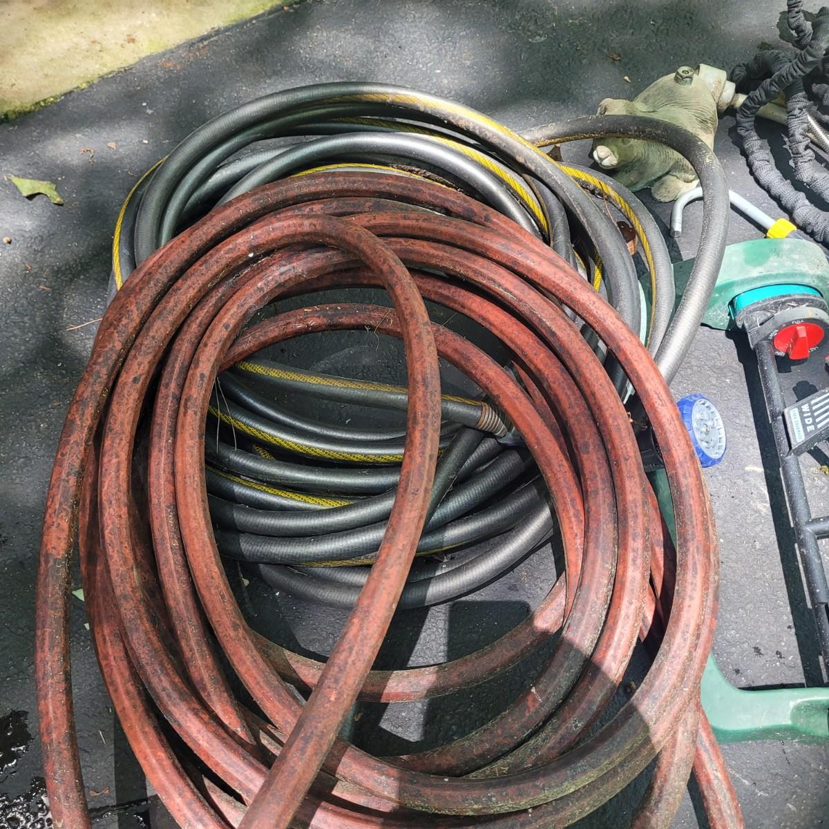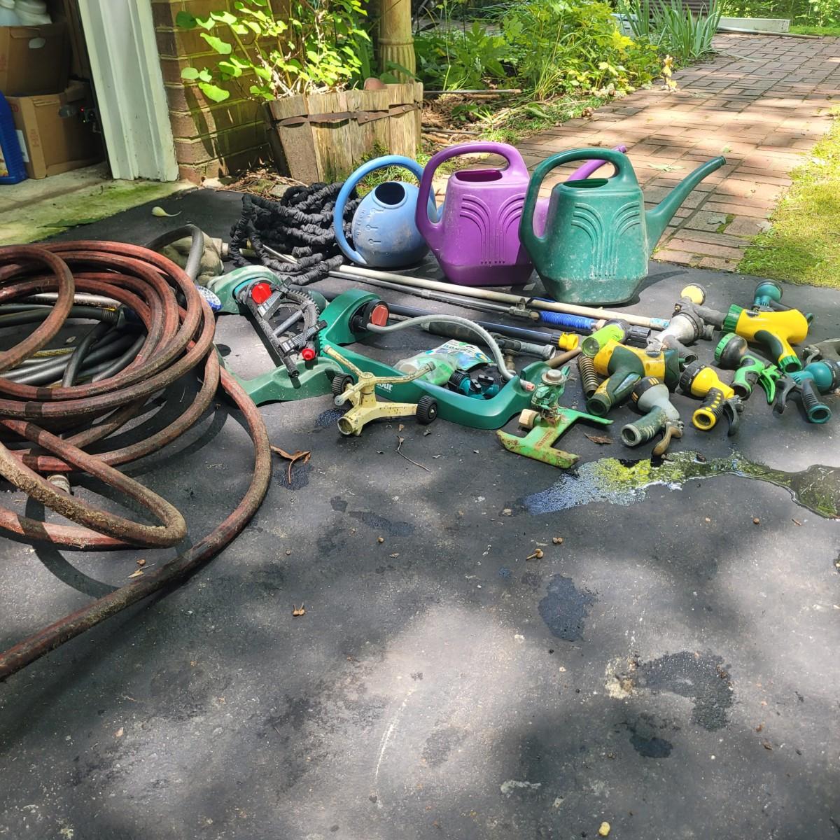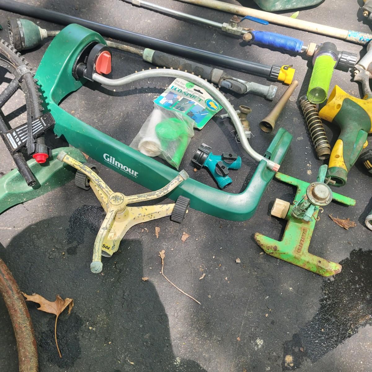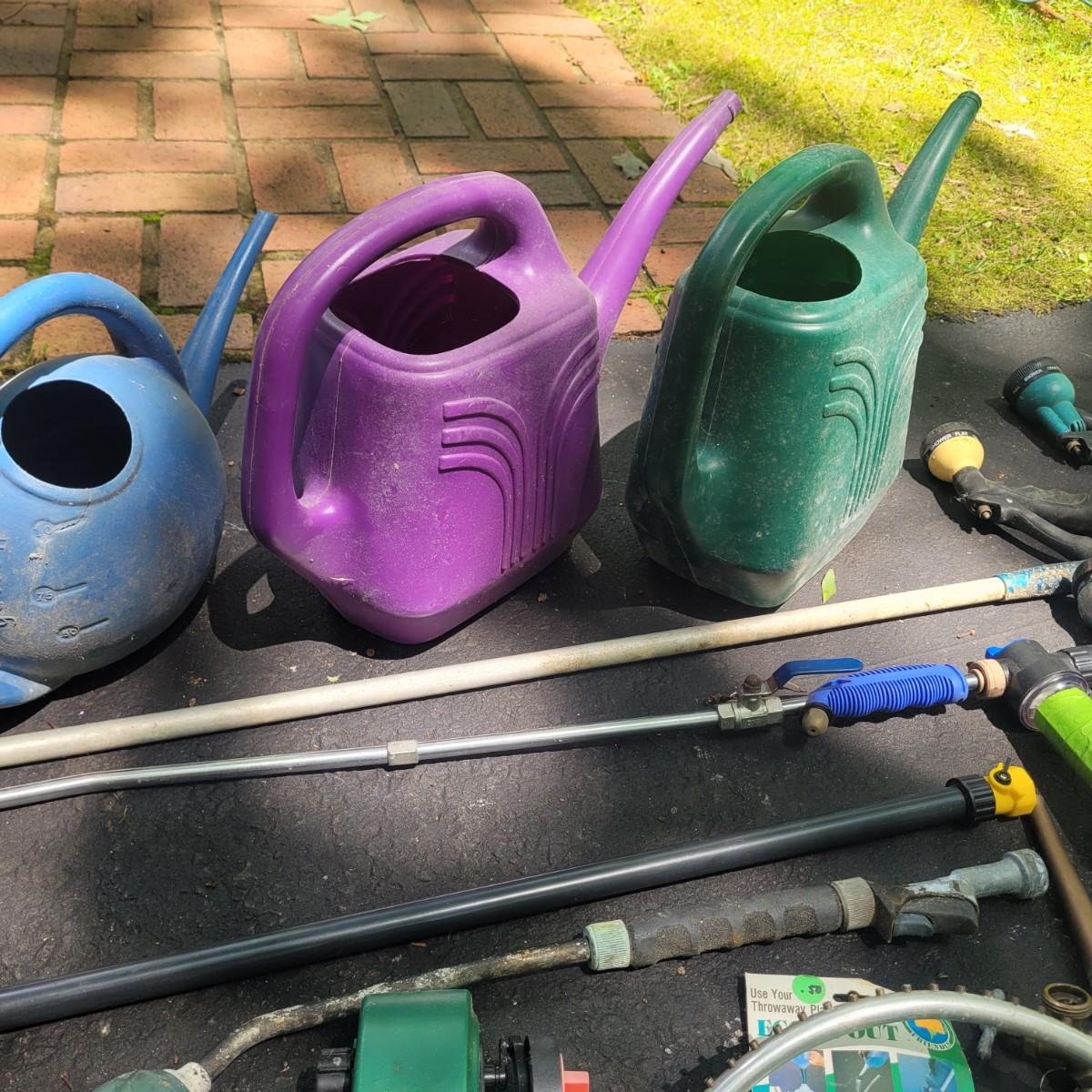 This lot includes a variety of watering tools. Items included are three watering cans, two hoses, five sprinklers, an expandable hose, and more than ten sprayer heads. Some sprayer heads are the extended and flexible type. See photos for individual items.
