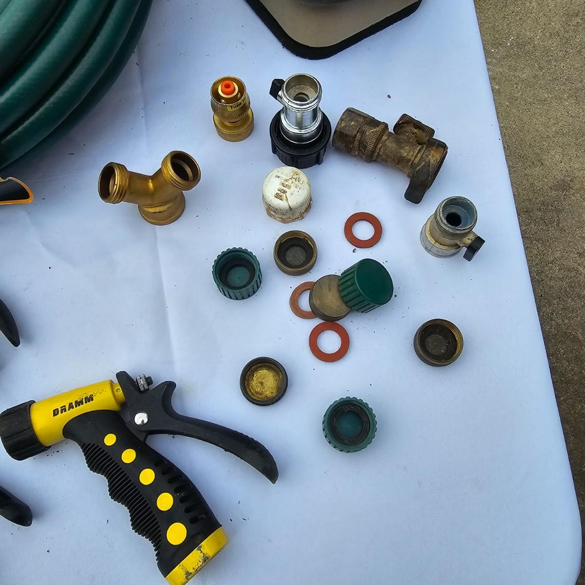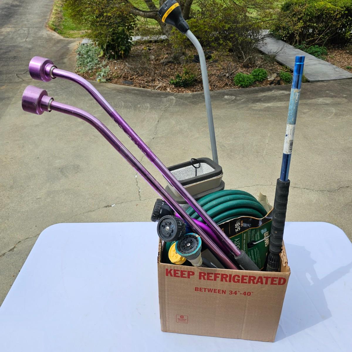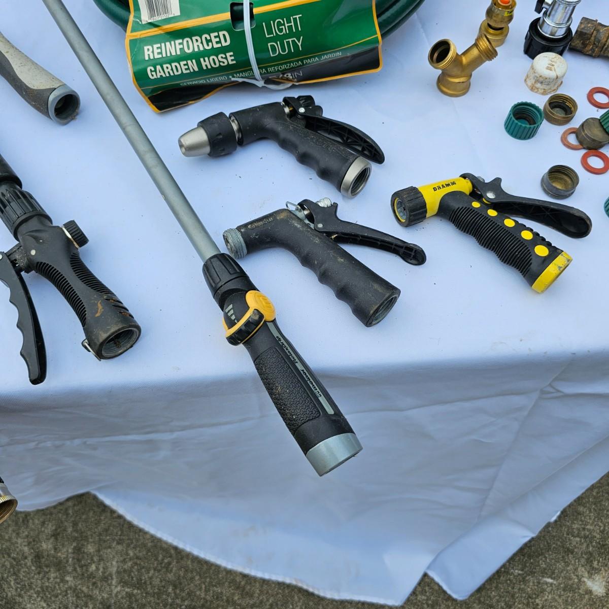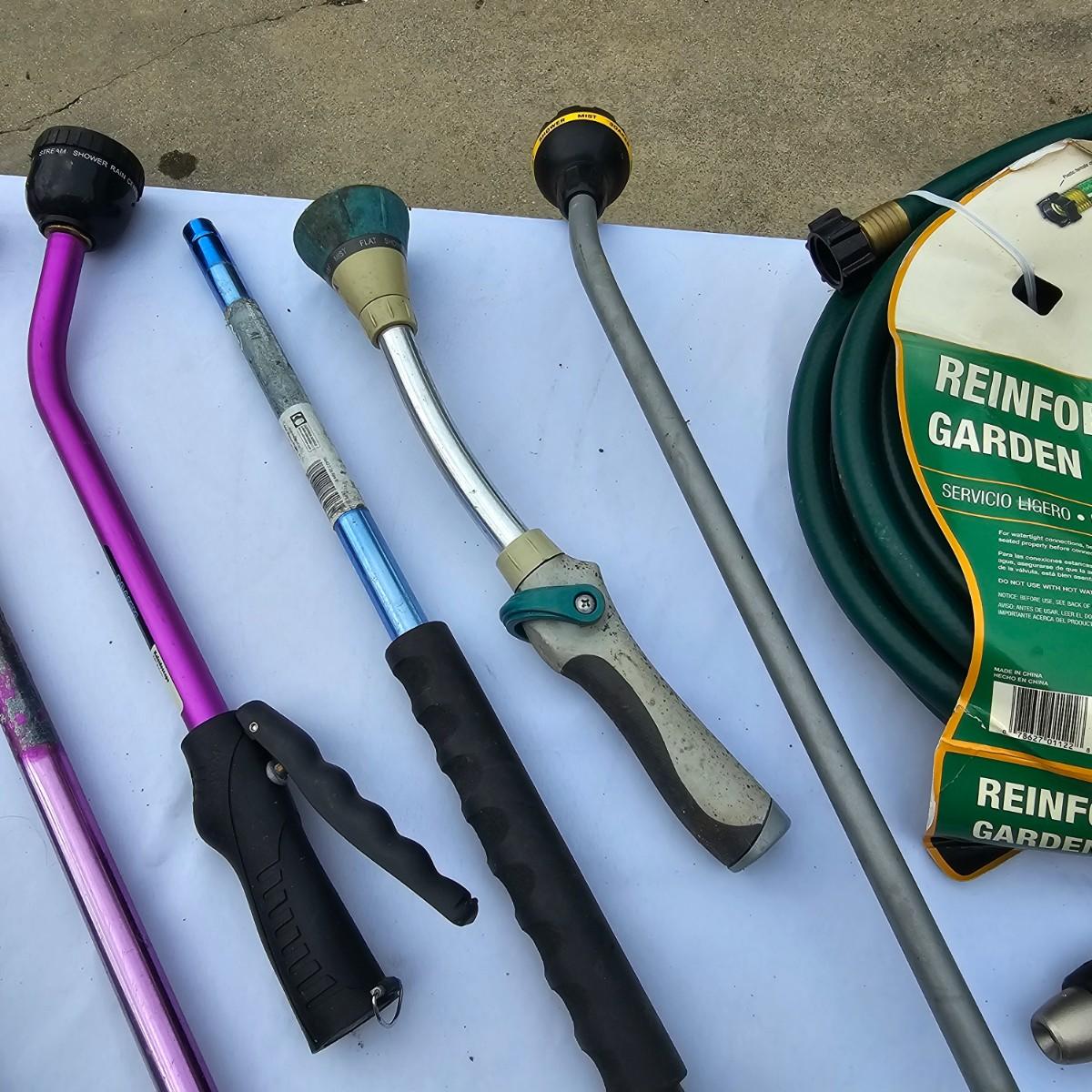 Hand watering items for the garden including regular spray nozzles and extension wands. One 5/8" 50' coil of hose, miscellaneous pieces for connecting and three hose bib covers for winter use. Wands measure from 14" to 32". See photos for details. Shipping available.