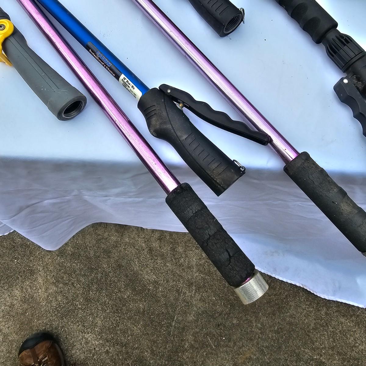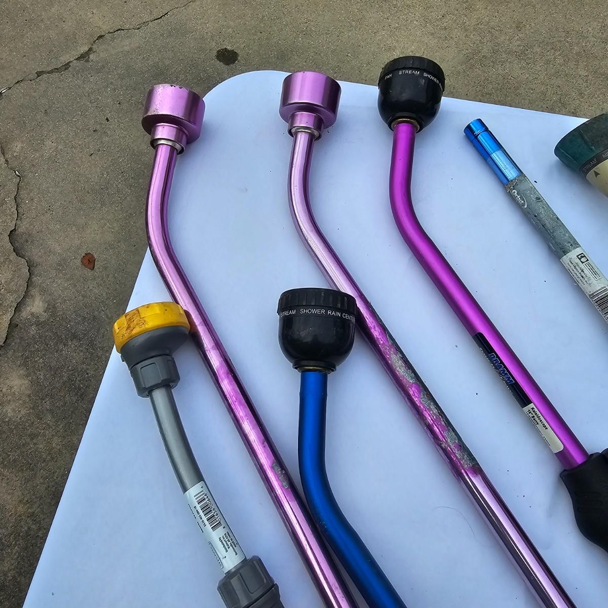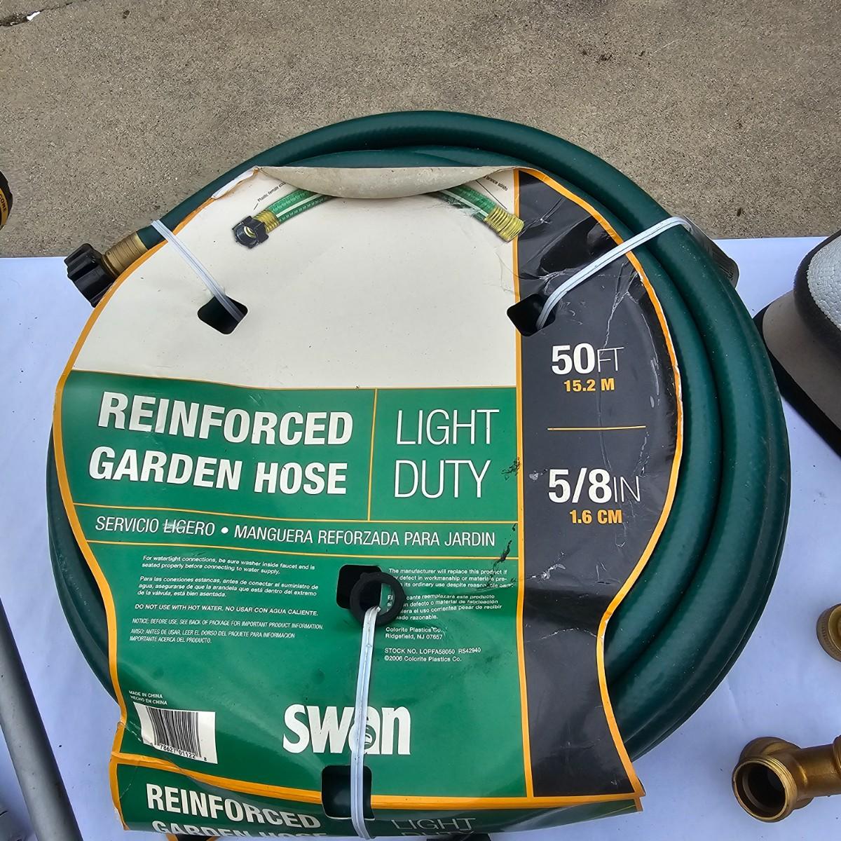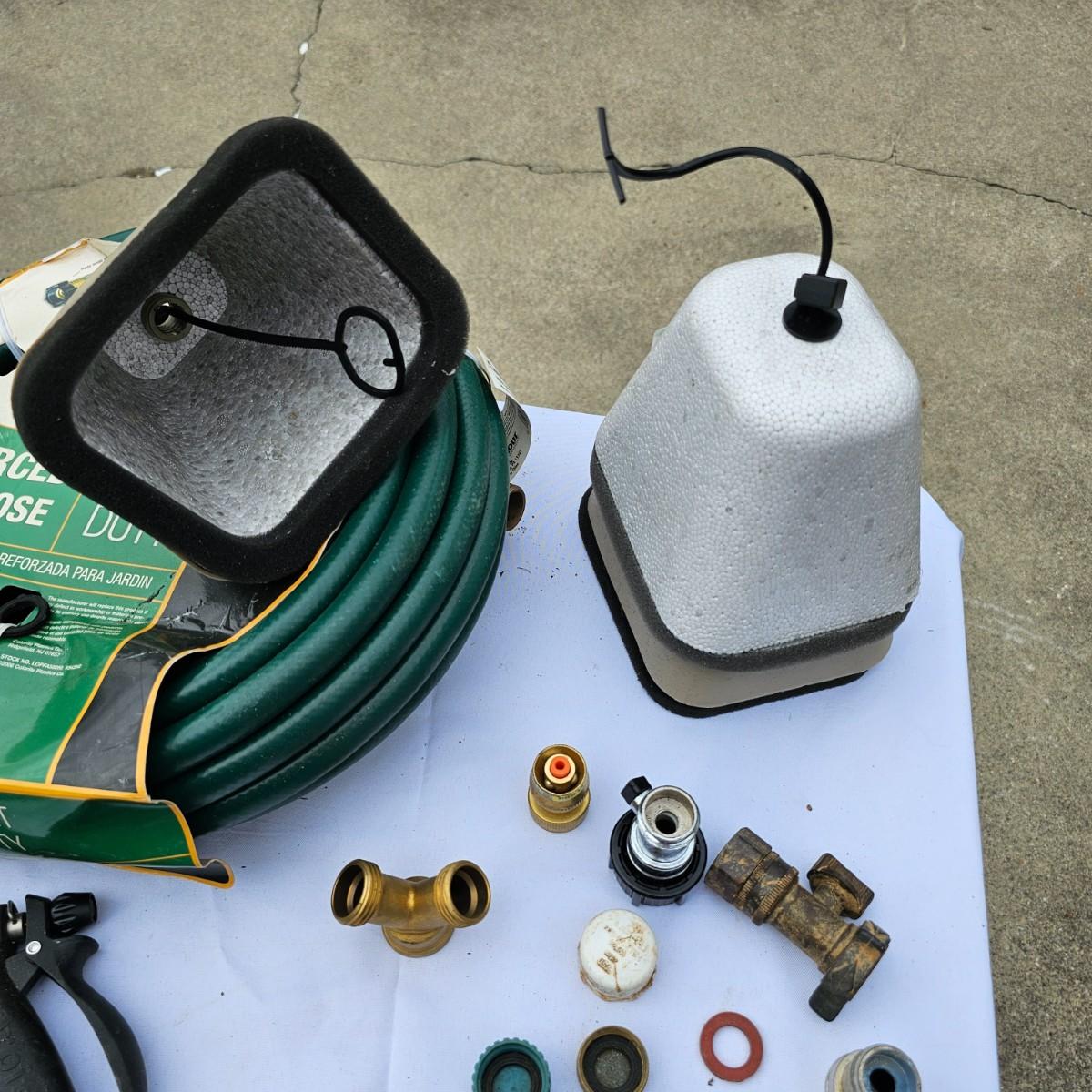 Hand watering items for the garden including regular spray nozzles and extension wands. One 5/8" 50' coil of hose, miscellaneous pieces for connecting and three hose bib covers for winter use. Wands measure from 14" to 32". See photos for details. Shipping available.