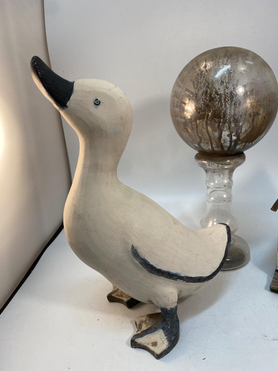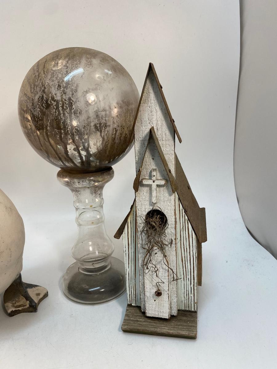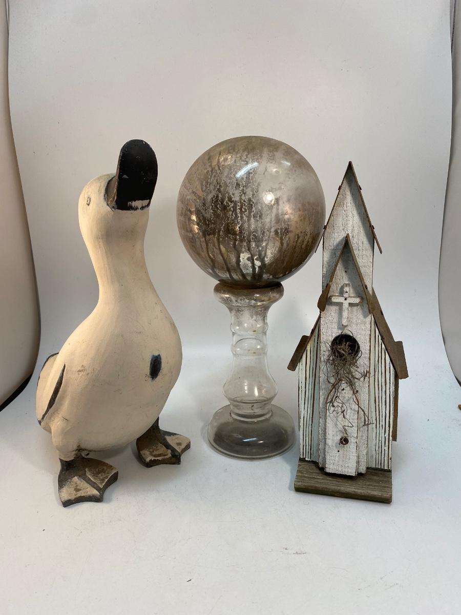 Garden Yard Art Lot - Wood Goose, Glass Orb Ball, Rustic Church Birdhouse. Everything in good, weathered condition.