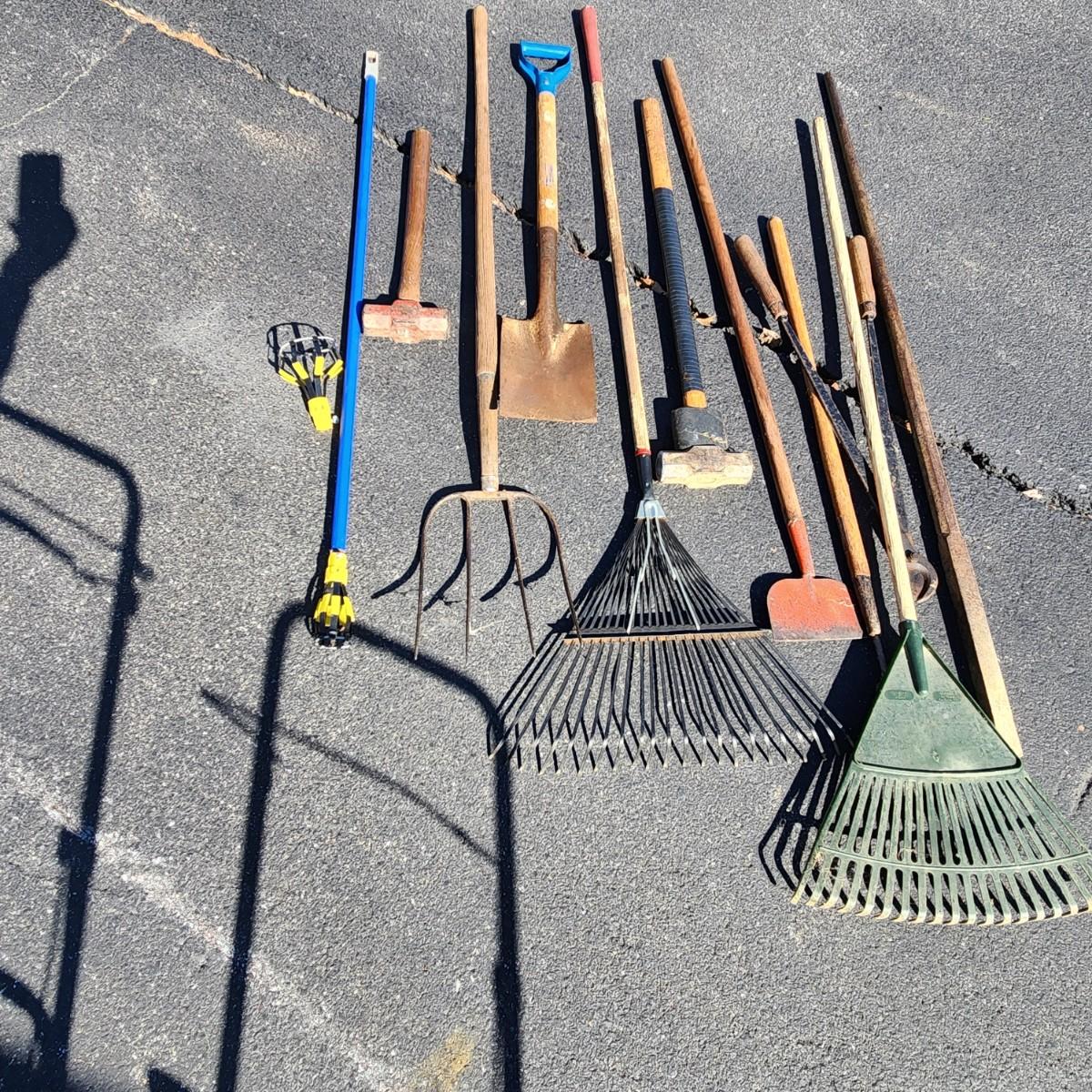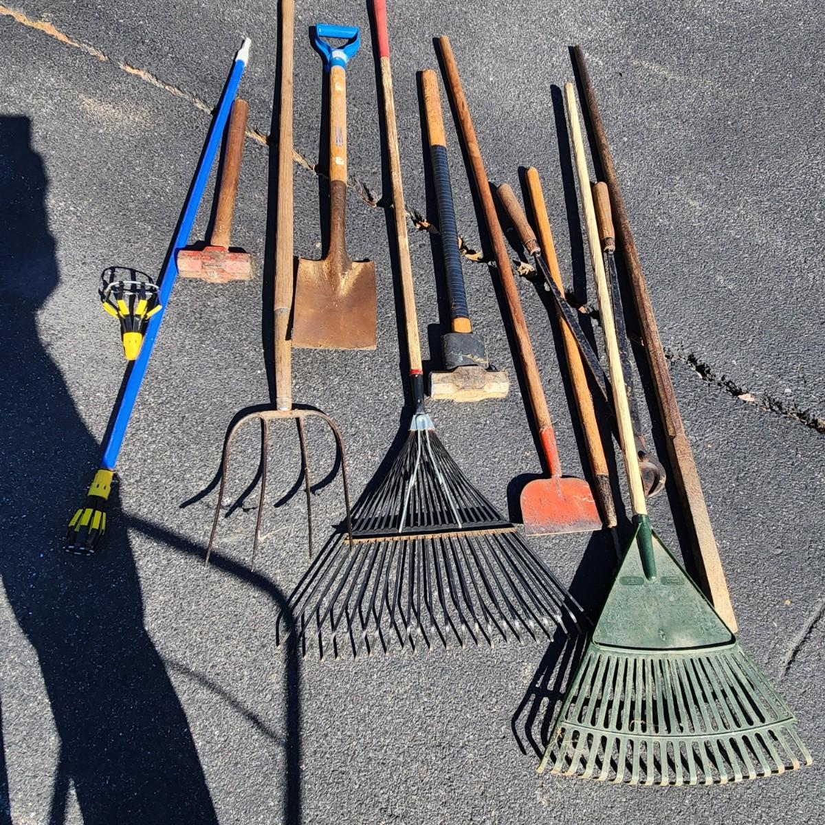 Garden Yard Tool Lot Rakes, Shovel, Forks, Light Changer ++