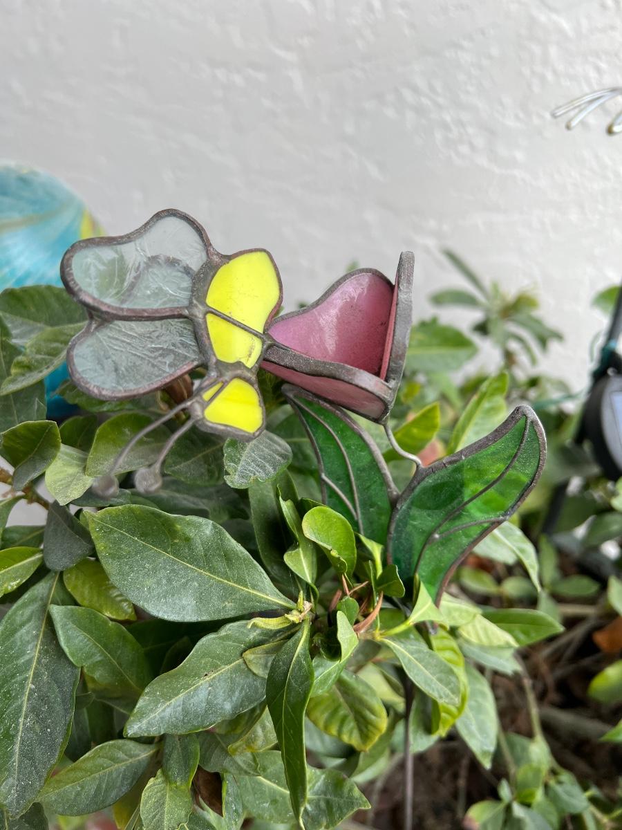 Large glazed ceramic pot with Gardenia plant decorative garden stakes