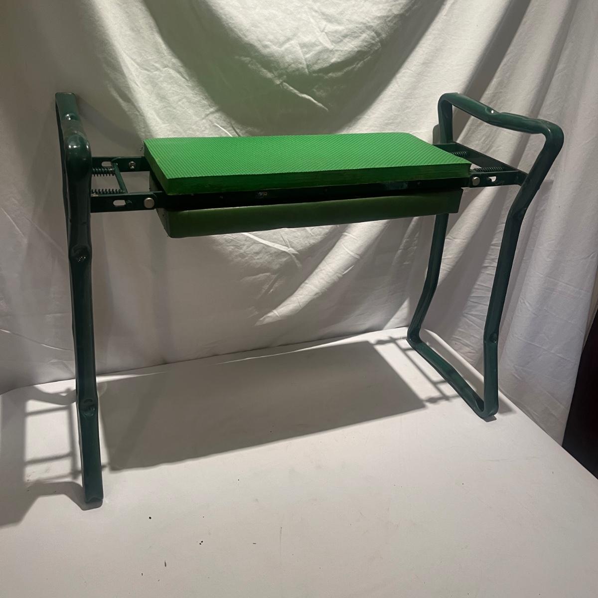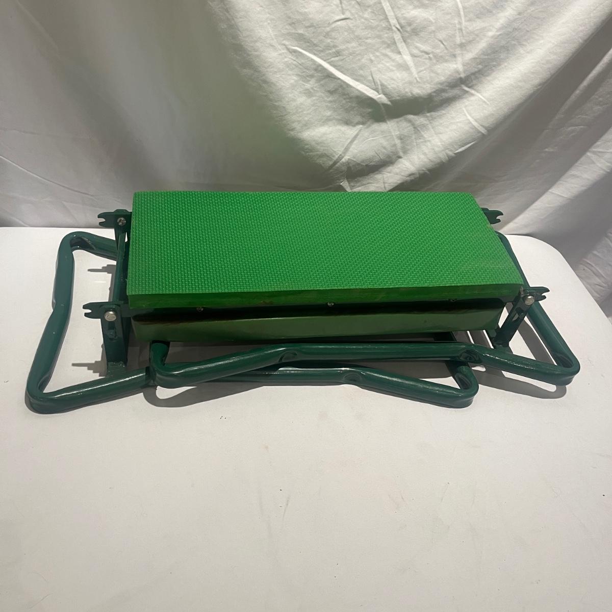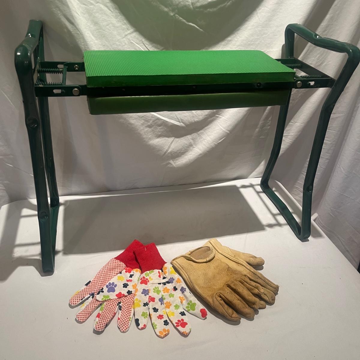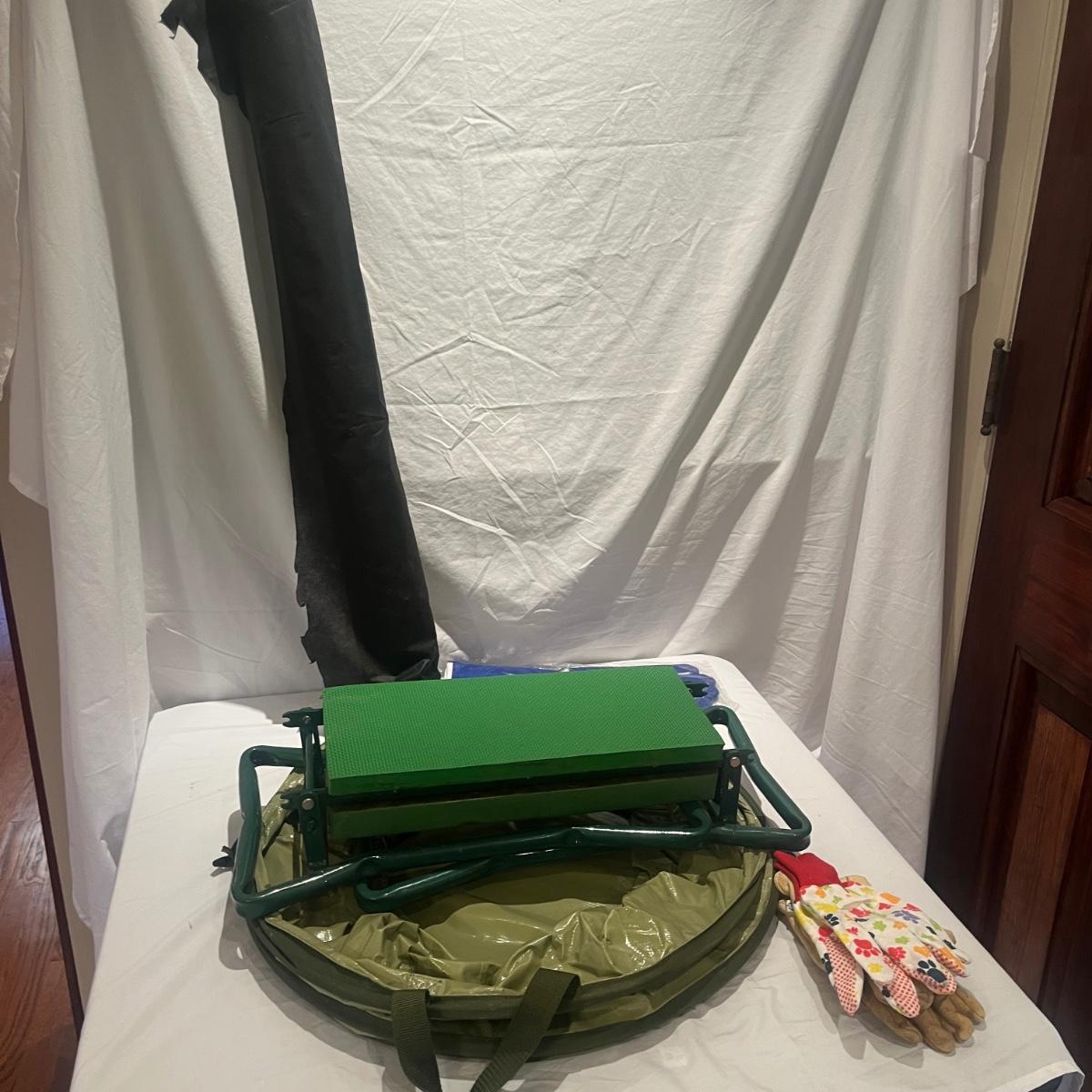 This gardening lot includes folding kneeler/seat, collapsible bin, three pairs of gloves and a partial roll of weed fabric.