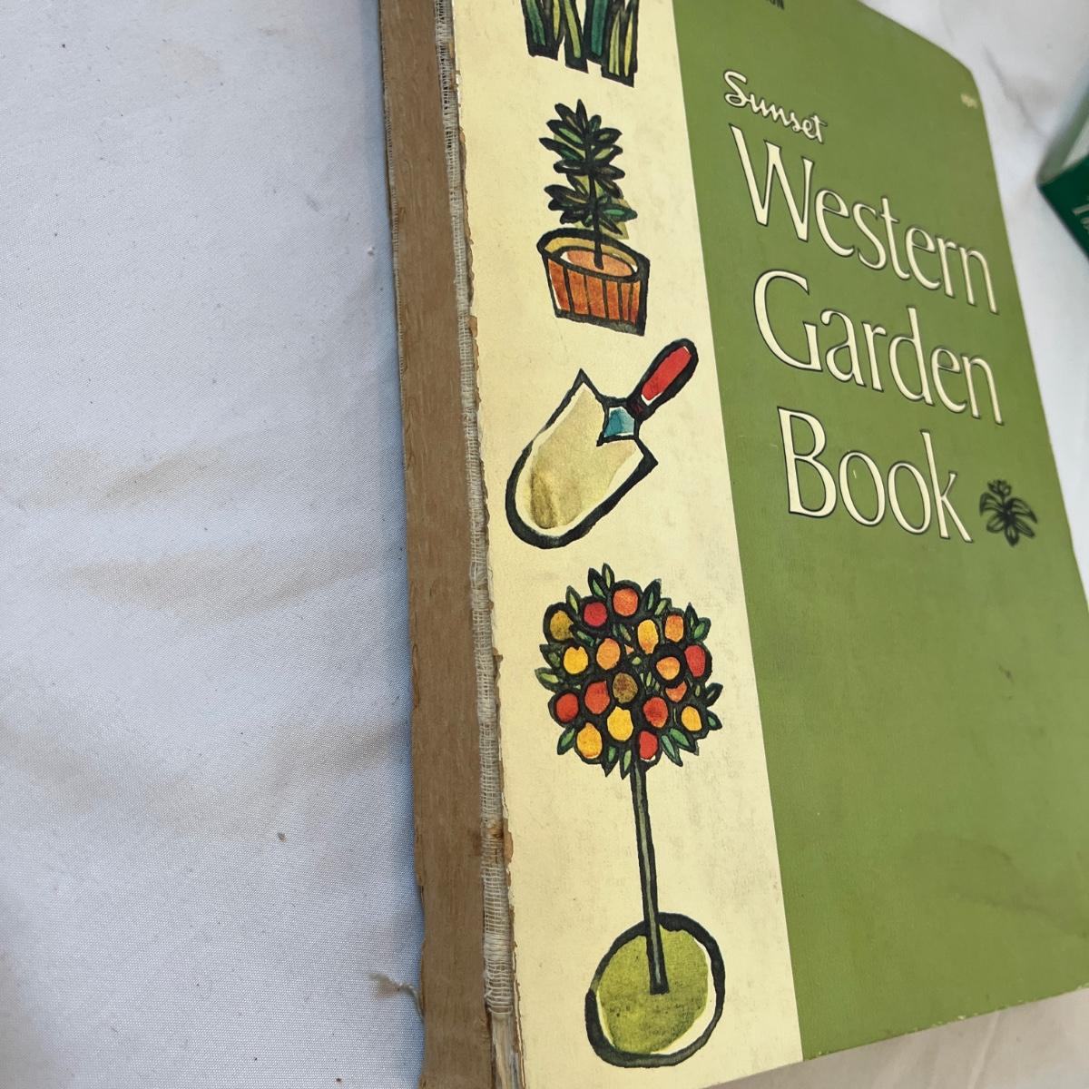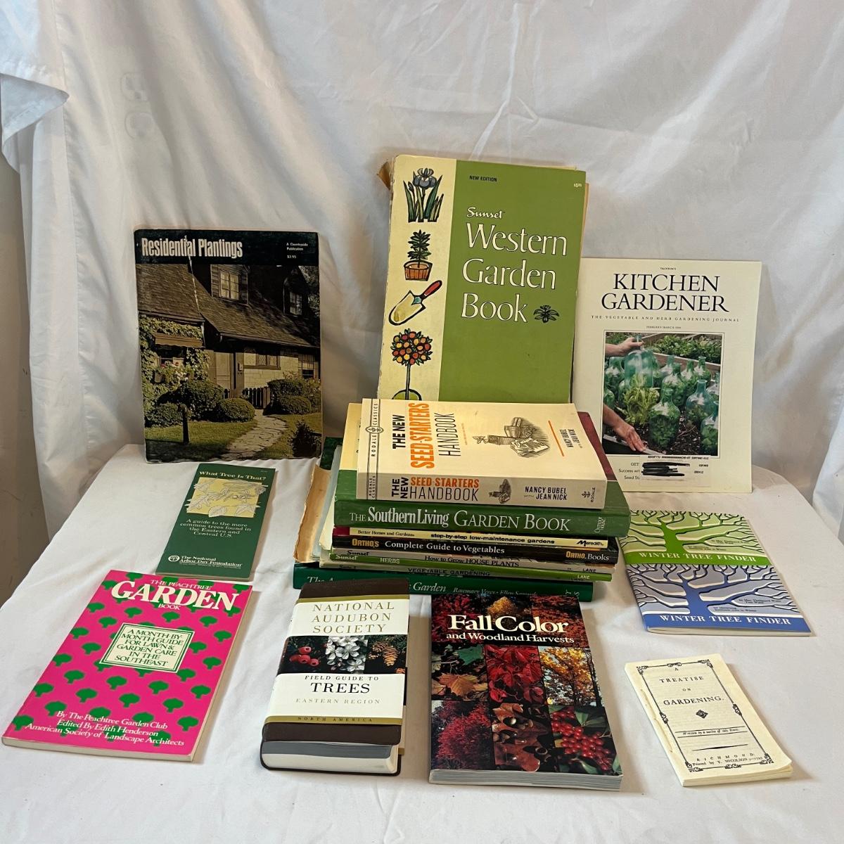 Lot contains over 12 books and magazines on gardening including Western Garden Book, The American Woman’s Garden, Seed Starter Handbook, Southern Living Garden Book & More. The spine on Western Garden book is missing.