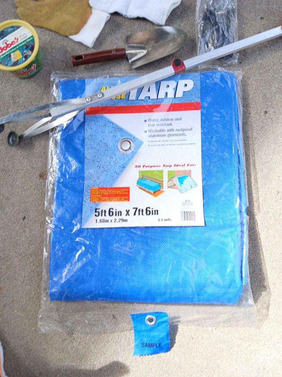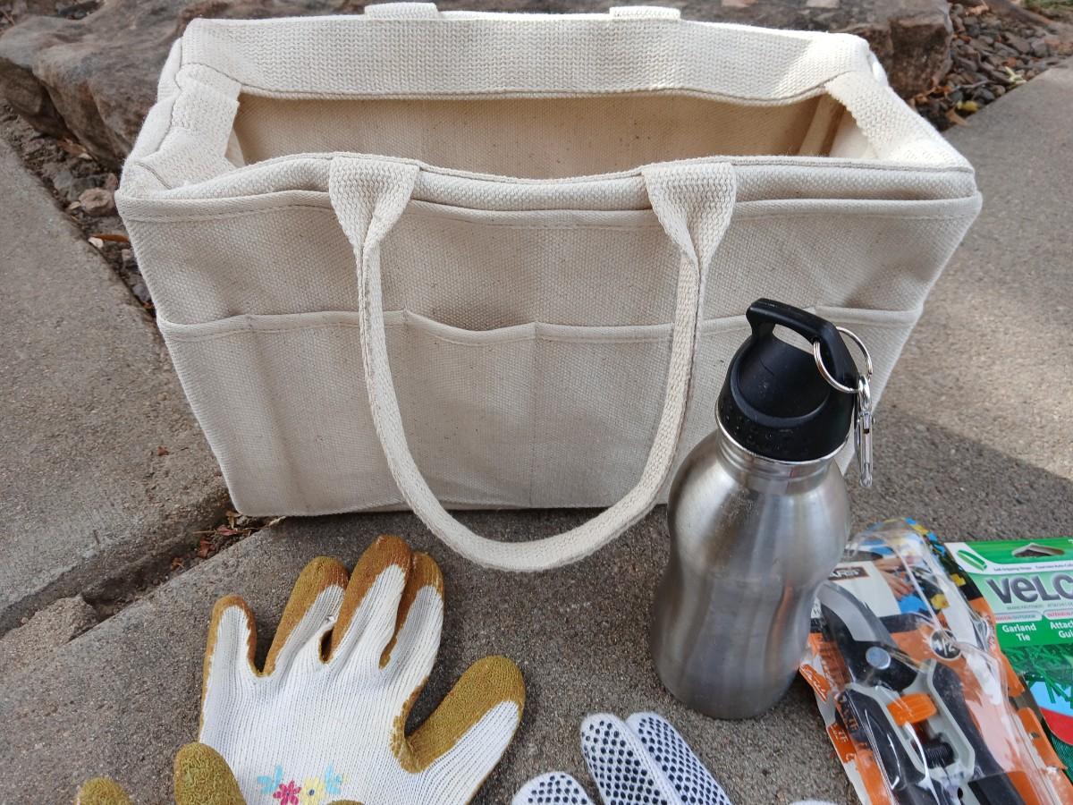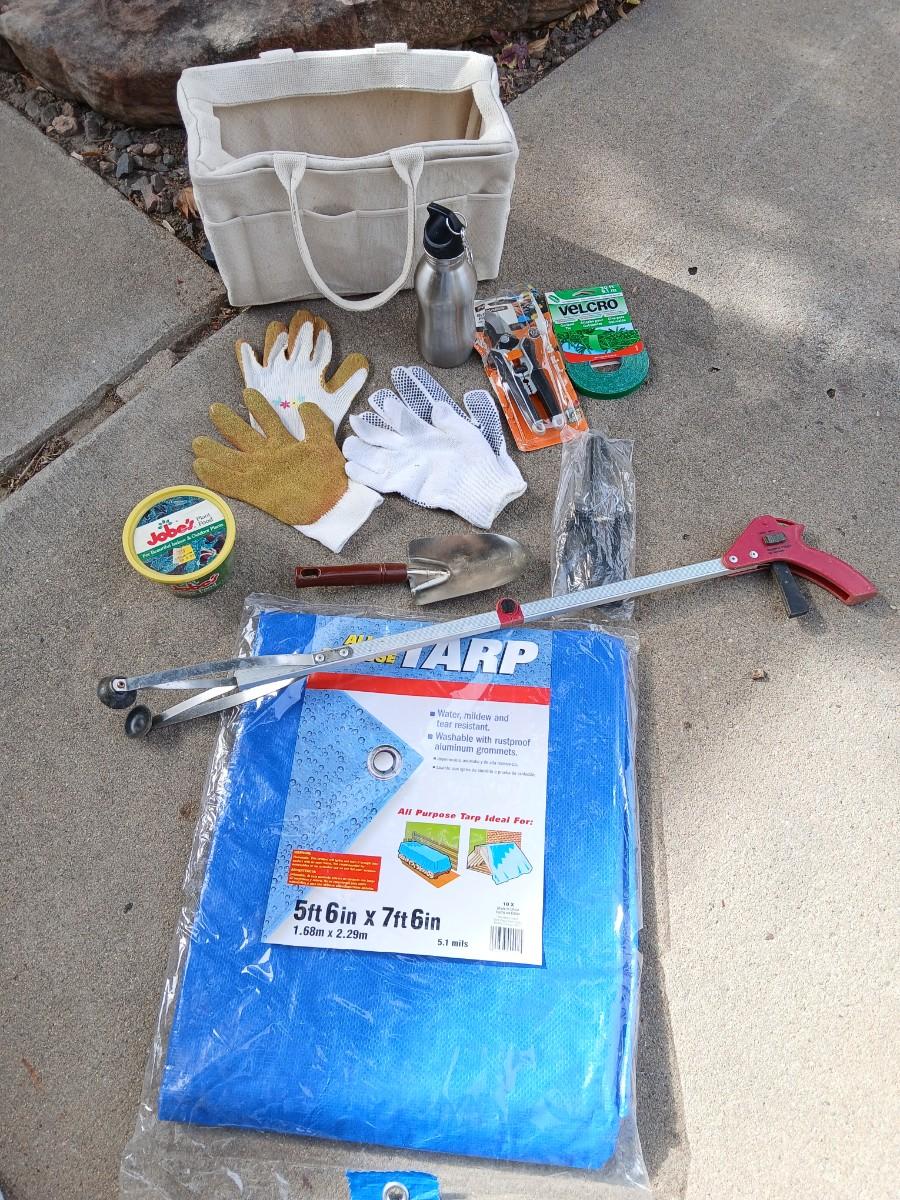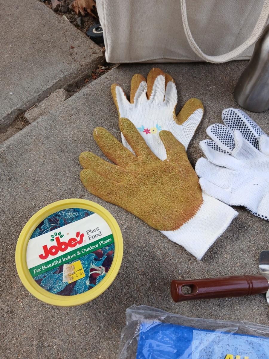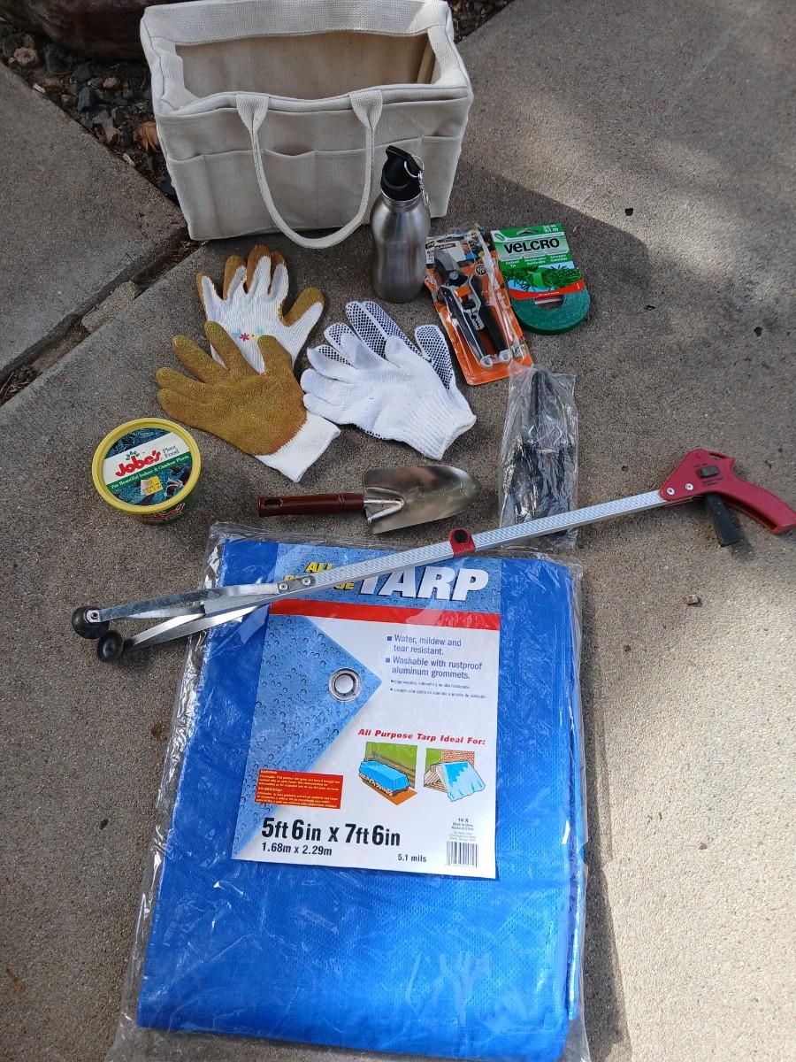Gardening hand tools, gloves, tarp with a canvas bag and more