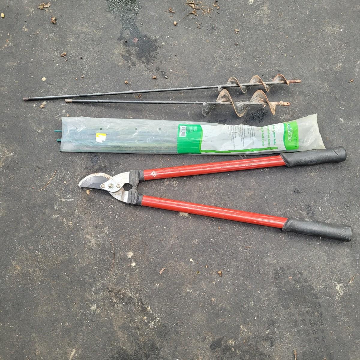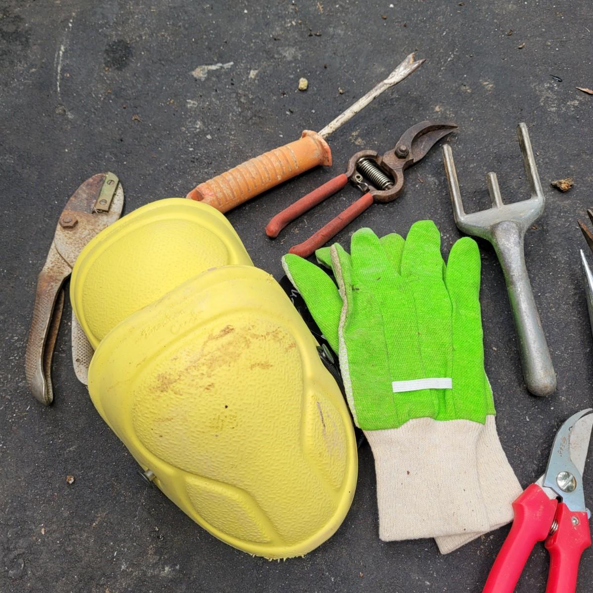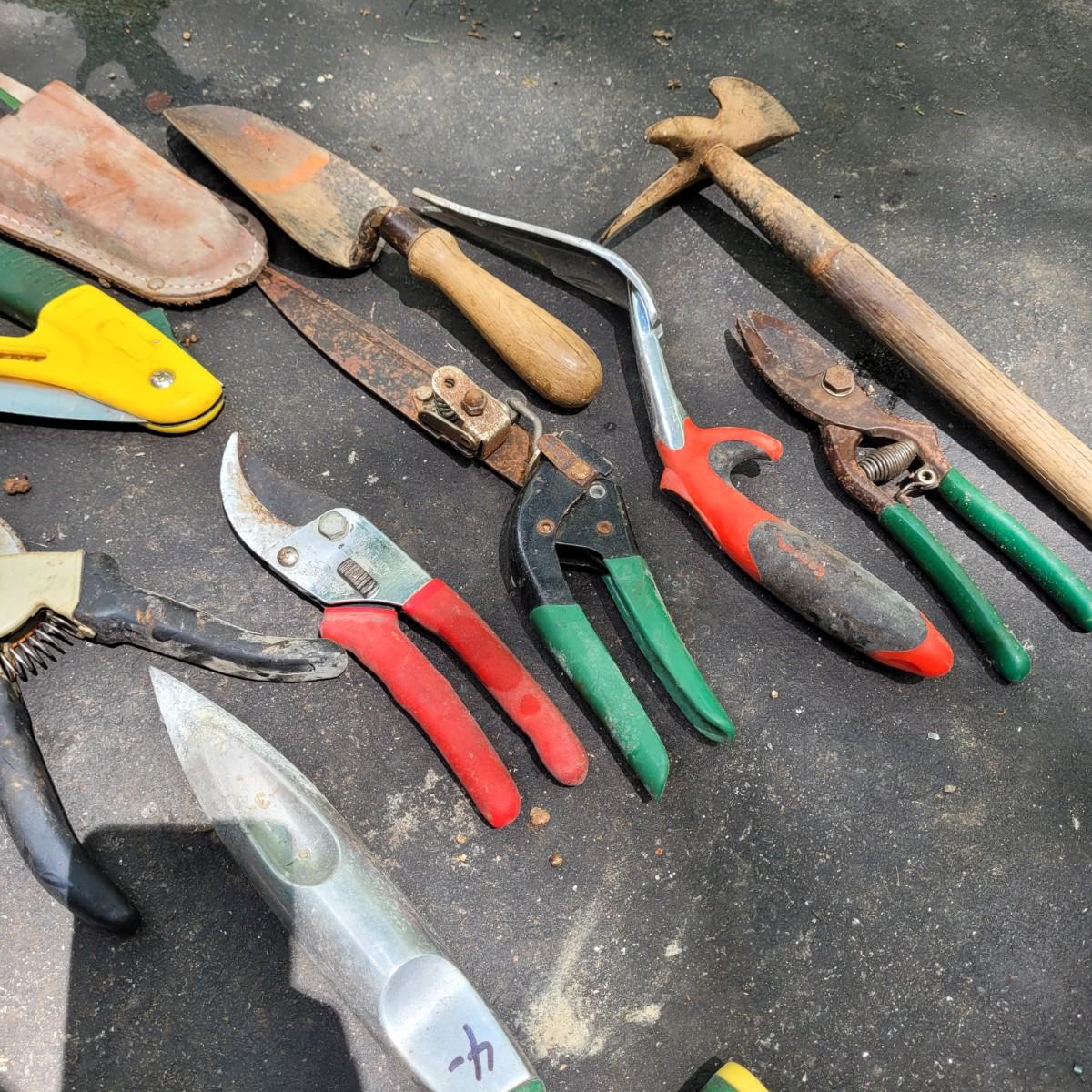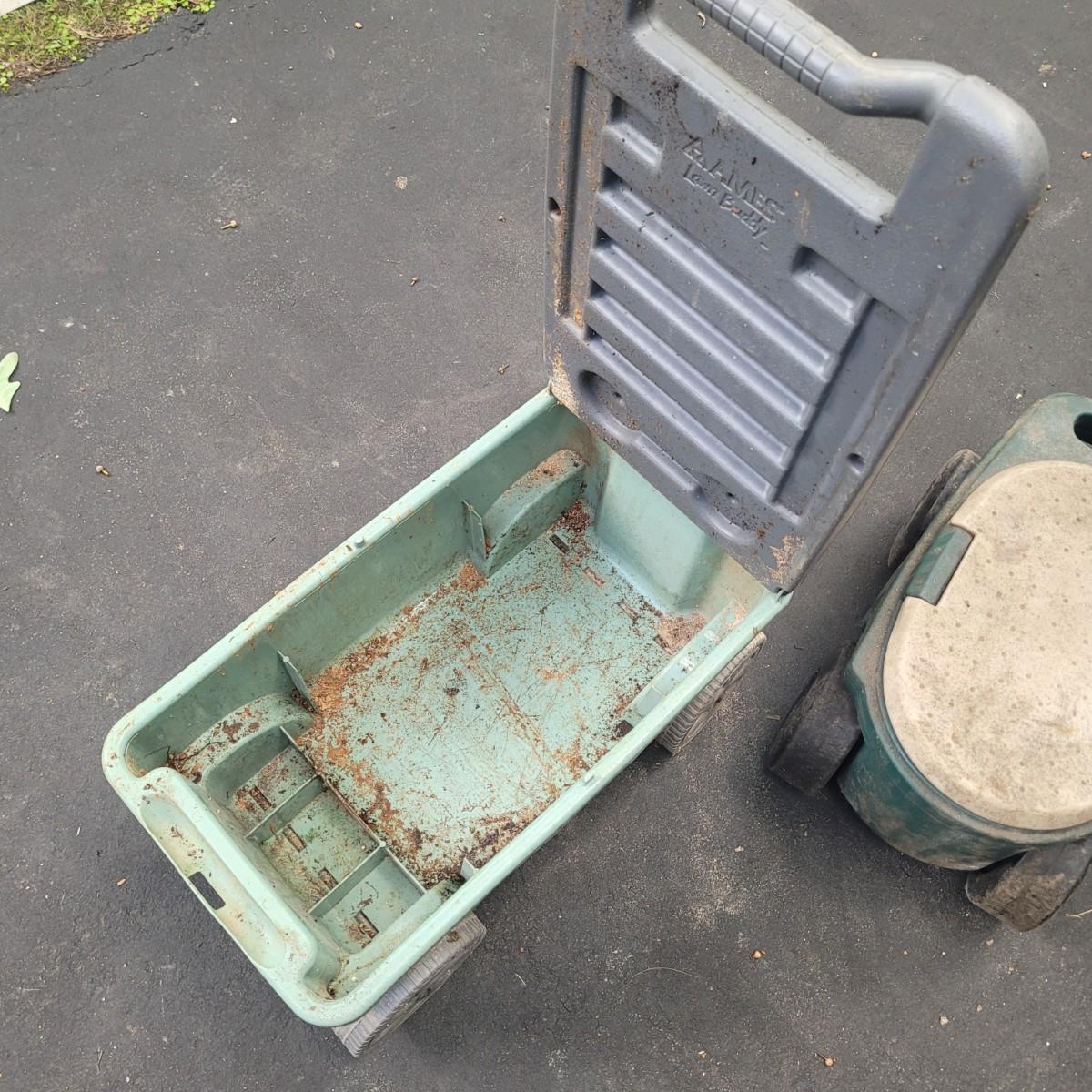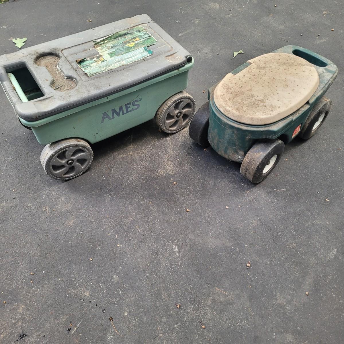 This lot includes a large variety of gardening tools. Items include two rolling gardening carts, folding step ladder/knee pad, hole drillers, stakes, knee pads, gloves, and a very large mix of hand tools. See photos for individual items. Largest rolling cart measures 25" x 15" x 14"H.
