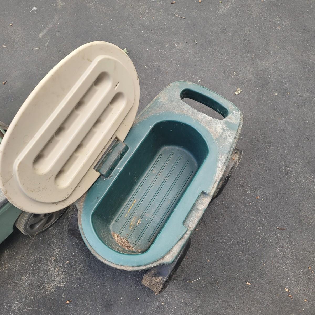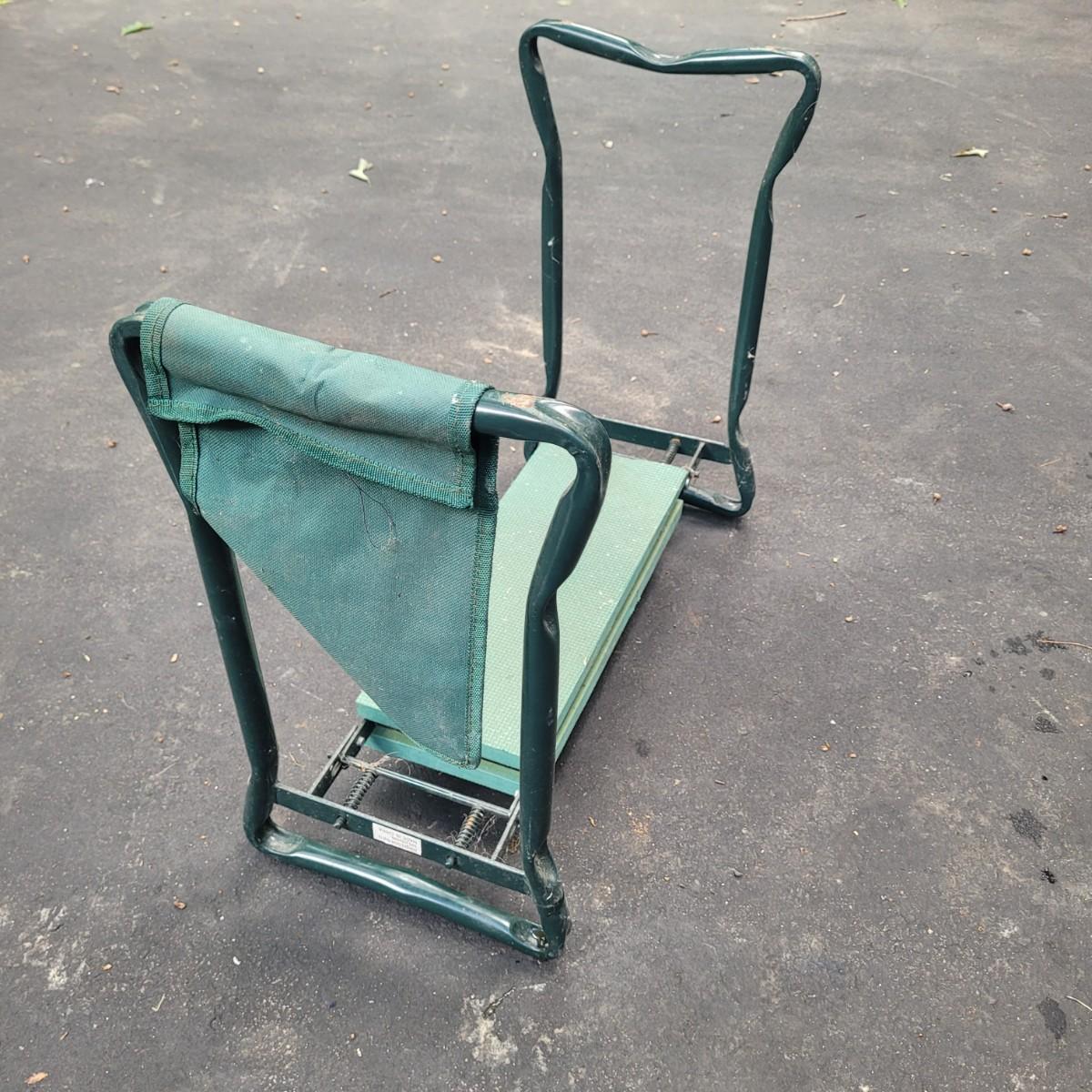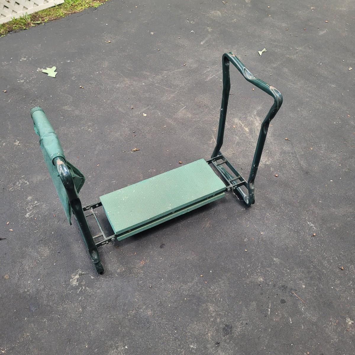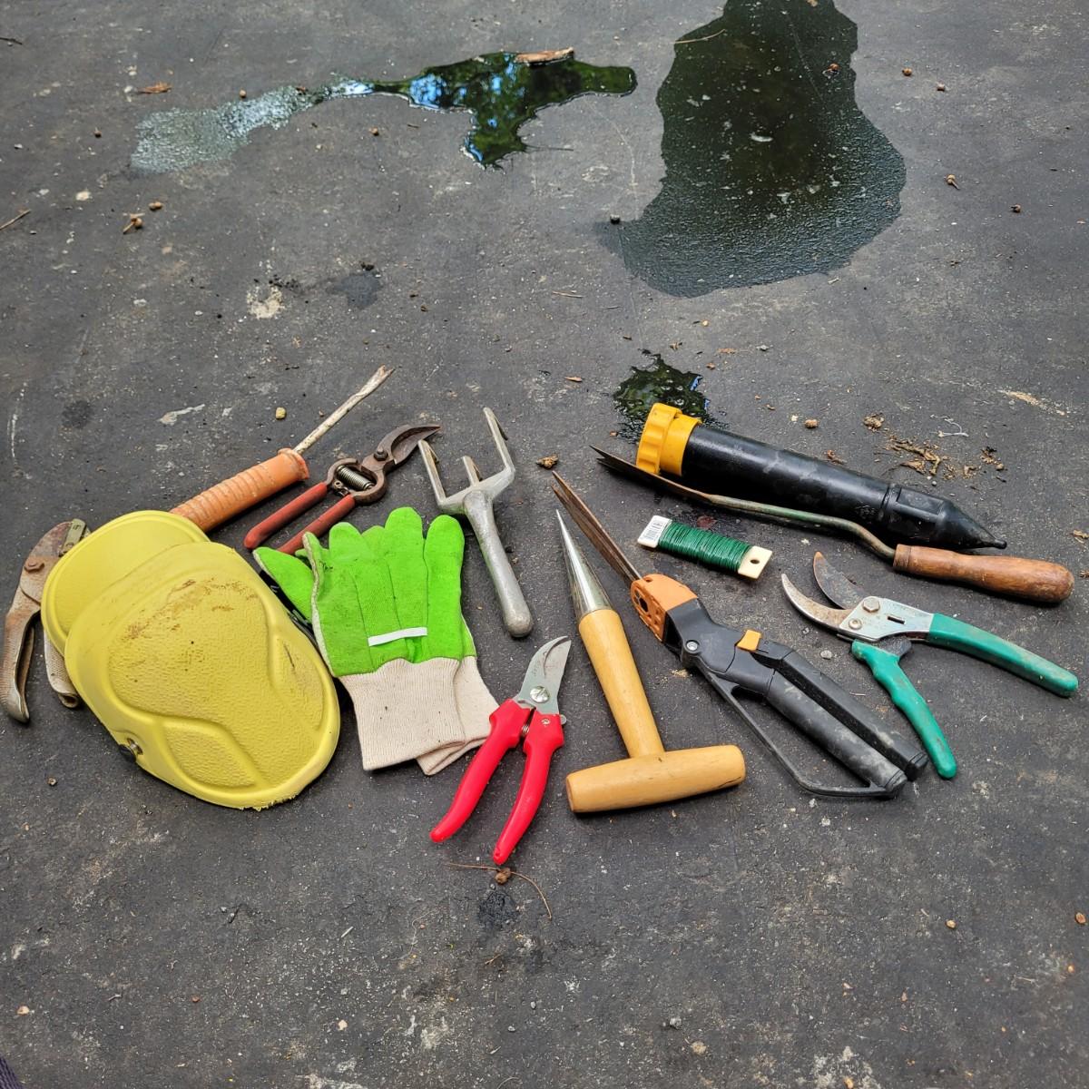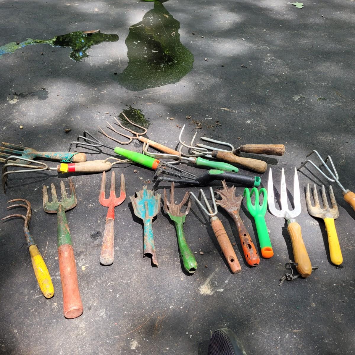 This lot includes a large variety of gardening tools. Items include two rolling gardening carts, folding step ladder/knee pad, hole drillers, stakes, knee pads, gloves, and a very large mix of hand tools. See photos for individual items. Largest rolling cart measures 25" x 15" x 14"H.