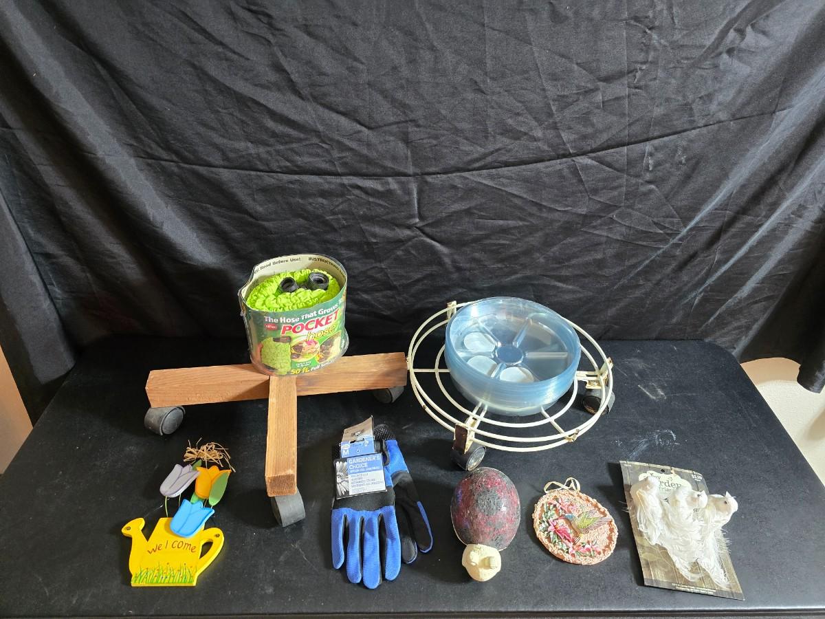 Gardening items - new gloves - plant stands - Pocket hose - Flowerbed decor and more