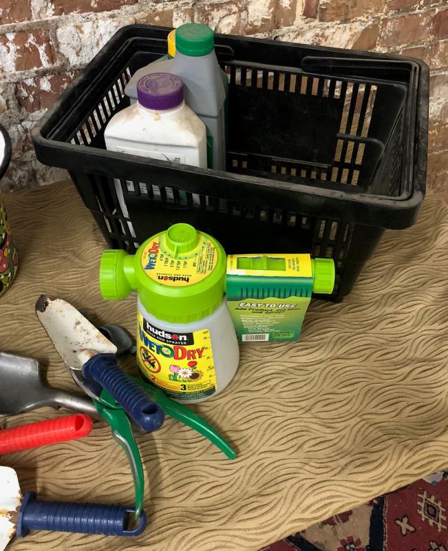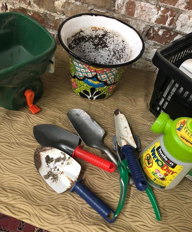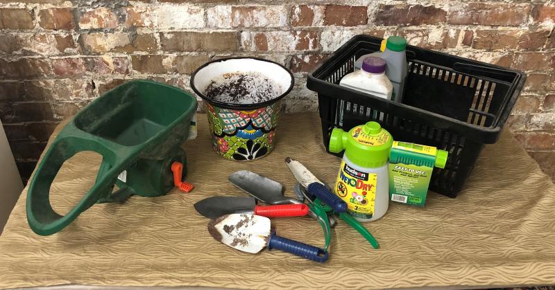 Fertilizer spreader...spades...new sprayer..pot as shown in this garden lot...