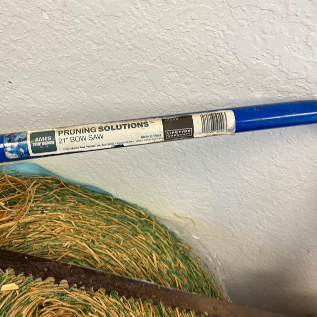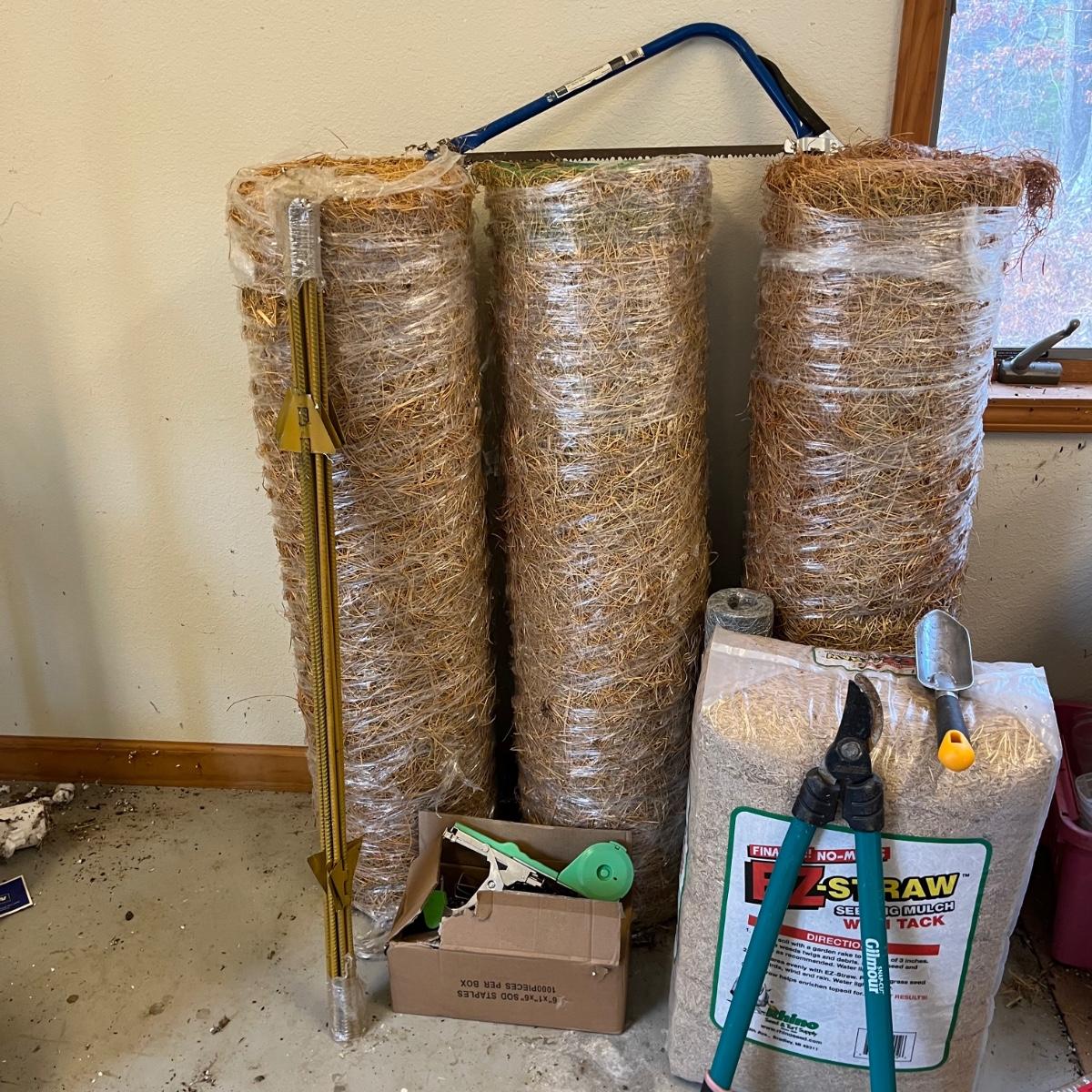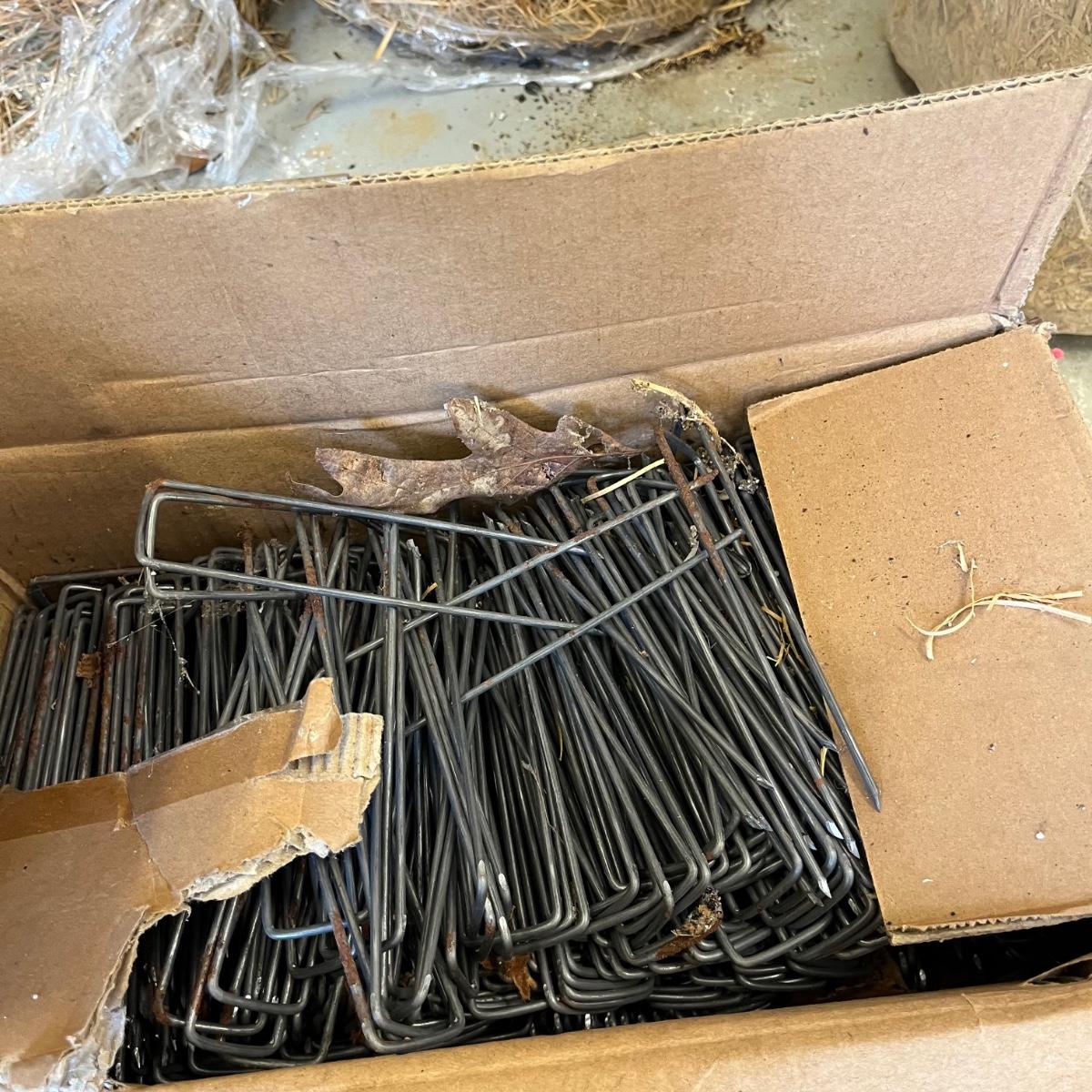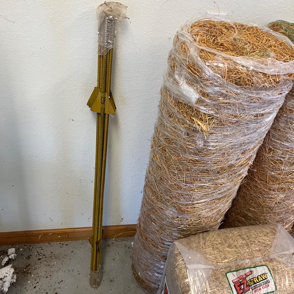 Lot includes three rolls of erosion netting, one bag of seeding mulch, box of landscape staples, Gilmore loppers, poultry netting, Tape Tool gardening tape machine and an Ames 21” bow saw. Also include 10 metal stakes. Erosion netting measures 14”D x 48”.