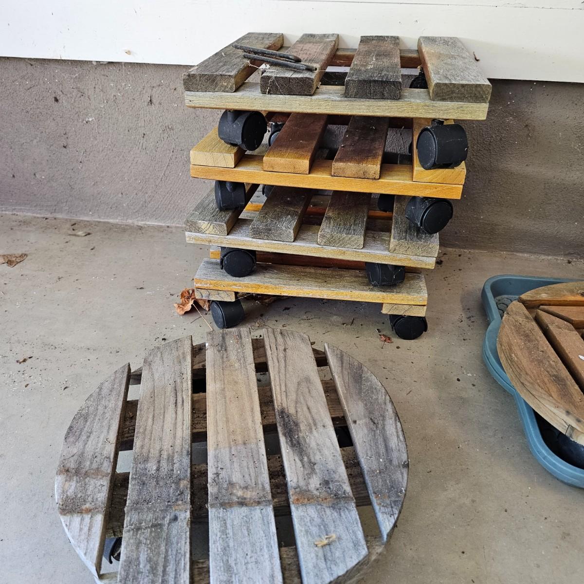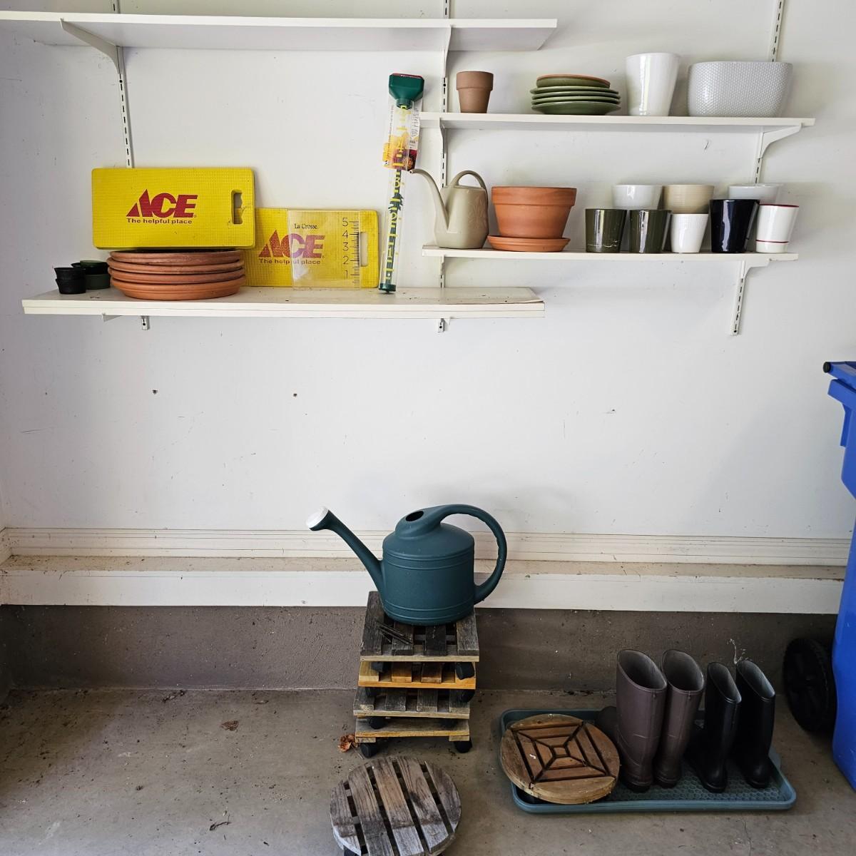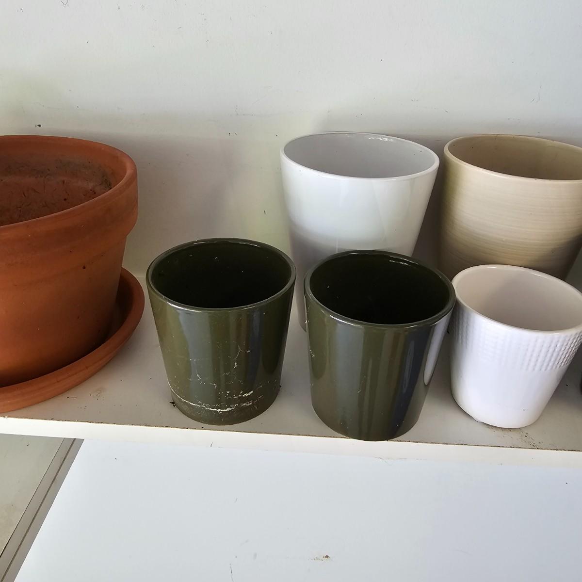 Large assortment of planters and pots for the garden or elsewhere. Pots, trays, watering cans, flower frogs, boots, rain gauges and more. Pots range in size from 3.5" to 8". Large ceramic trays are 12"dia. Wooden rolling plant stands are 12" round or 12" square. Also includes two boot trays and one pair of size 10 and one pair of size 7 garden boots. See photos for details. Local pickup only.
