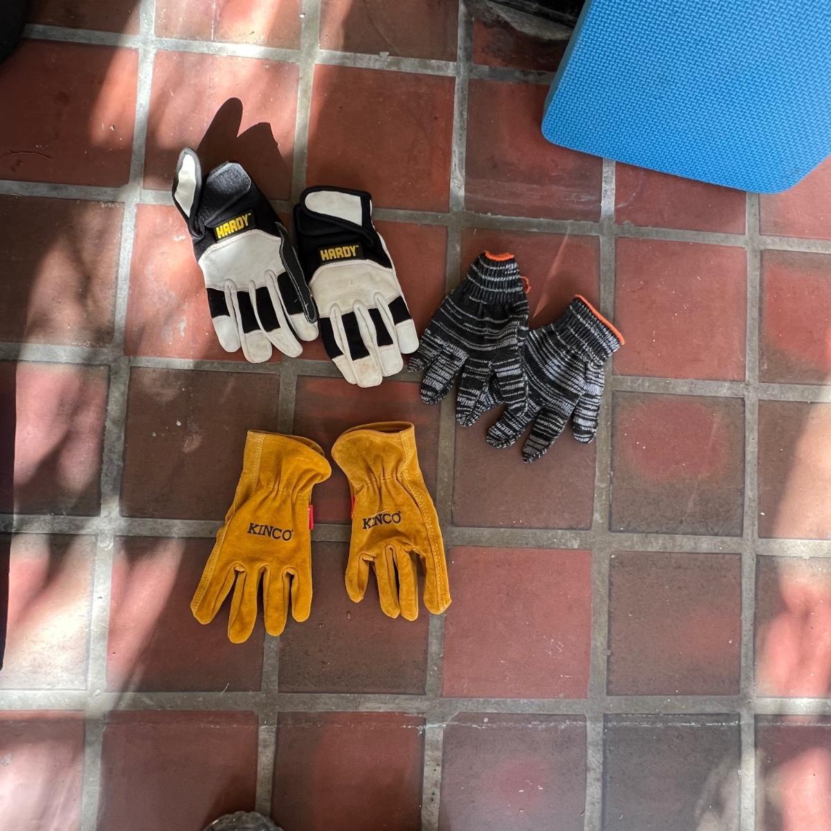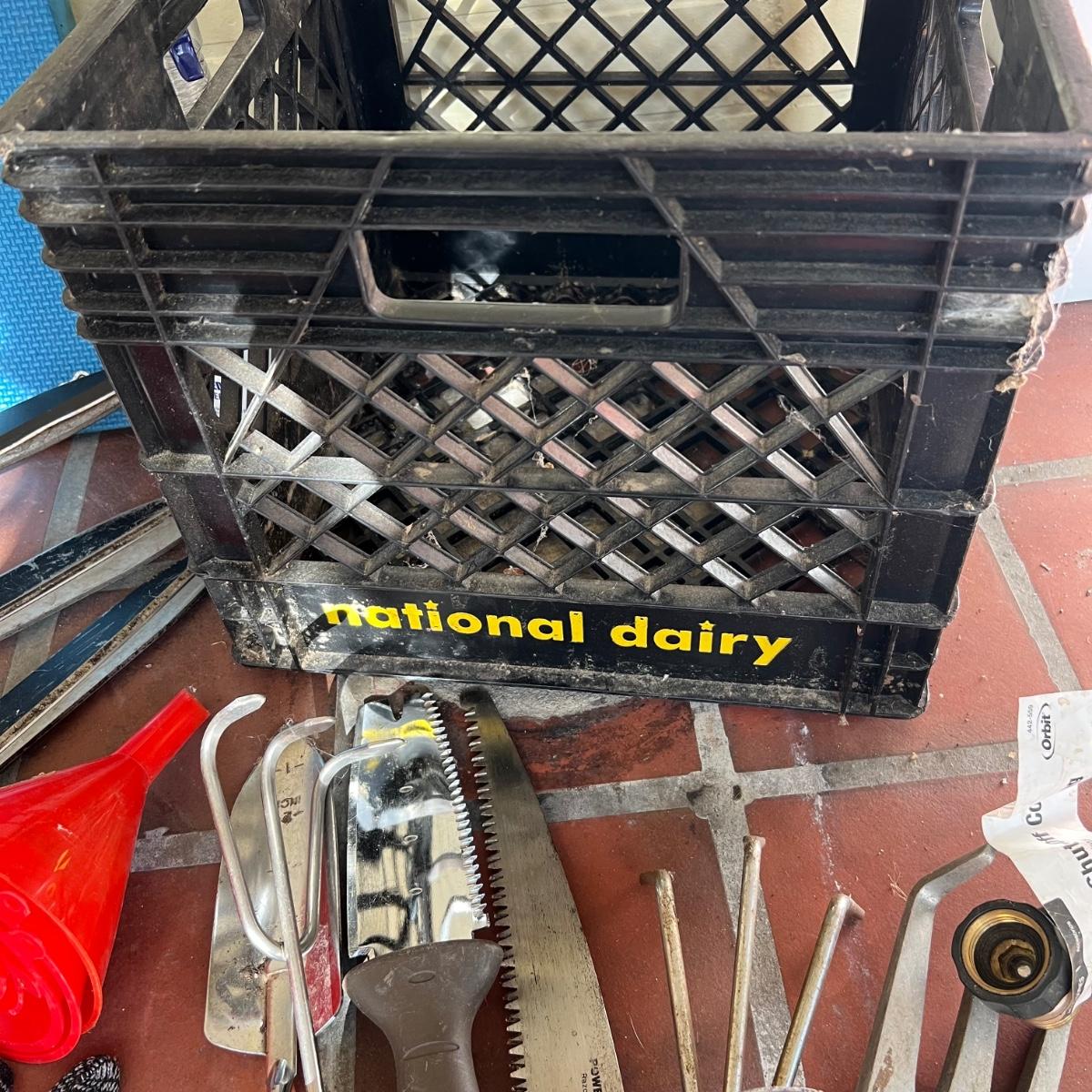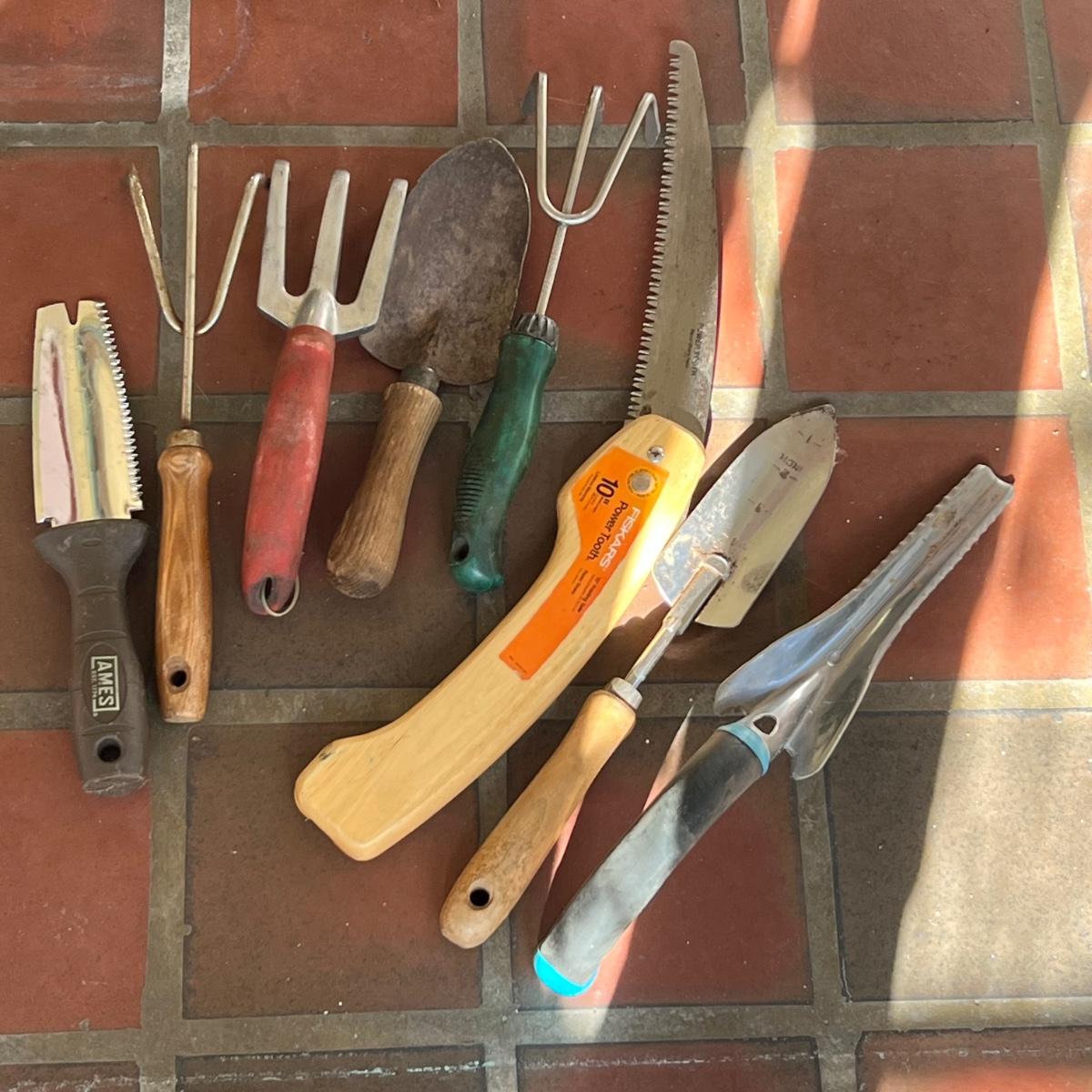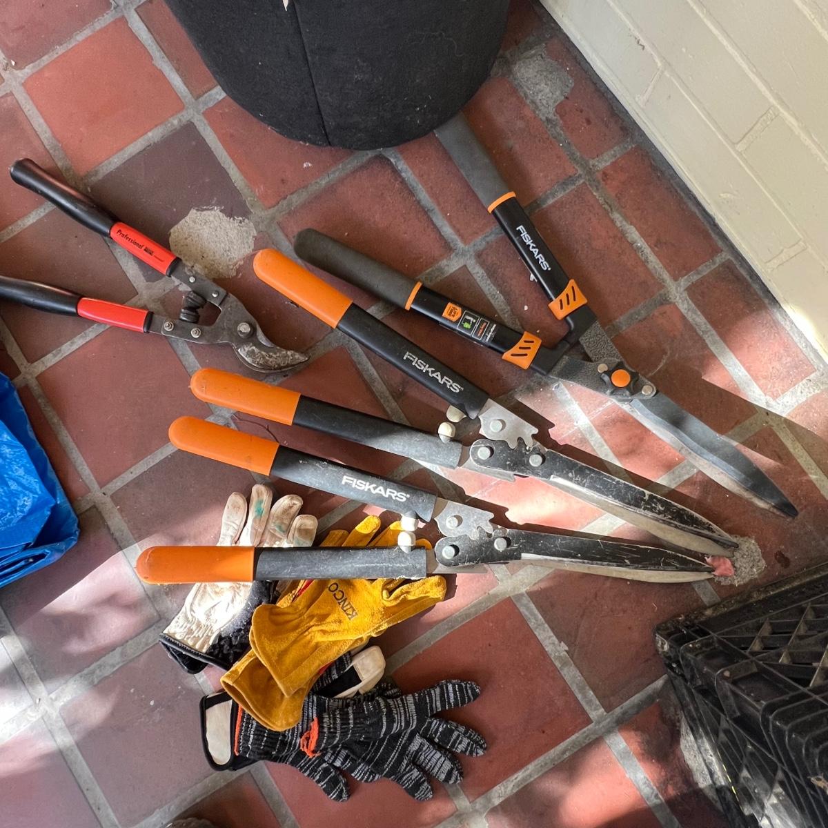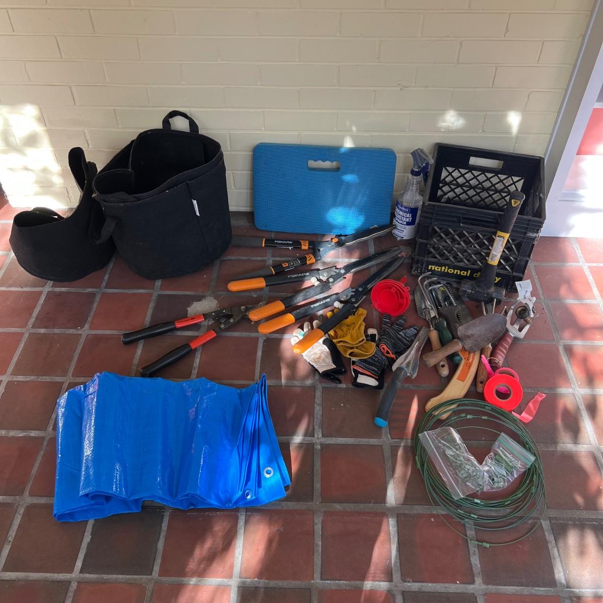Lots of useful tools includes size Small gloves (includes cowhide leather), Fiskars loppers, felt bags with handles, foam kneeling pad, plastic crate and more, see images for full inventory.