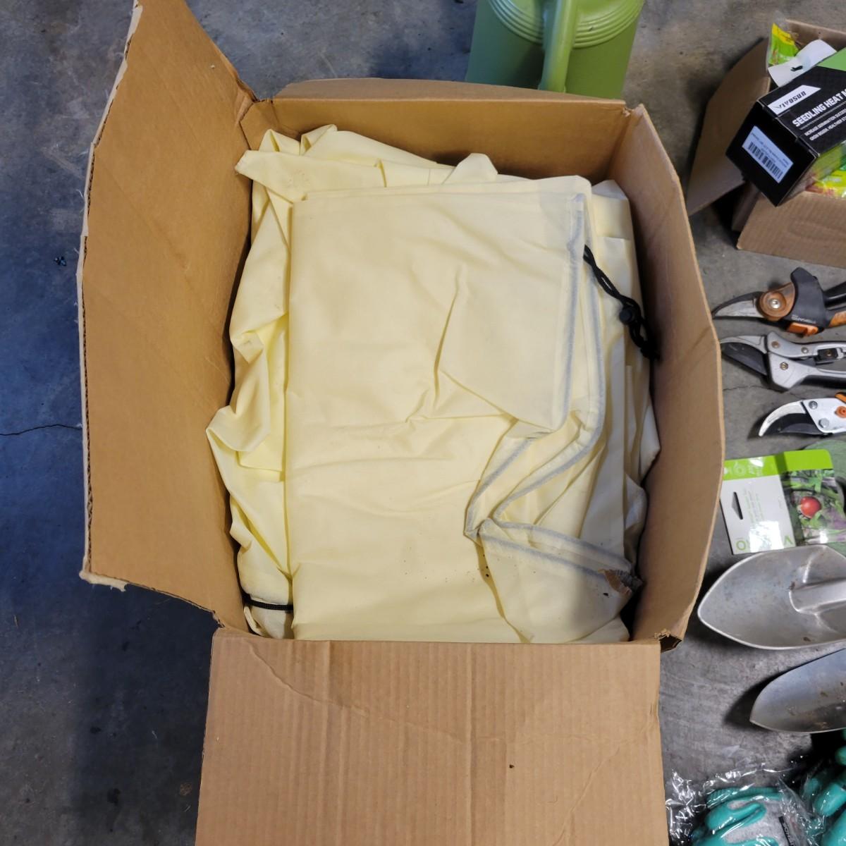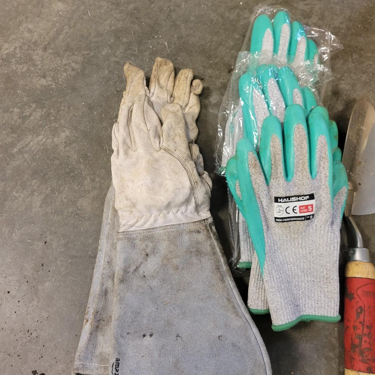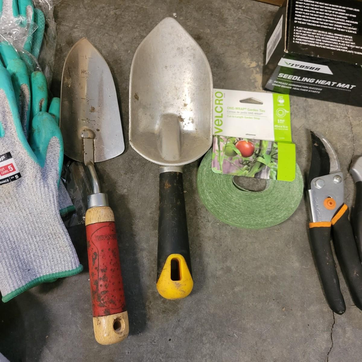 An assortment of gardening tools and supplies that includes gloves, hand trowels, hand pruners, sNIB Vivioson seedling mat, plant wire twists, a plastic watering can and approximately 10 frost protection bags in two sizes. The largest bag measures approximately 46" x 68". Local pickup only