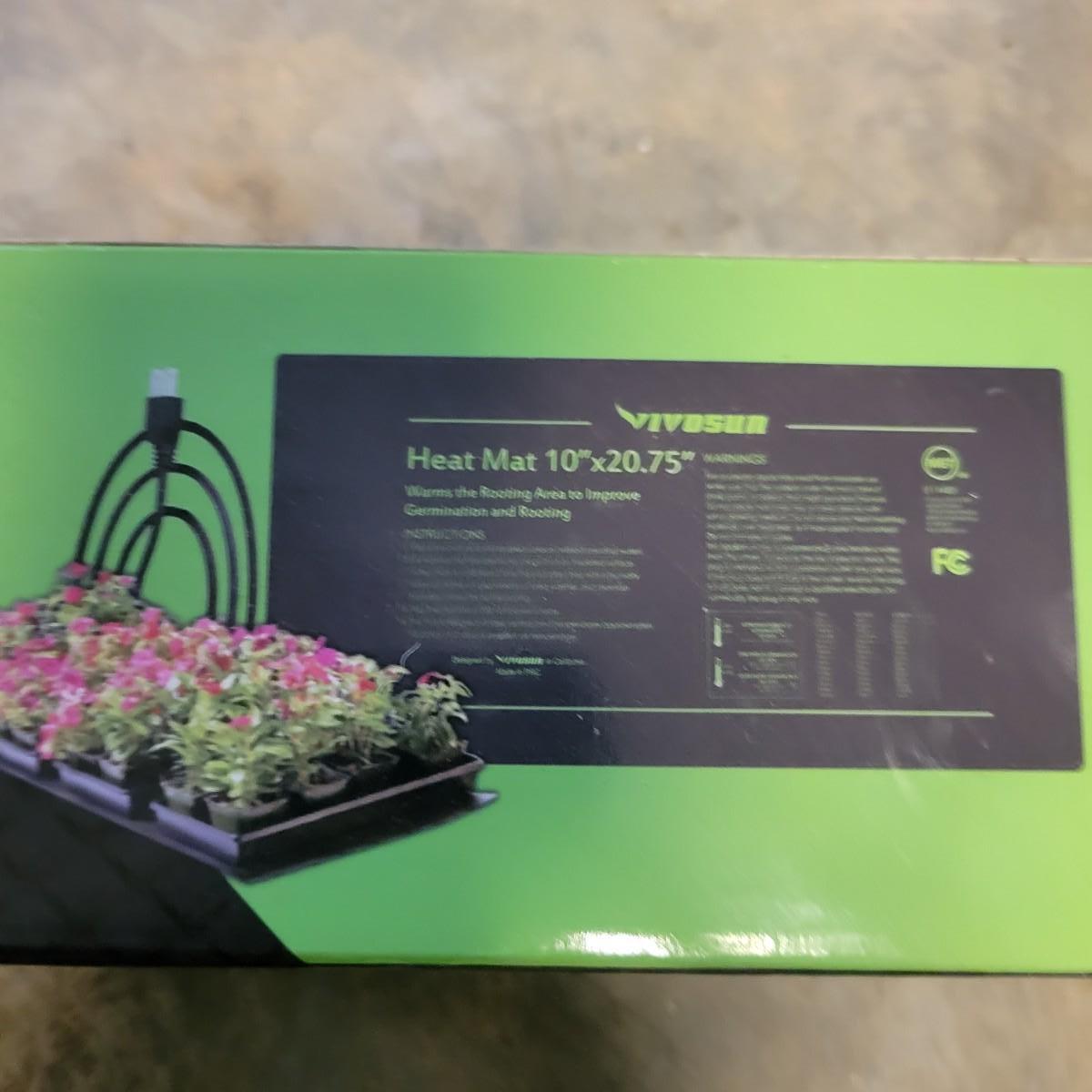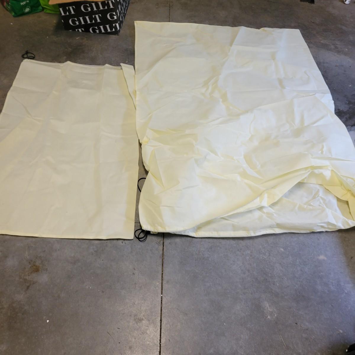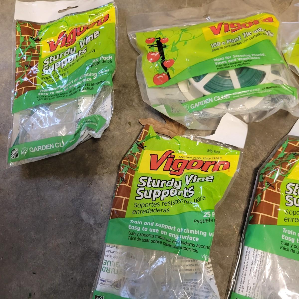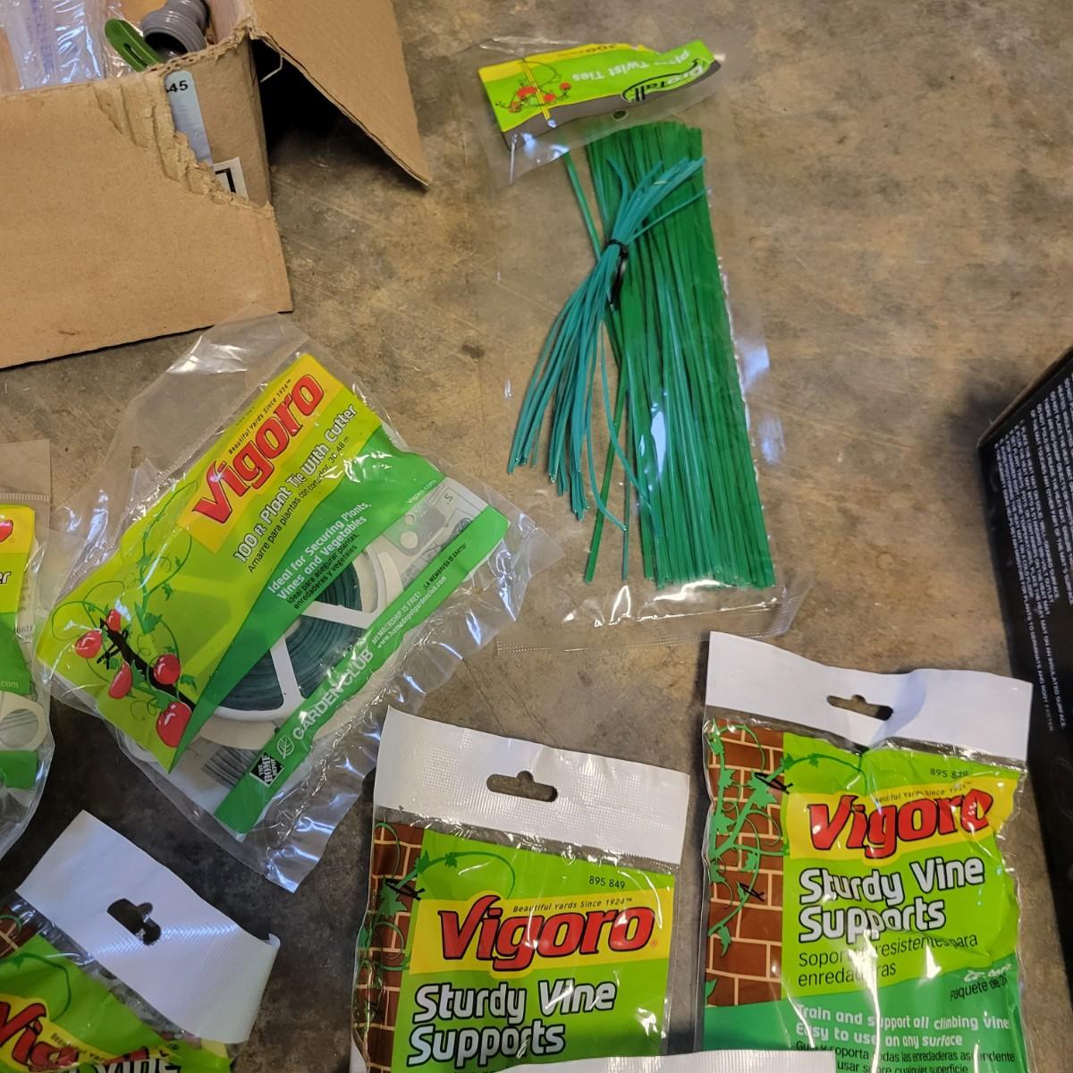 An assortment of gardening tools and supplies that includes gloves, hand trowels, hand pruners, sNIB Vivioson seedling mat, plant wire twists, a plastic watering can and approximately 10 frost protection bags in two sizes. The largest bag measures approximately 46" x 68". Local pickup only