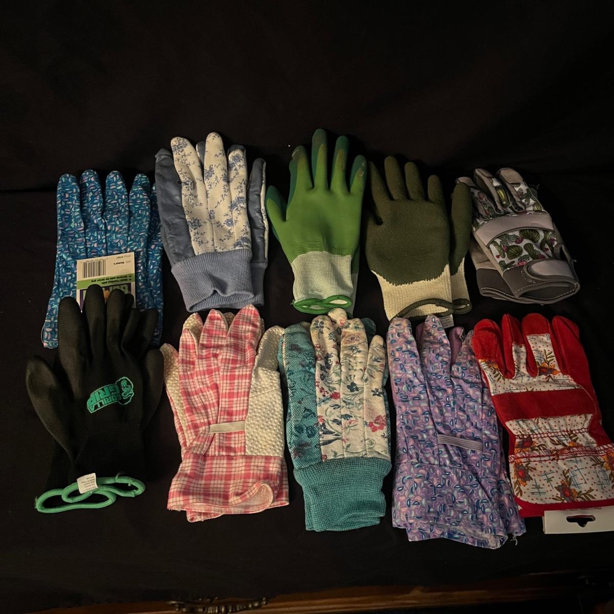 Lot includes ten gardening books, ten pairs of gloves, garden shears, basket , nylon bag with handles and more. Basket measures 15” x 19” x 7”H. Also includes Activcool hat.