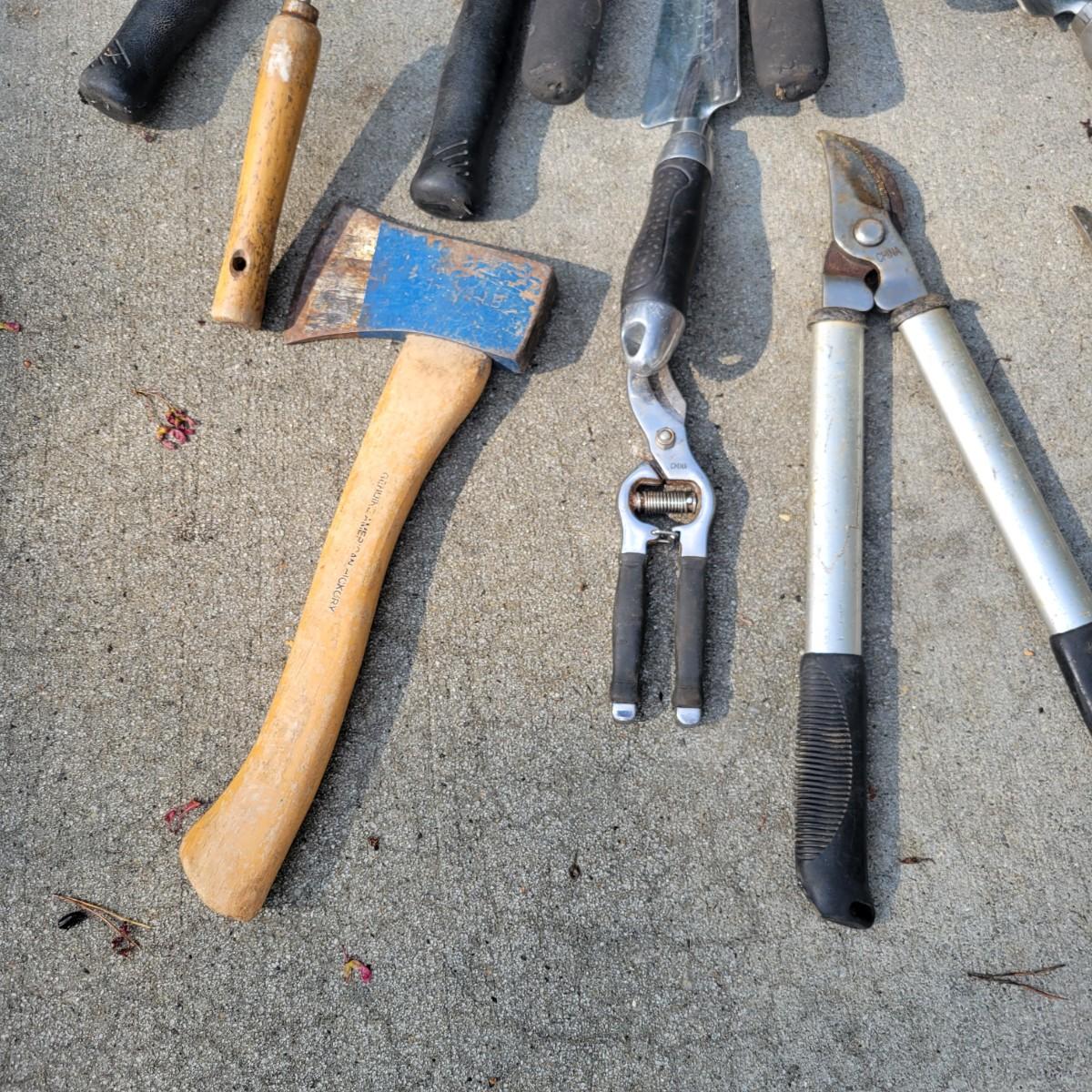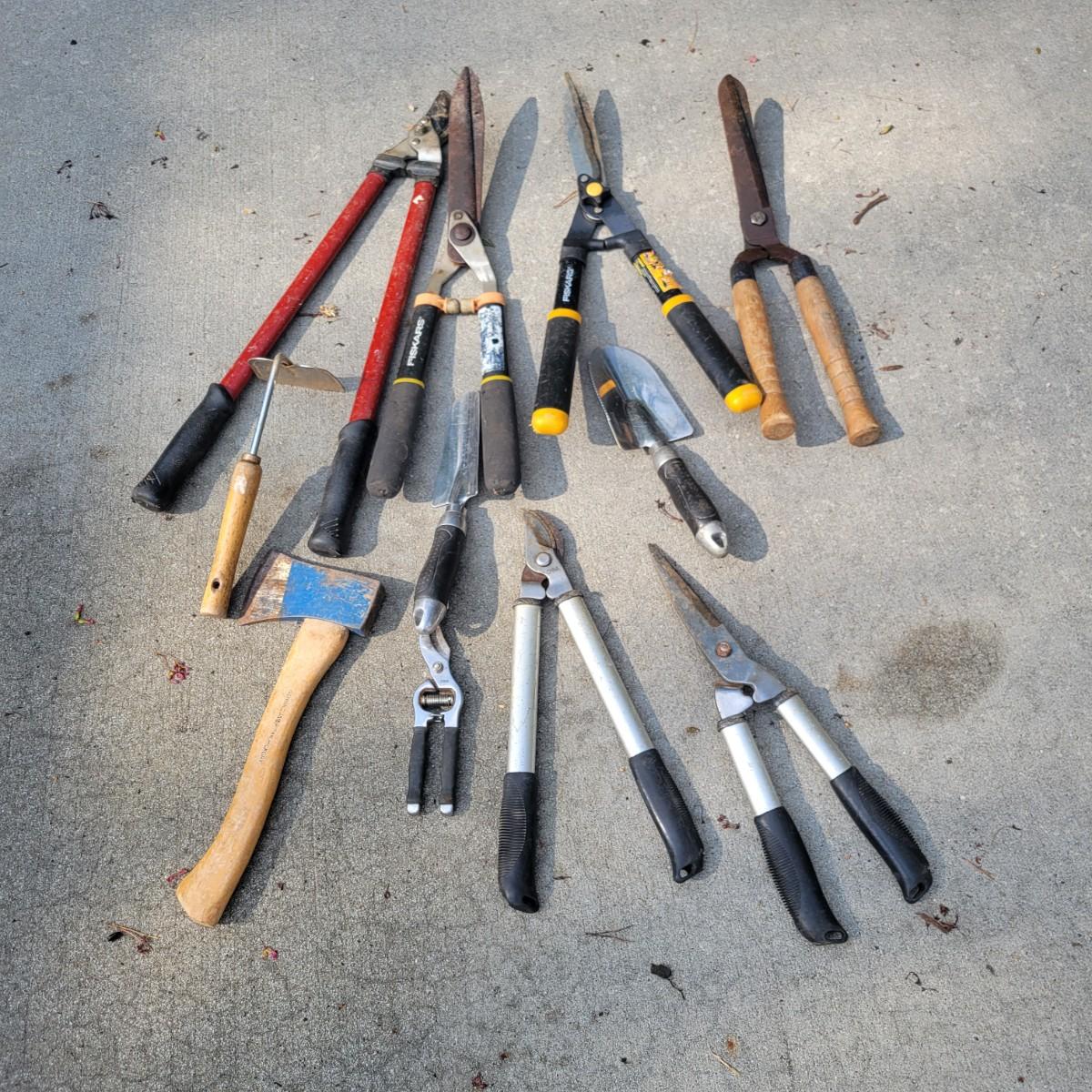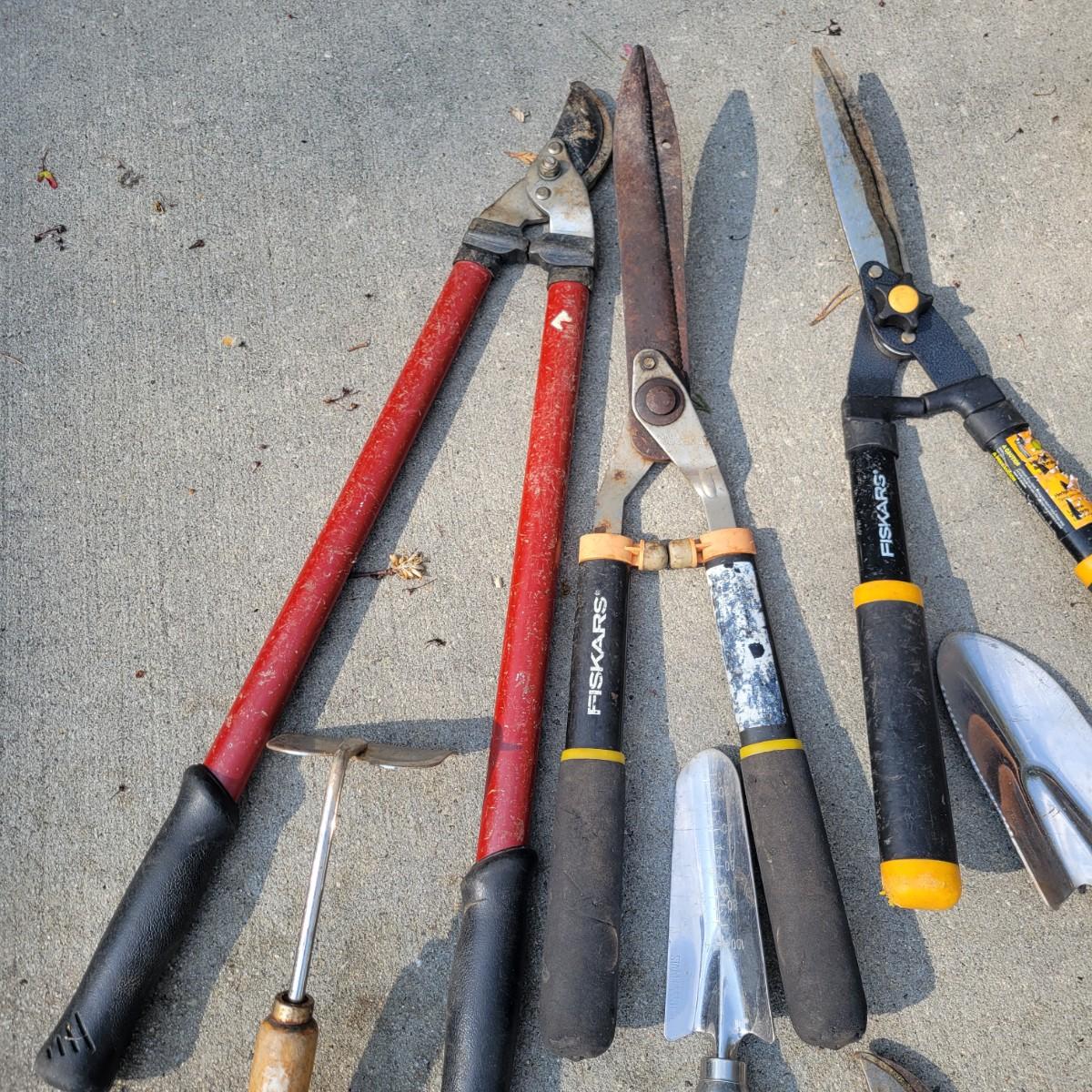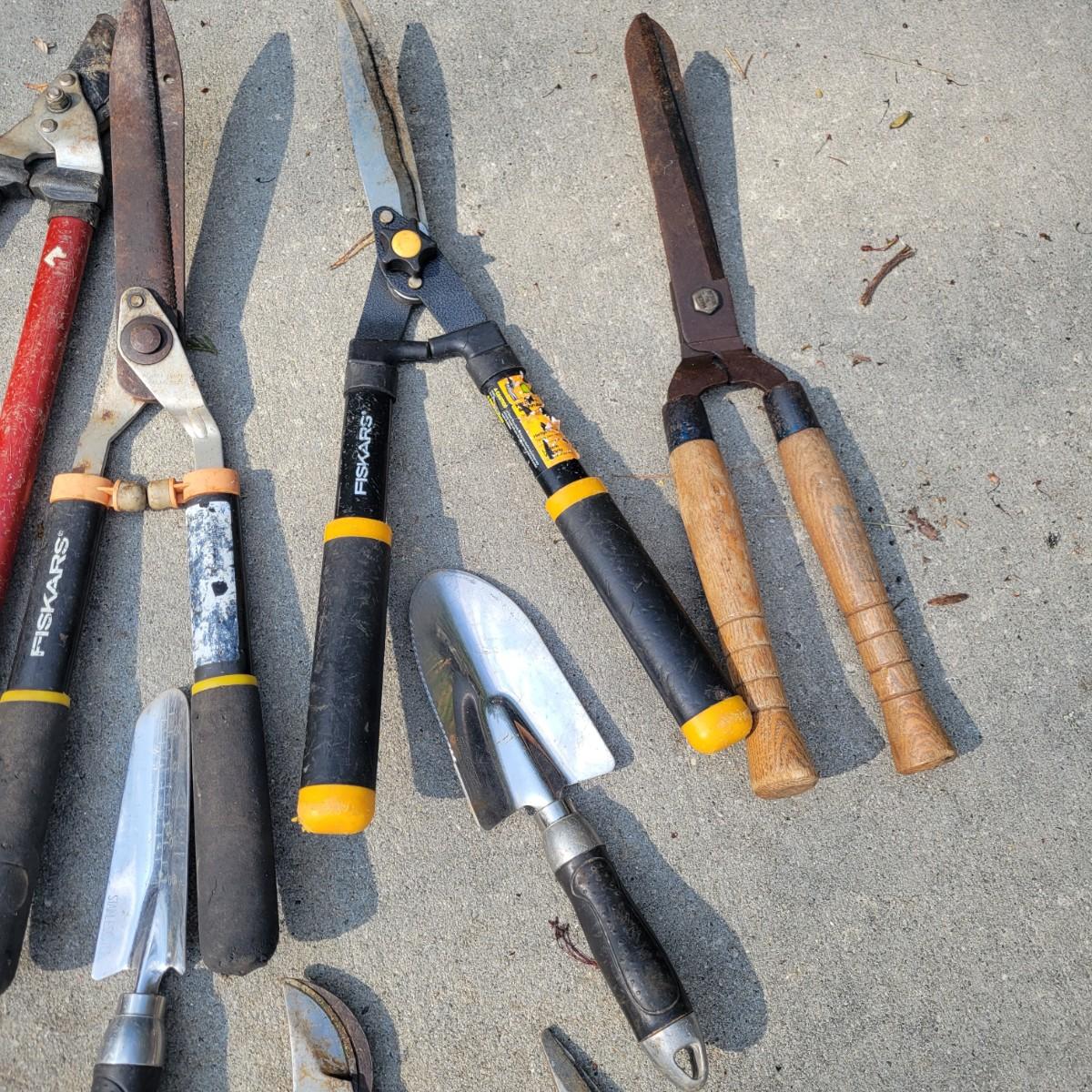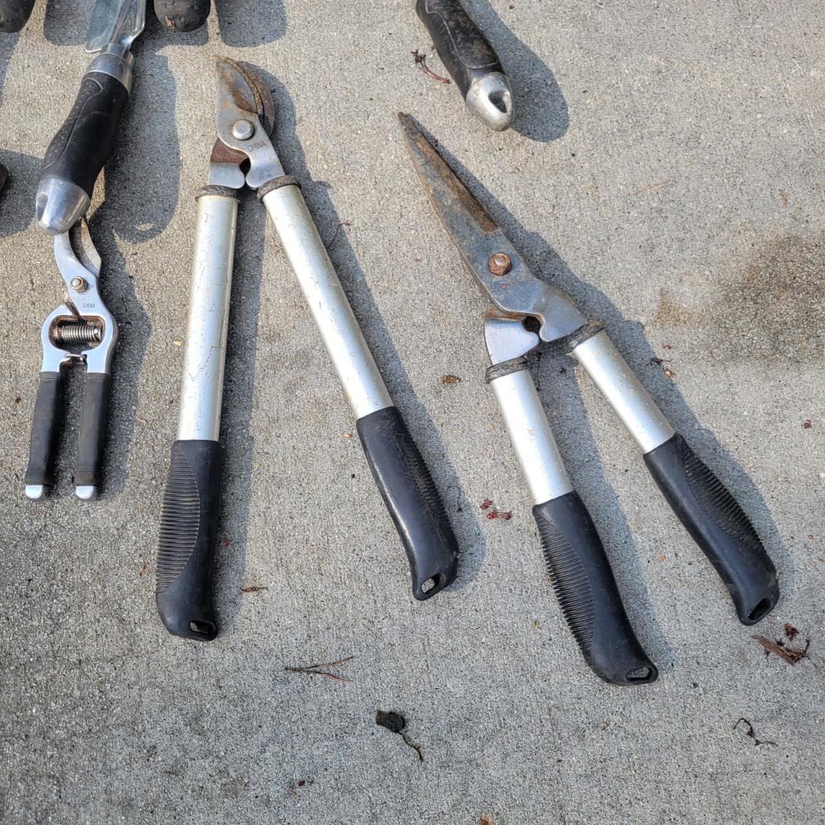 An assortment of gardening hand tools ranging from loppers and shears to hand trowels and and snips. Local pickup only