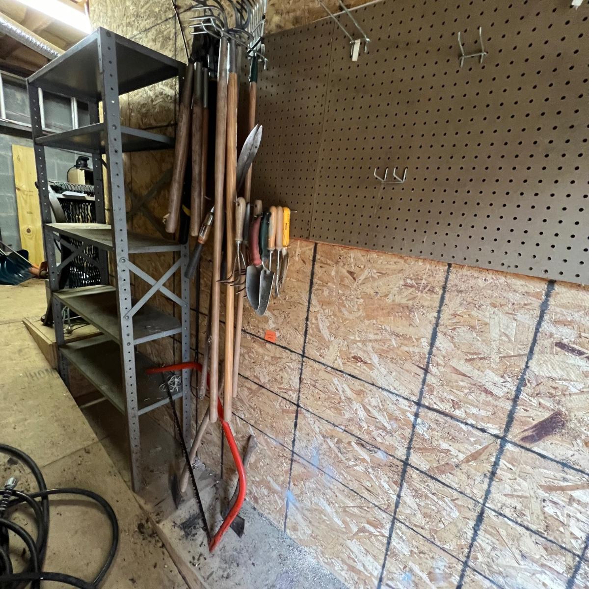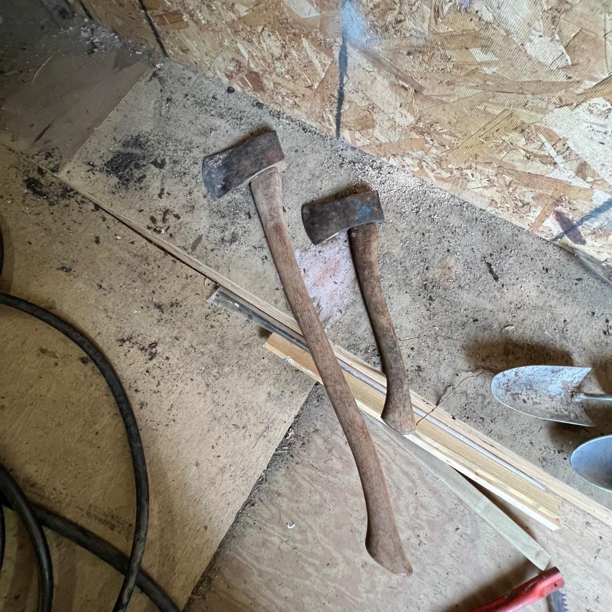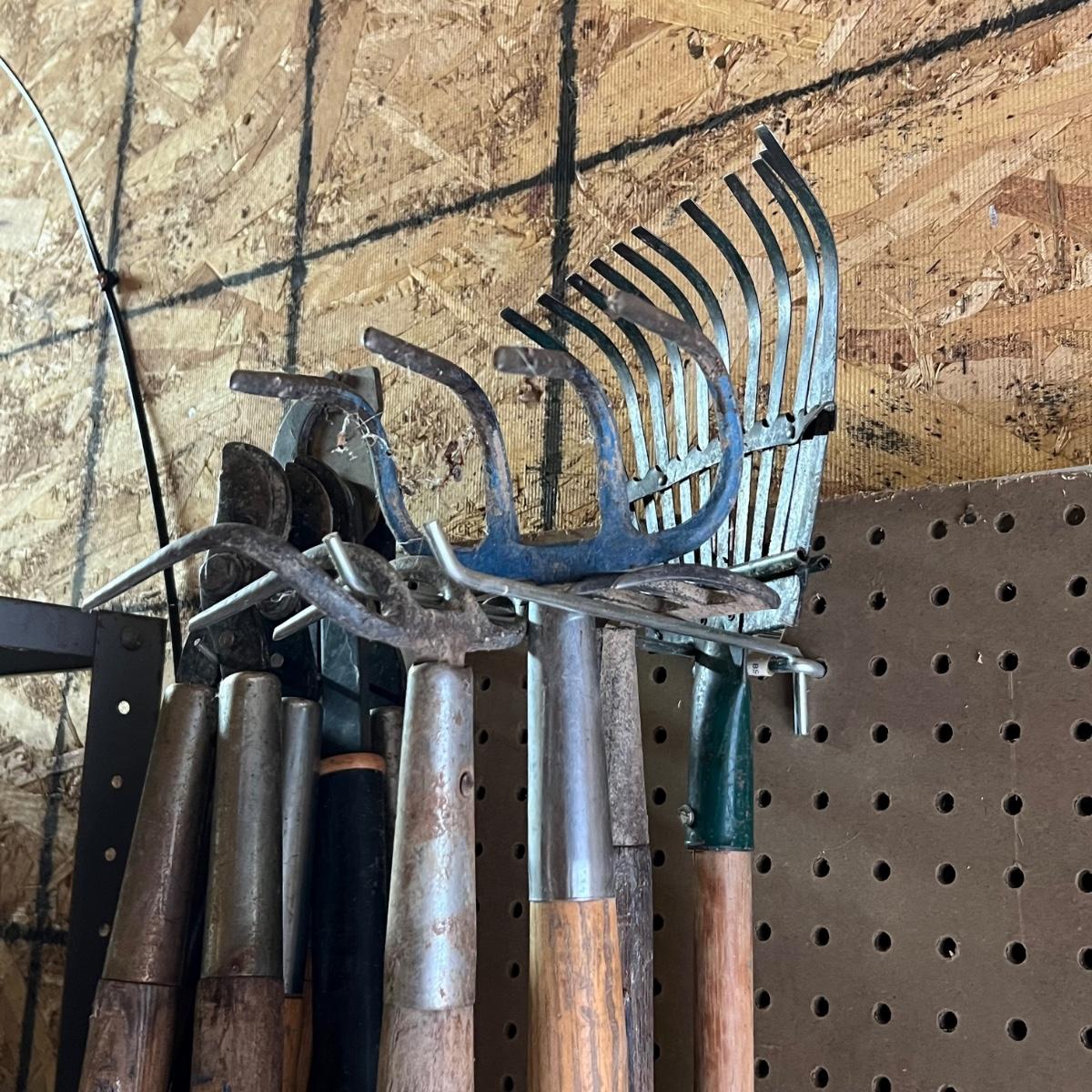 This lot has a great assortment of tools that includes trowels, hatchets, small rakes with short and with long handles and more.