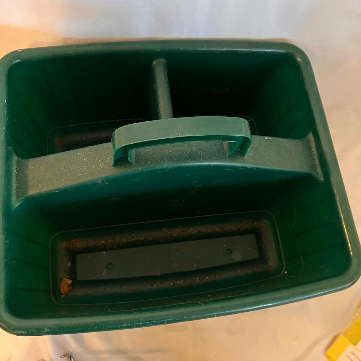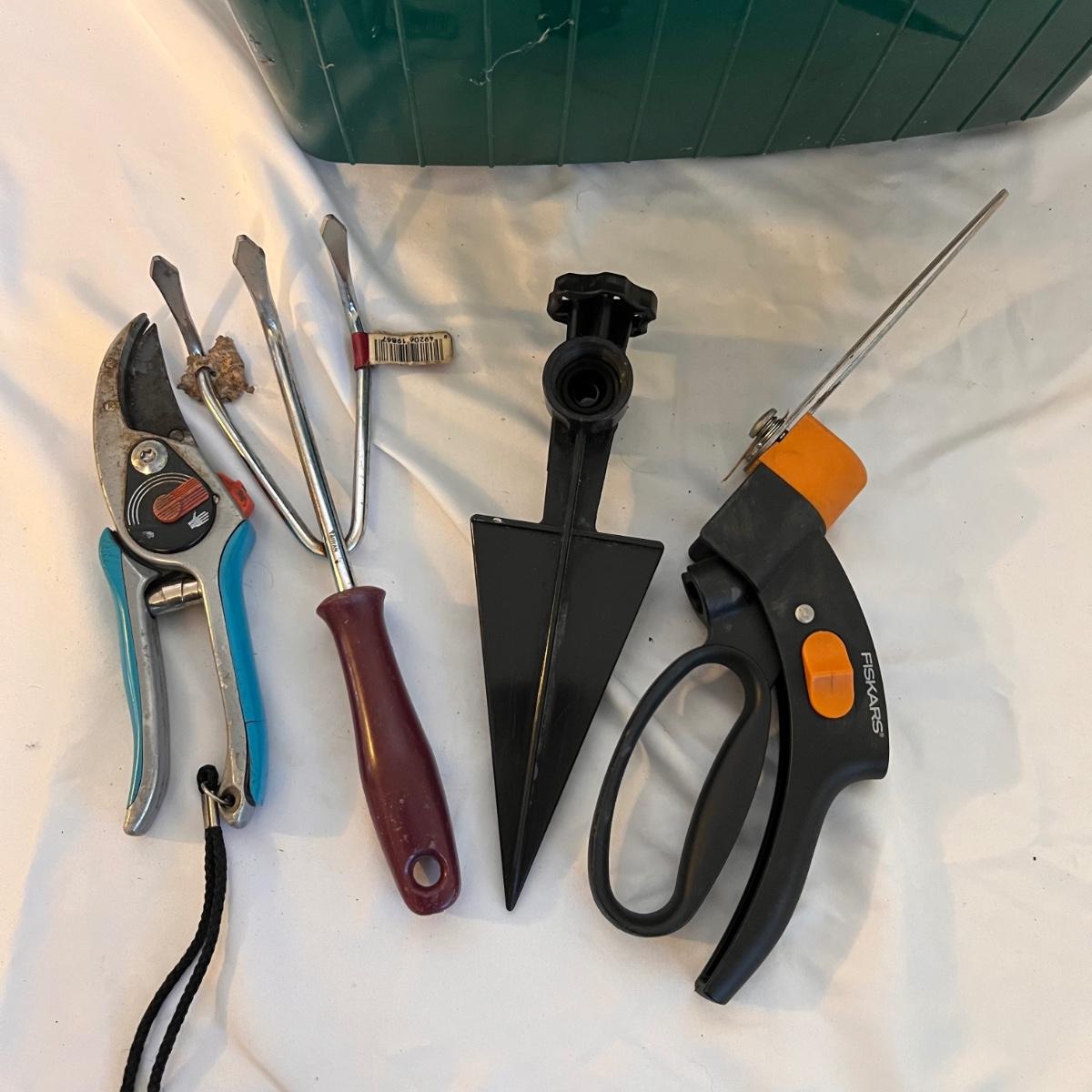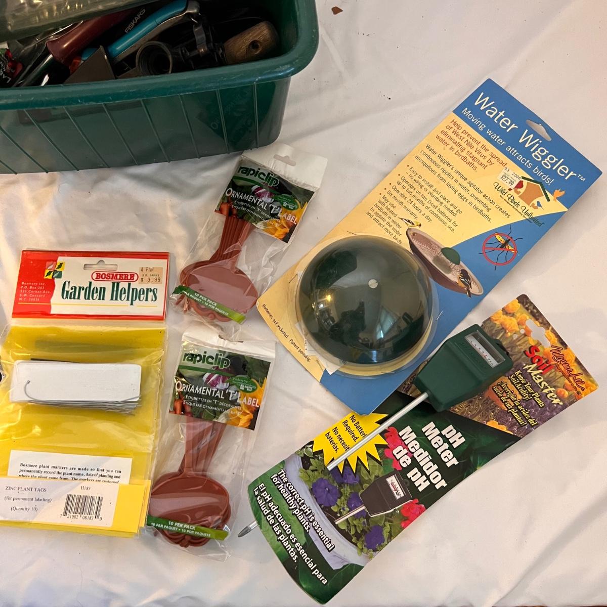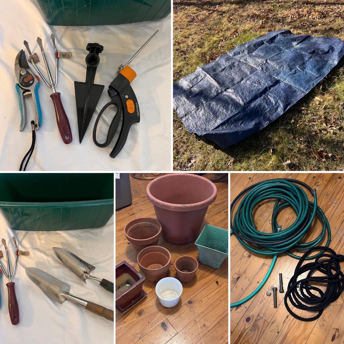 A large assortment of yard essentials includes tools, hoses + hose ends, small tarp (5ft x 7ft), plant pots, wooden truncheon, plastic watering cans, canvas tool holder/carrier and more. See pics for full inventory. Green plastic caddy is included. Pots includes 1 large plastic pot (measures 13”D x 12”H), a white and a dark red ceramic, three terracotta and a green metal pots. Note the tarp is thinning in areas. The frogs includes two metal and one plastic. There are approximately ten green plastic stakes.