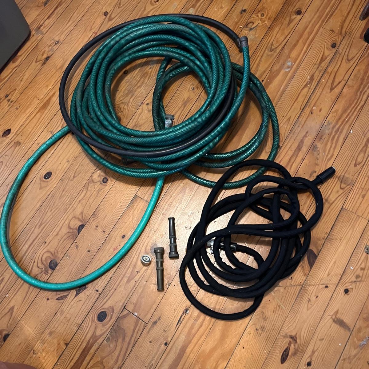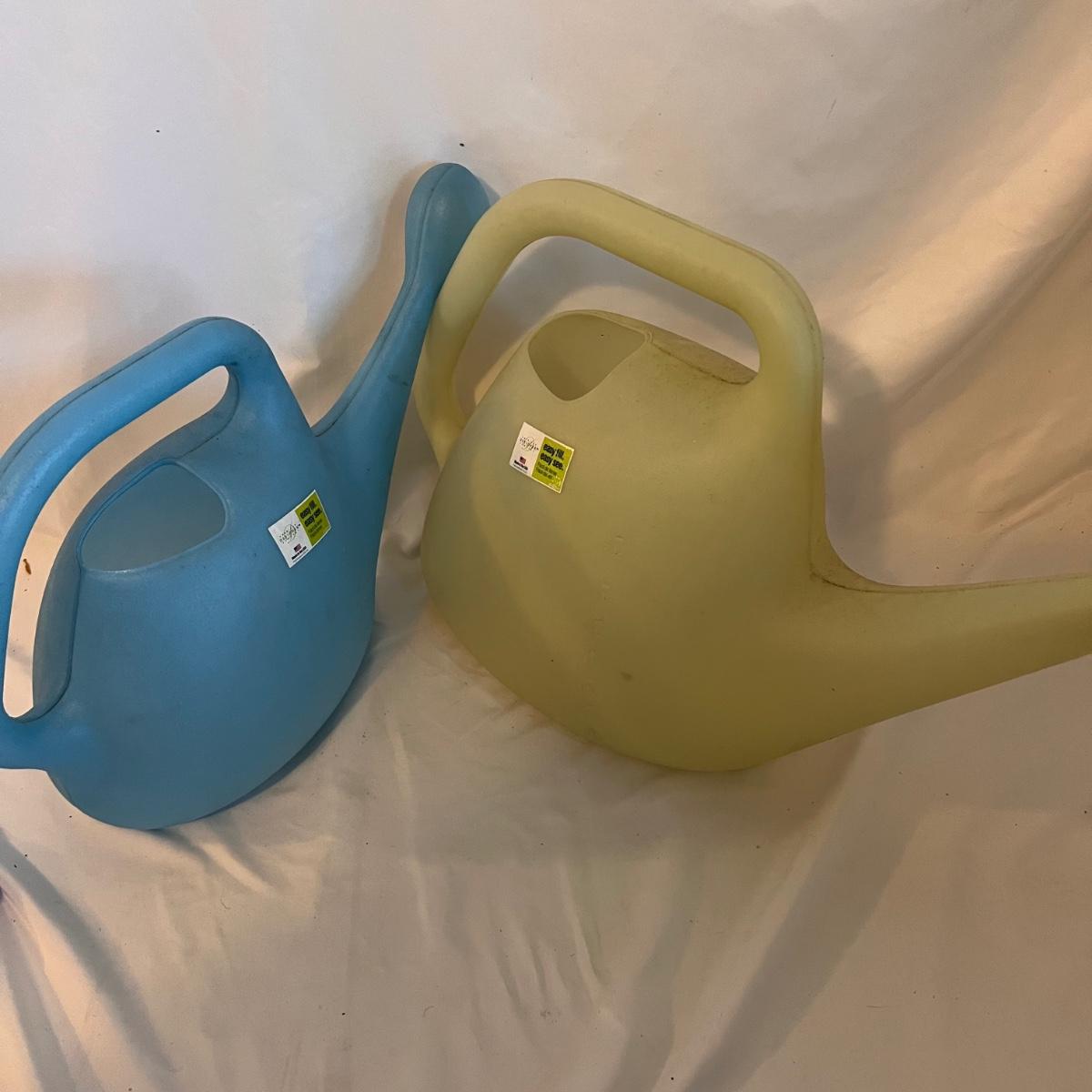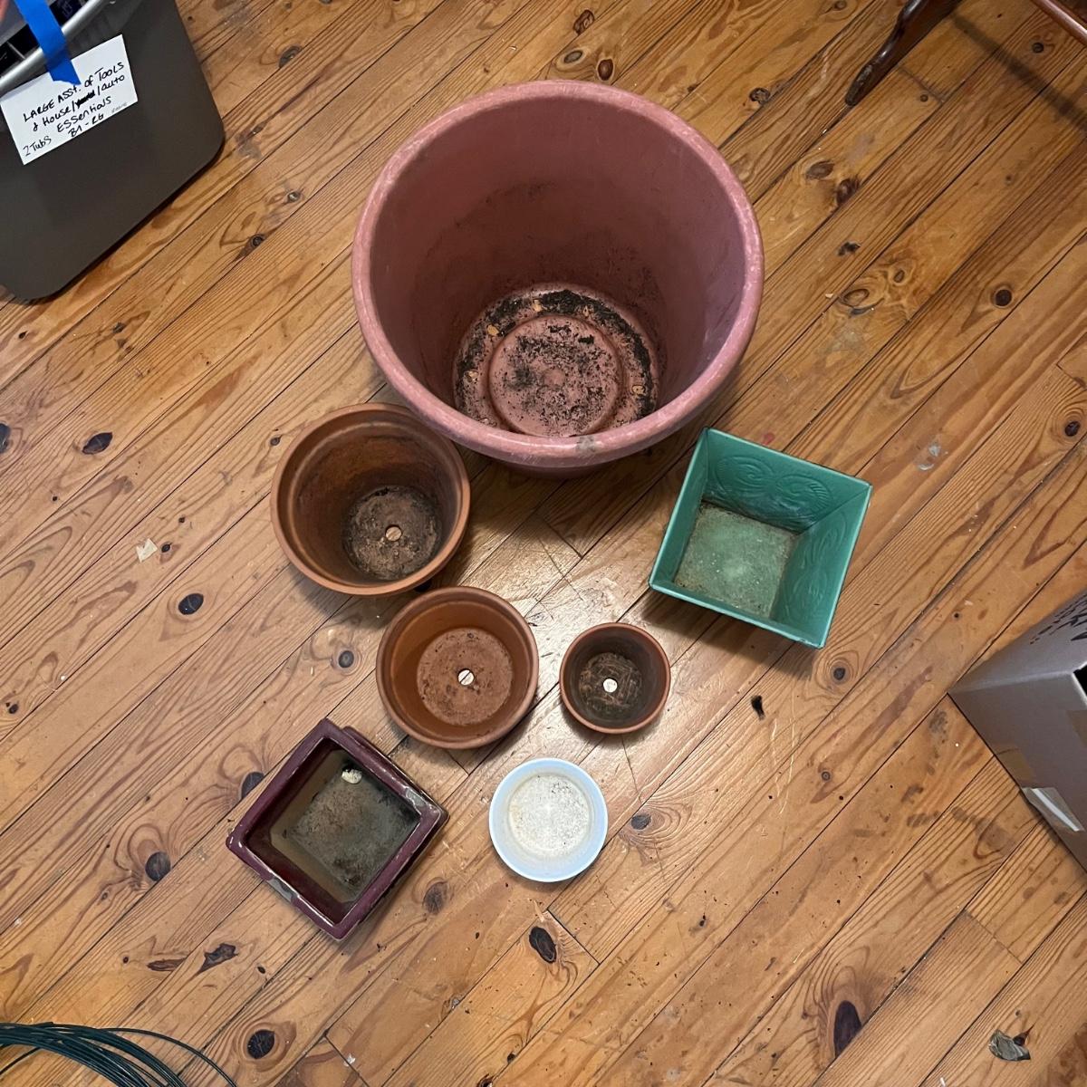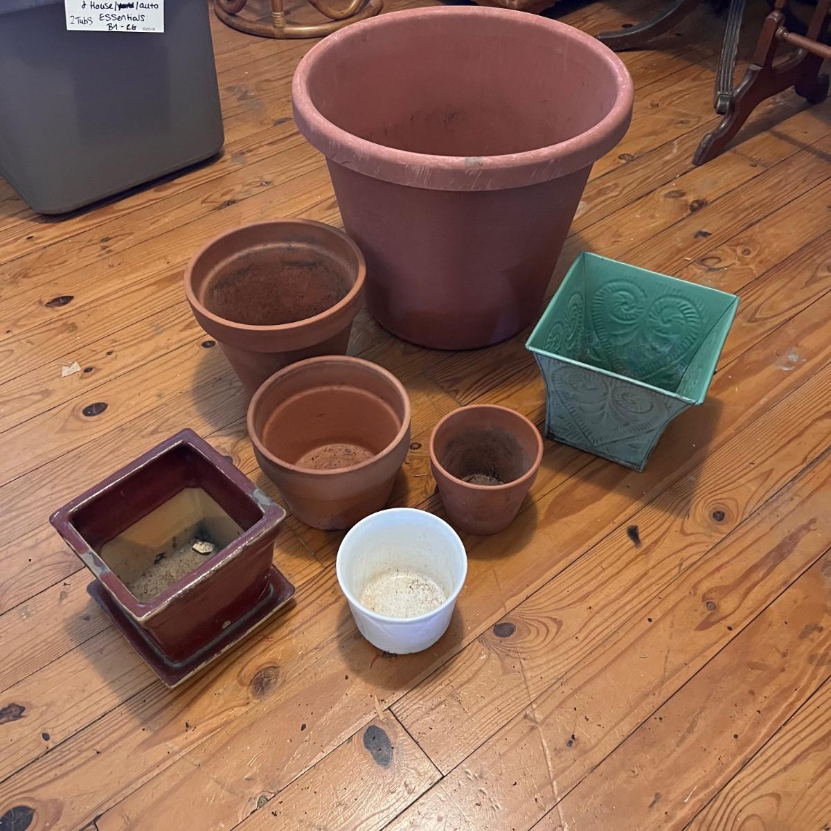 A large assortment of yard essentials includes tools, hoses + hose ends, small tarp (5ft x 7ft), plant pots, wooden truncheon, plastic watering cans, canvas tool holder/carrier and more. See pics for full inventory. Green plastic caddy is included. Pots includes 1 large plastic pot (measures 13”D x 12”H), a white and a dark red ceramic, three terracotta and a green metal pots. Note the tarp is thinning in areas. The frogs includes two metal and one plastic. There are approximately ten green plastic stakes.