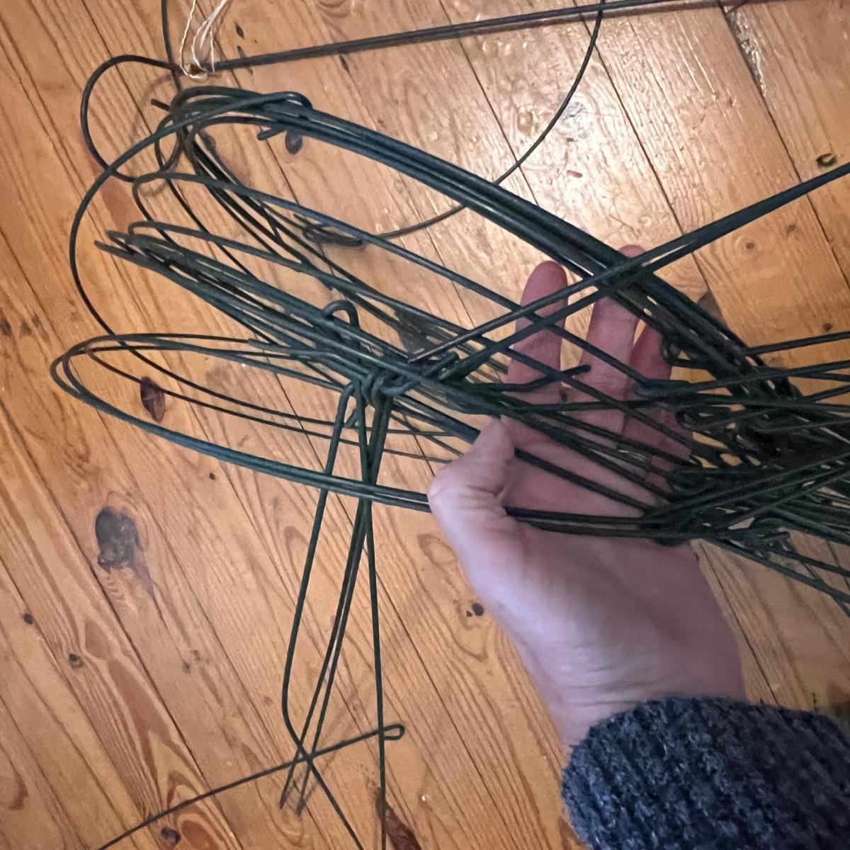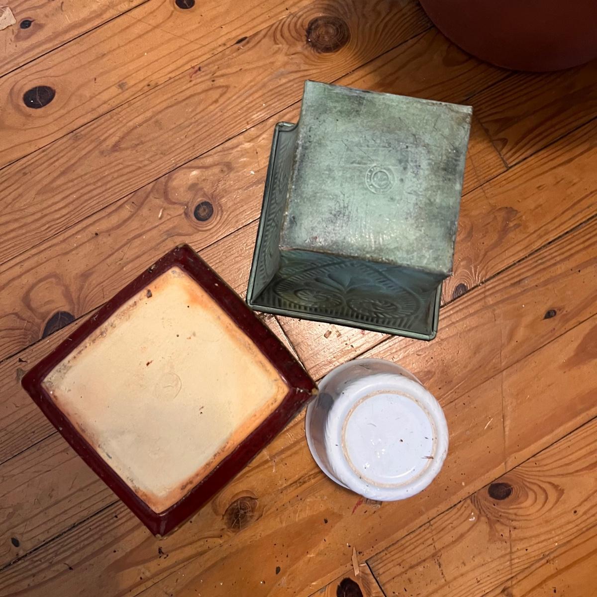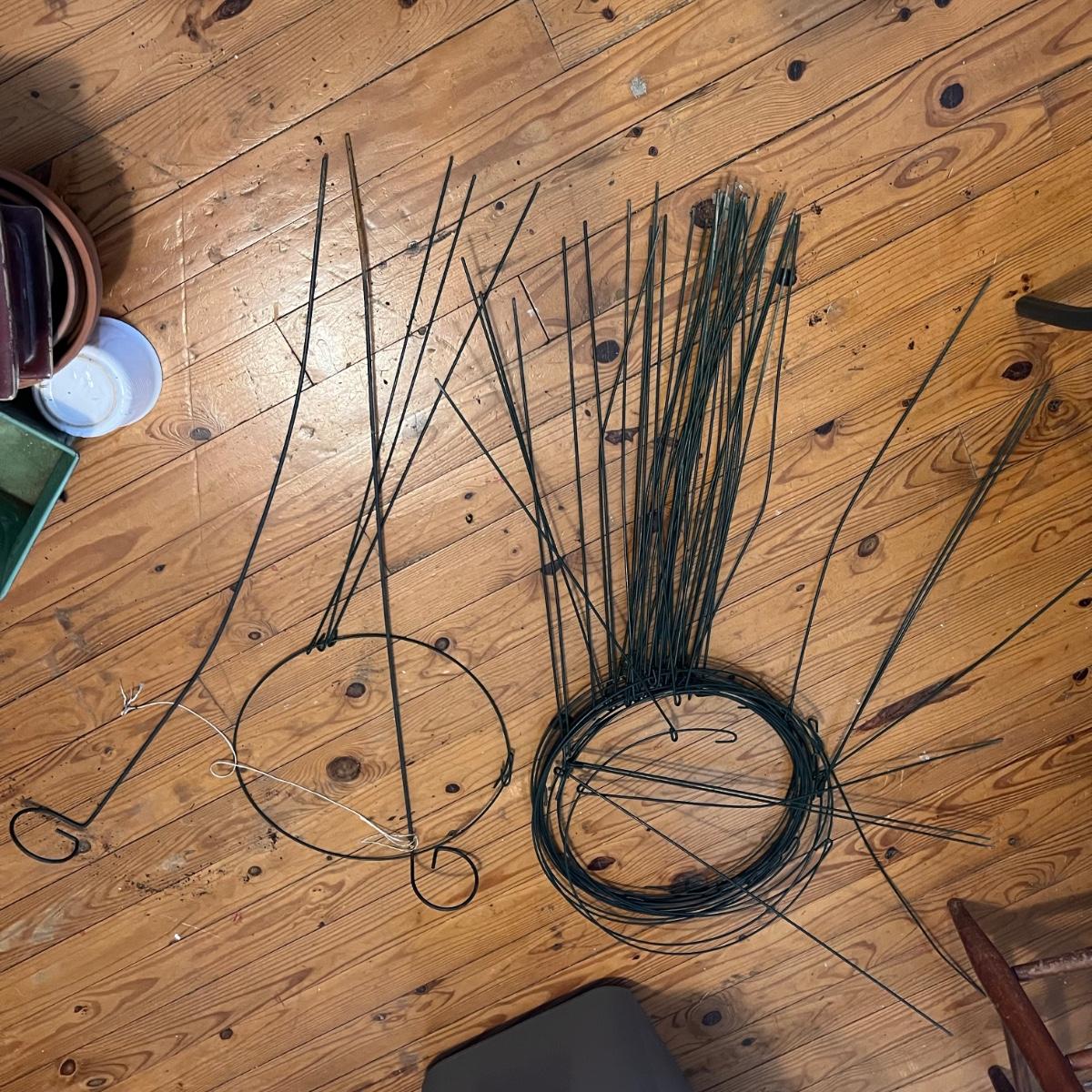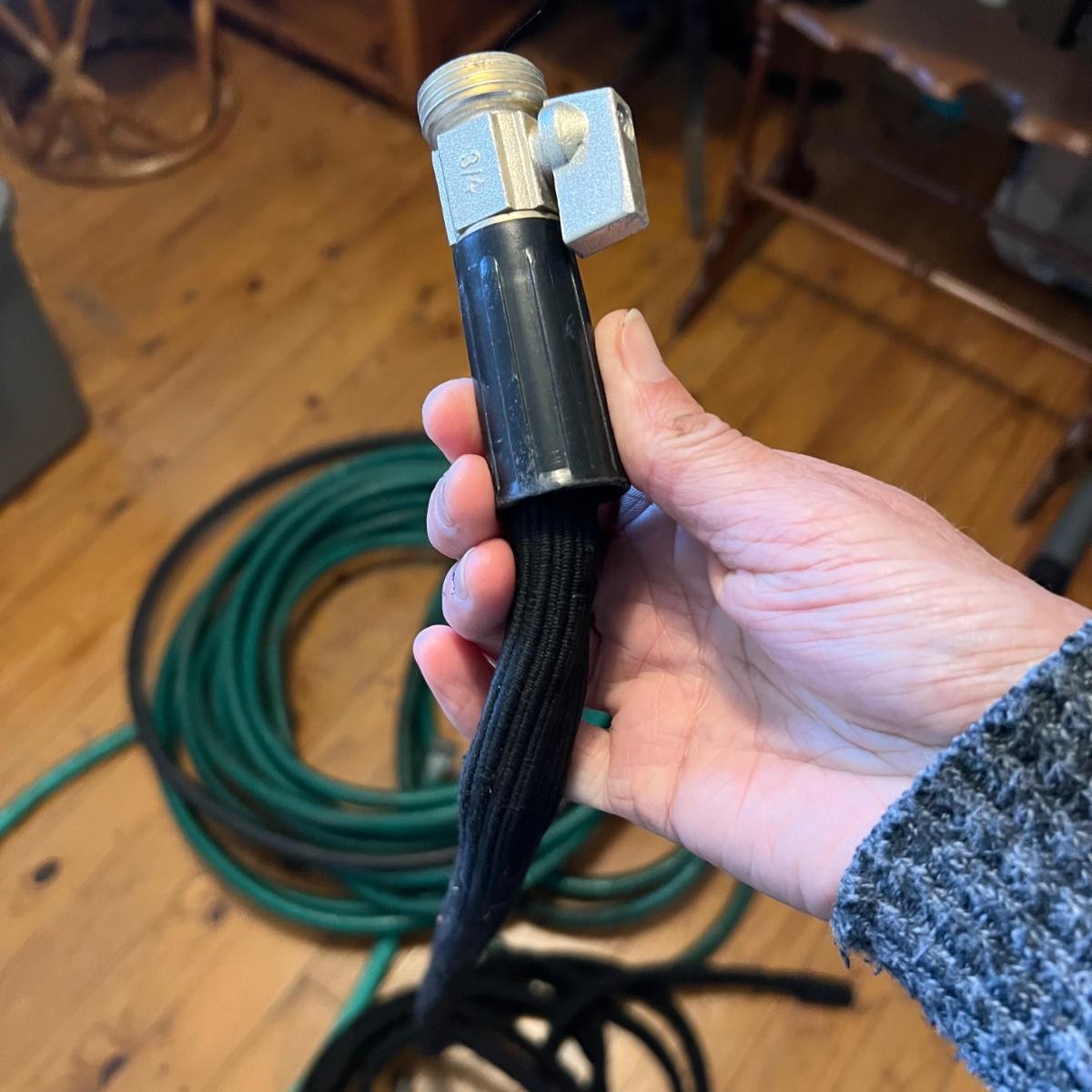 A large assortment of yard essentials includes tools, hoses + hose ends, small tarp (5ft x 7ft), plant pots, wooden truncheon, plastic watering cans, canvas tool holder/carrier and more. See pics for full inventory. Green plastic caddy is included. Pots includes 1 large plastic pot (measures 13”D x 12”H), a white and a dark red ceramic, three terracotta and a green metal pots. Note the tarp is thinning in areas. The frogs includes two metal and one plastic. There are approximately ten green plastic stakes.