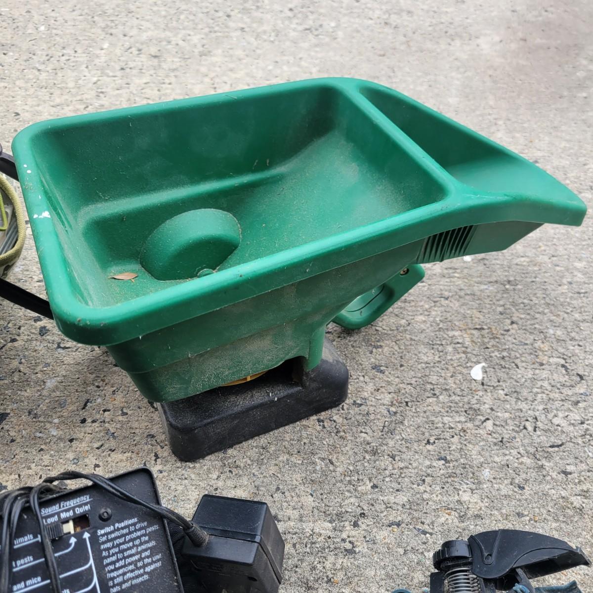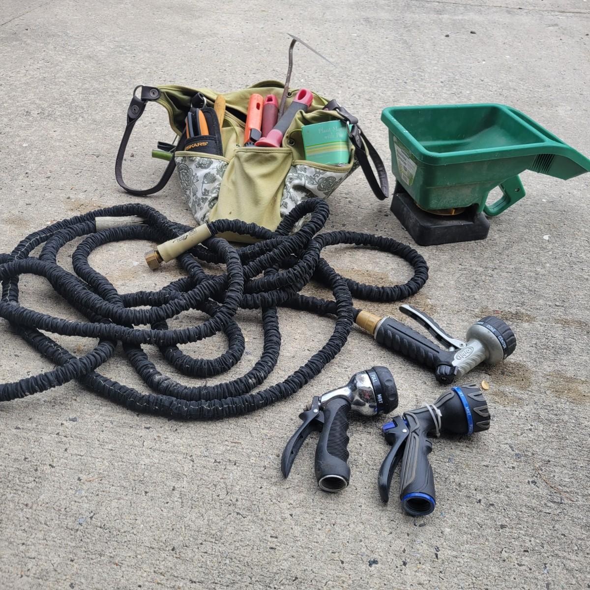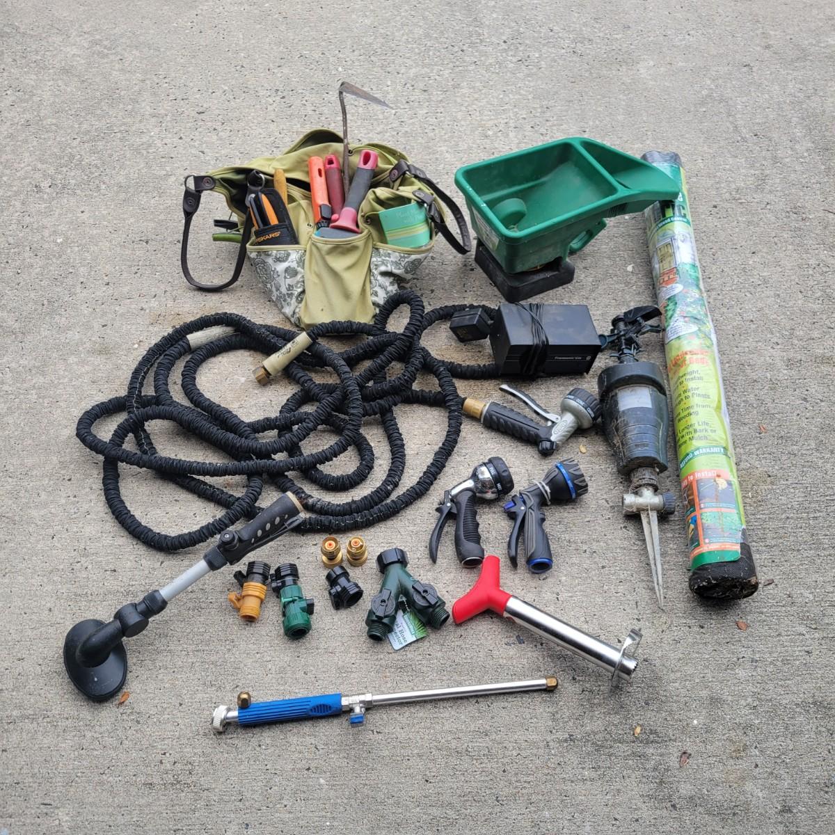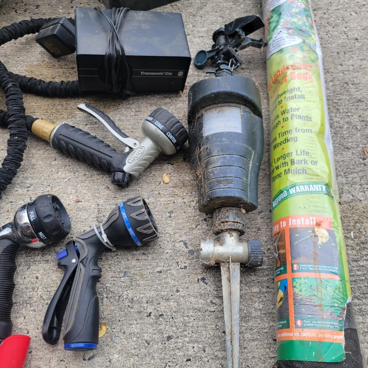 An assortment of gardening tools and items. Included are gardening hand tools with a convenient tool tote, a hand held spreader, landscaping fabric, hose connectors and spray heads. A 25ft flex hose and Transonic Cix box for pest deterrent that powered on when plugged in. Local pickup only
