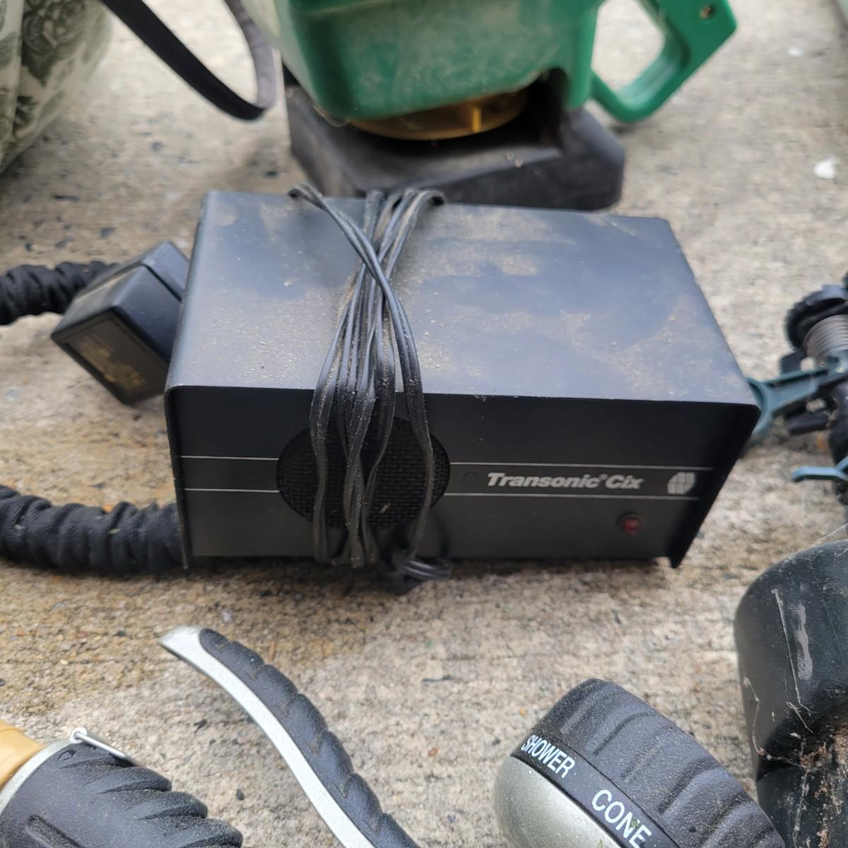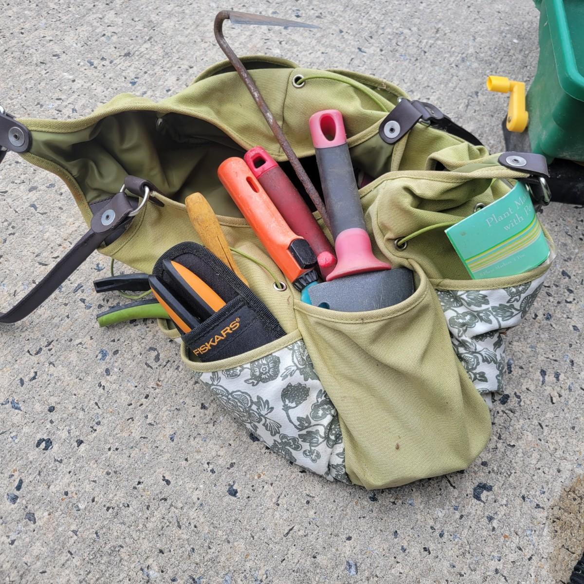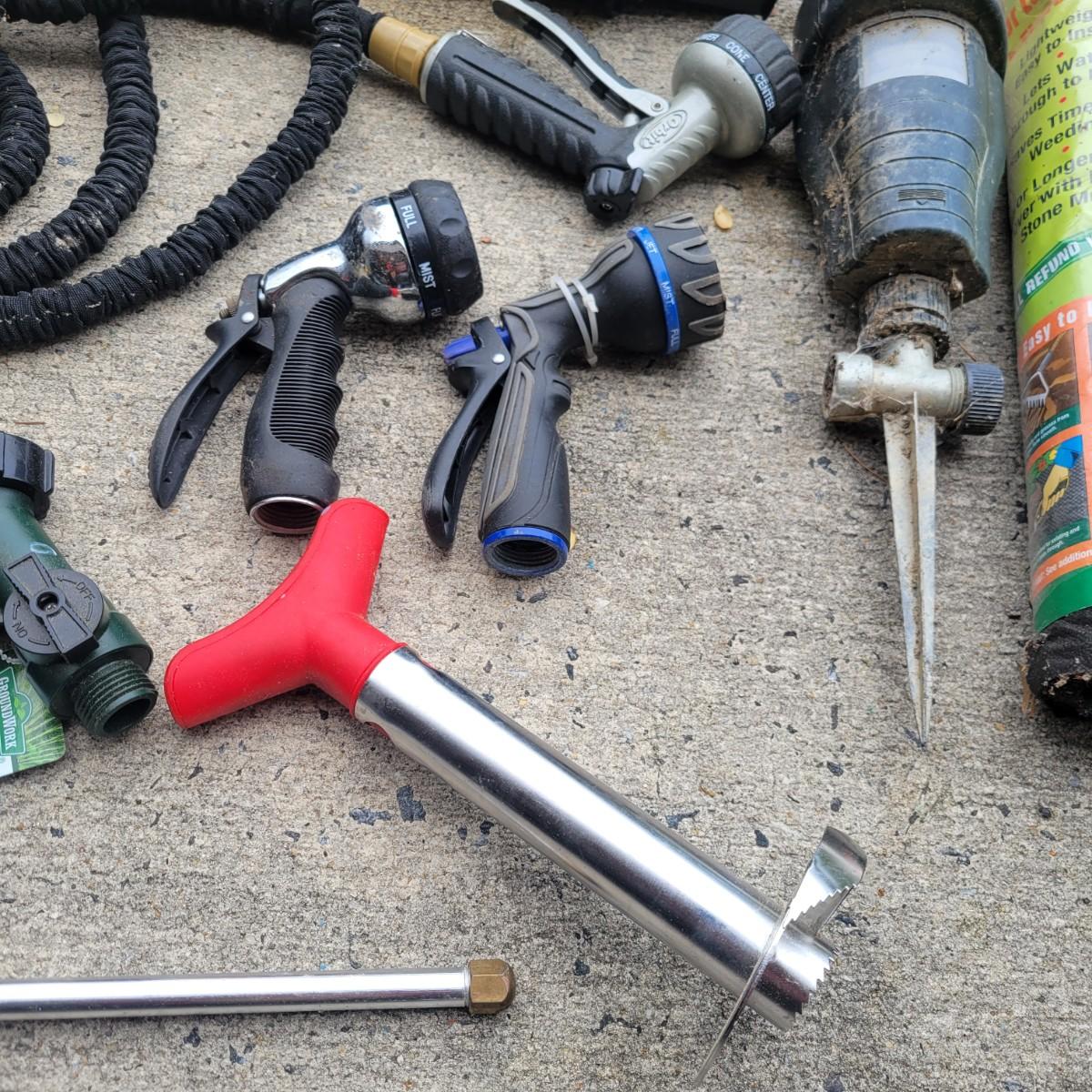 An assortment of gardening tools and items. Included are gardening hand tools with a convenient tool tote, a hand held spreader, landscaping fabric, hose connectors and spray heads. A 25ft flex hose and Transonic Cix box for pest deterrent that powered on when plugged in. Local pickup only