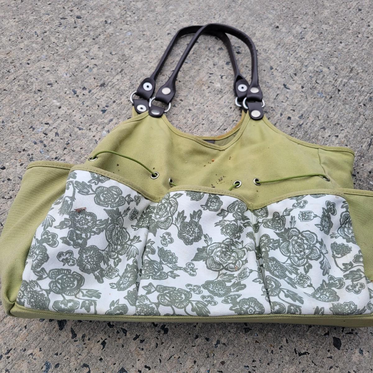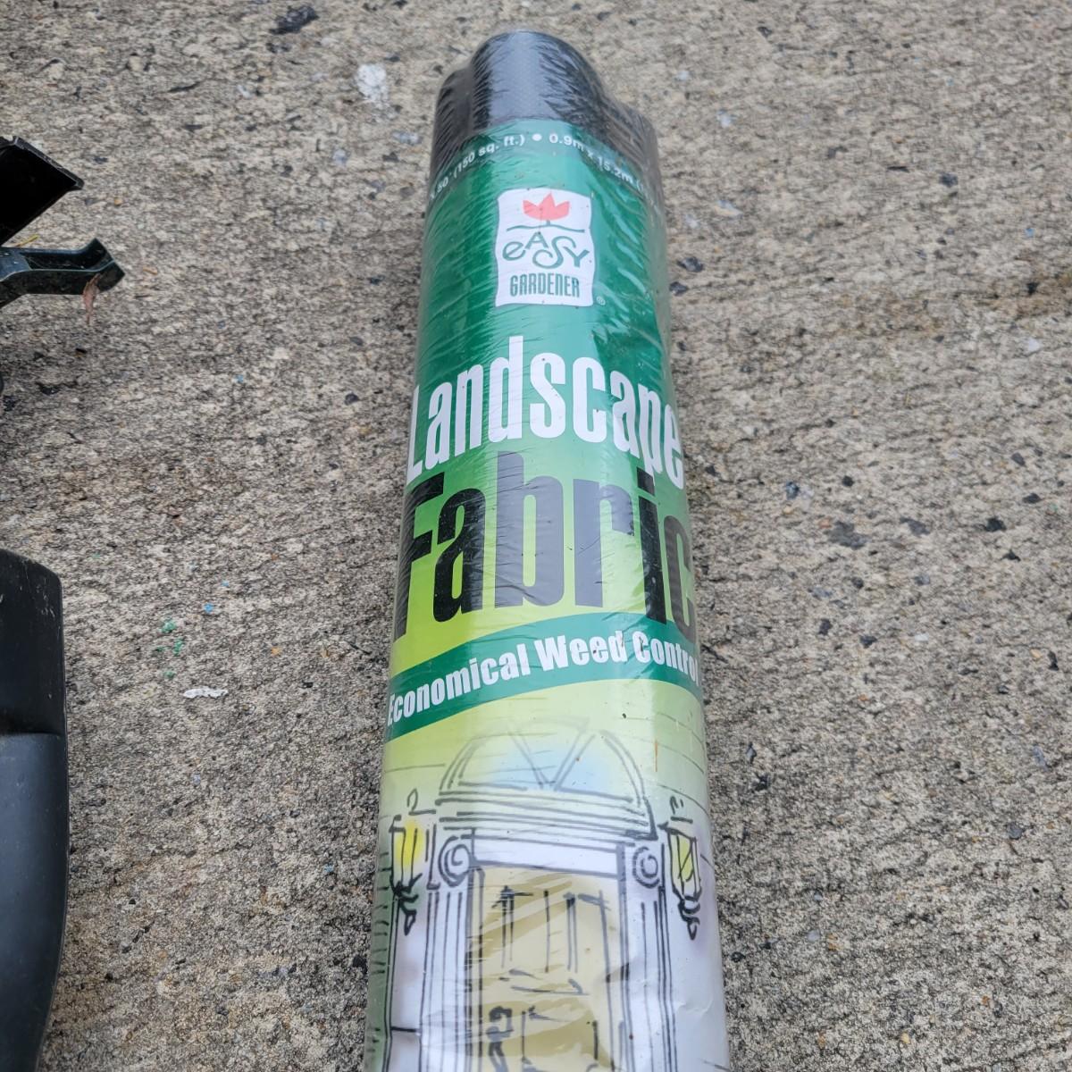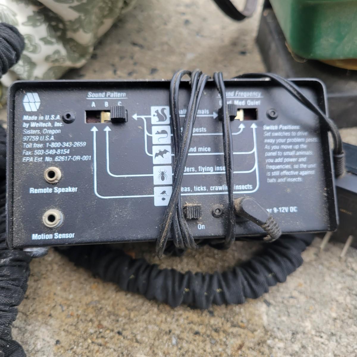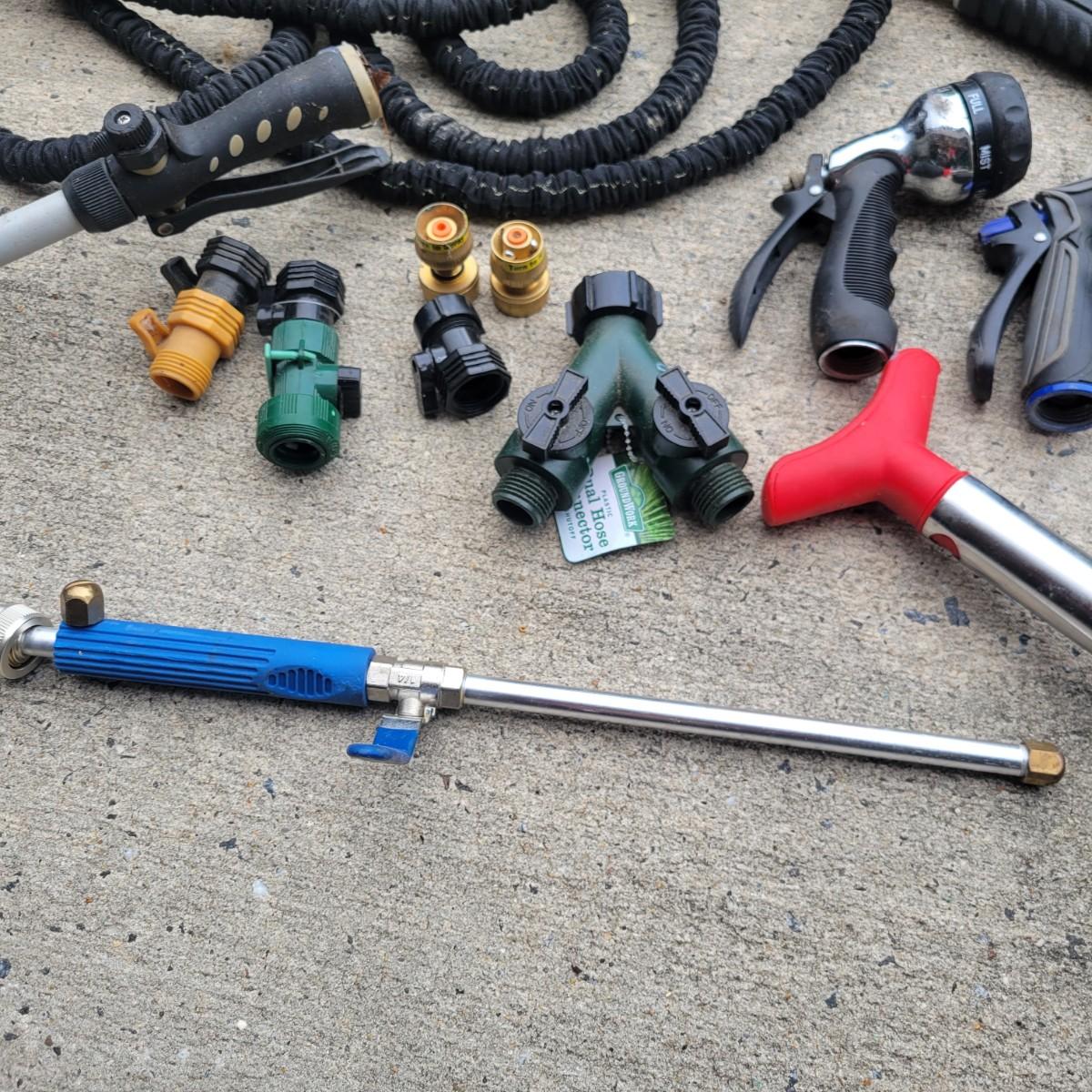 An assortment of gardening tools and items. Included are gardening hand tools with a convenient tool tote, a hand held spreader, landscaping fabric, hose connectors and spray heads. A 25ft flex hose and Transonic Cix box for pest deterrent that powered on when plugged in. Local pickup only