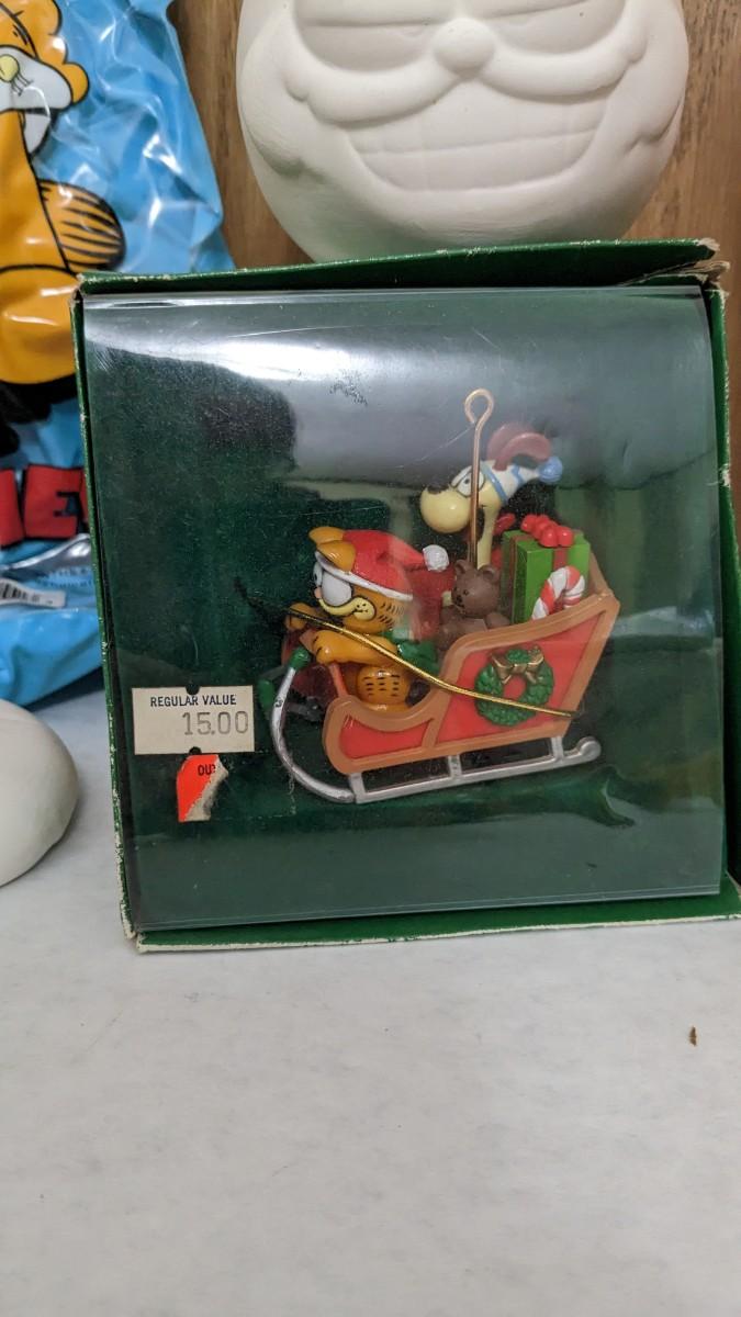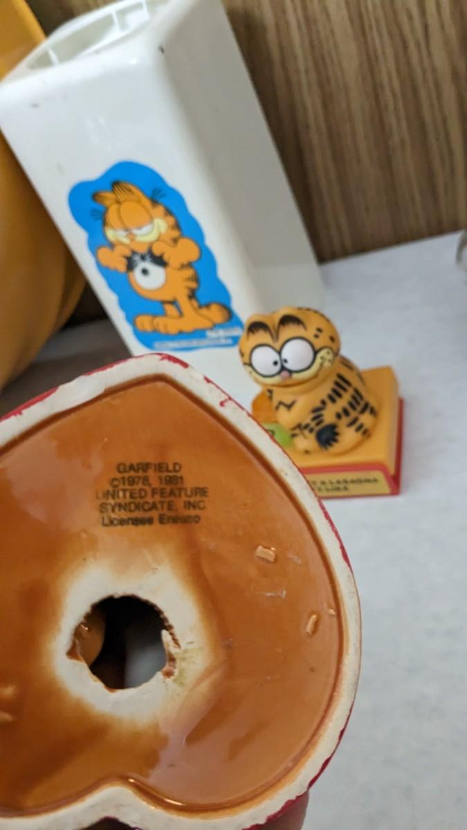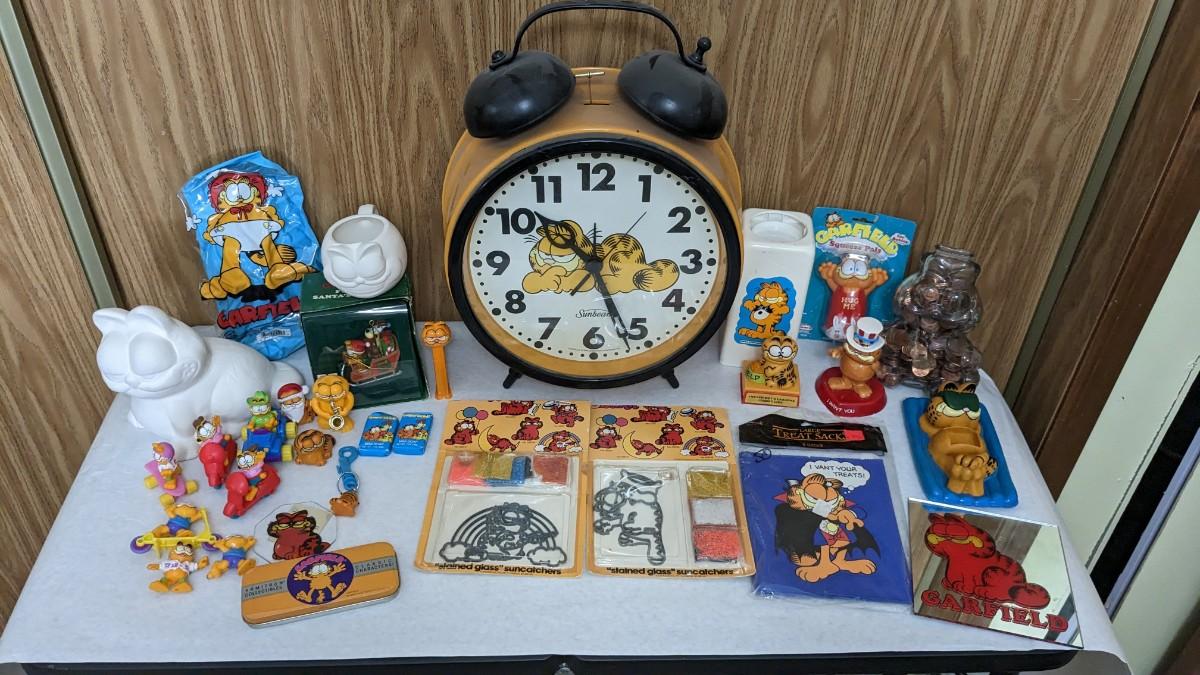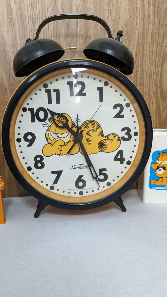 Includes oversized 18" double bell Sunbeam alarm clock from 1978-in excellent condition, new in package bake'n suncatchers, 1978 Enesco ornament in package, disposable cup dispenser, Halloween bags, and piggy bank that's full to the brim with pennies. Lots of goodies in here. Specialty handling will apply, inquire for more details. bdrm2