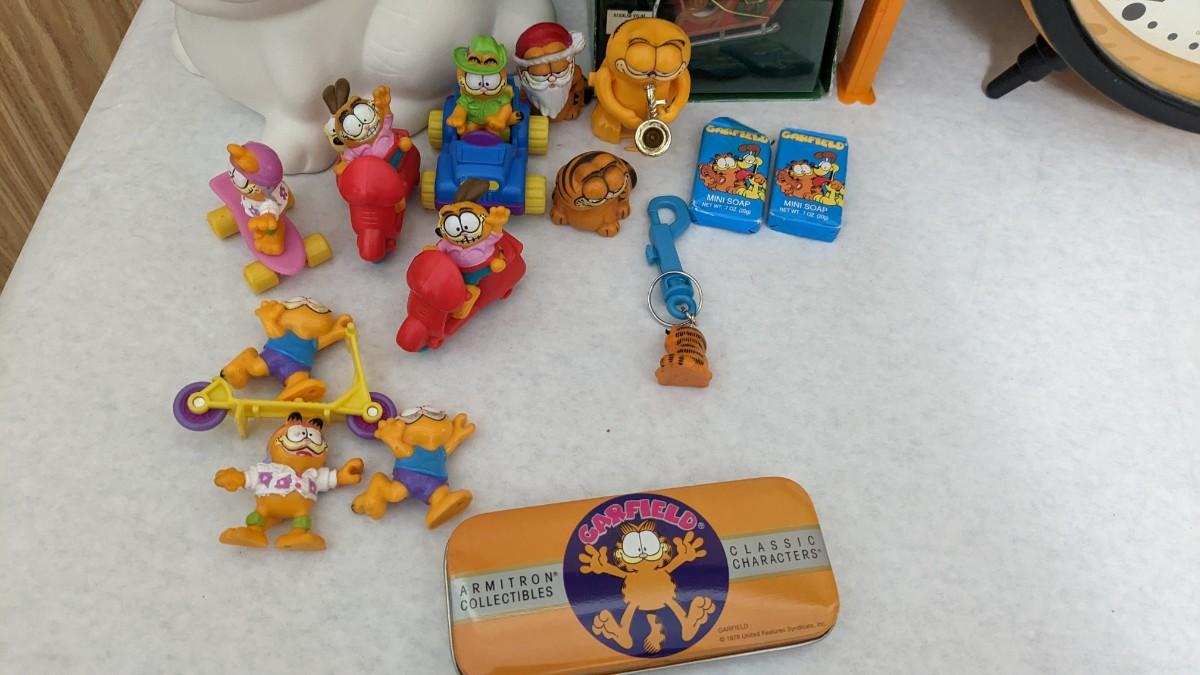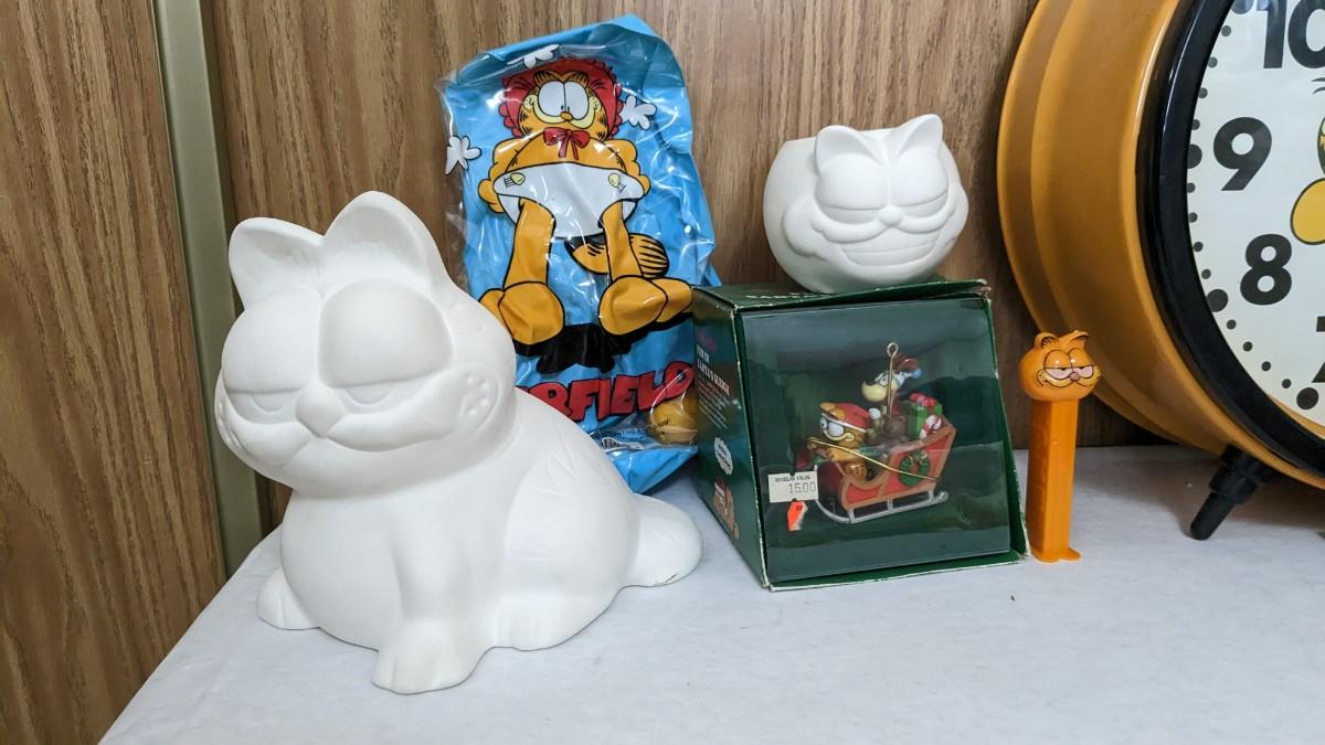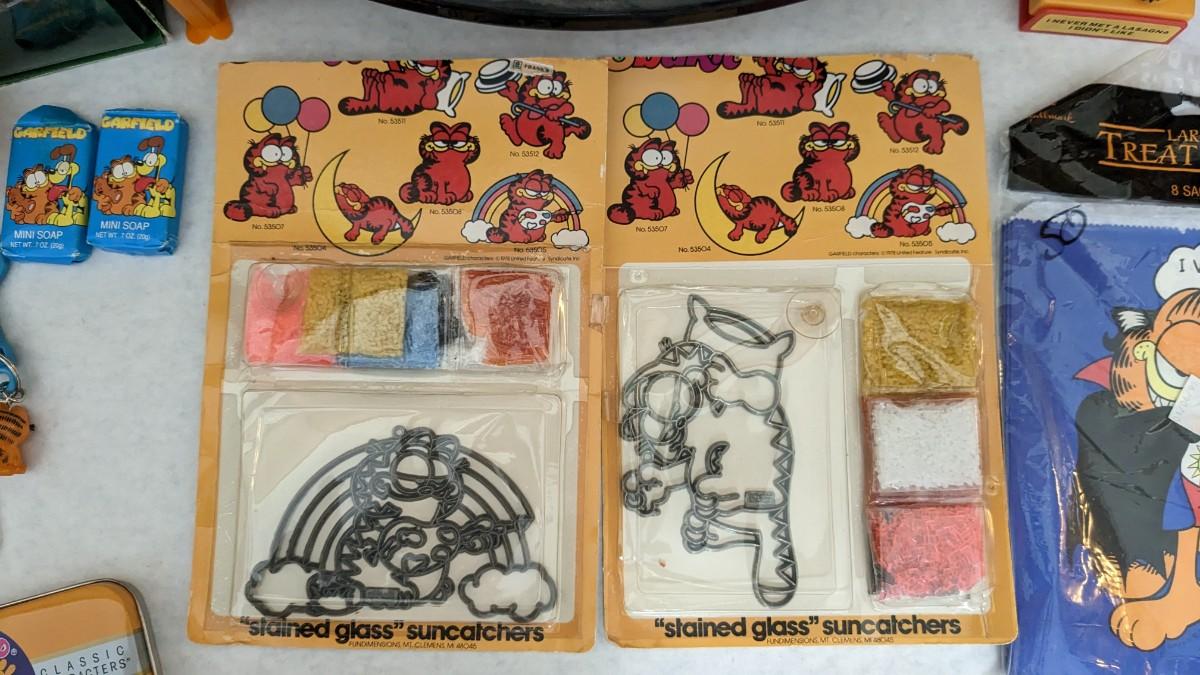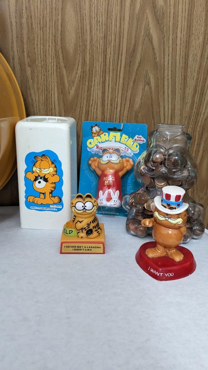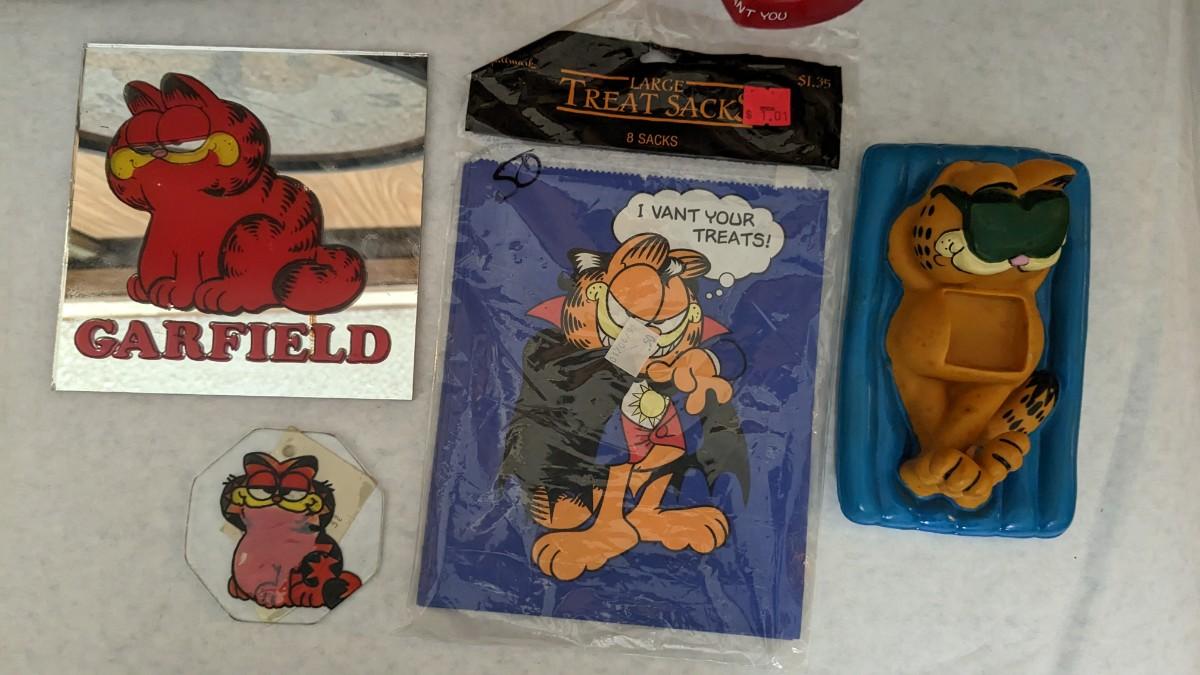 Includes oversized 18" double bell Sunbeam alarm clock from 1978-in excellent condition, new in package bake'n suncatchers, 1978 Enesco ornament in package, disposable cup dispenser, Halloween bags, and piggy bank that's full to the brim with pennies. Lots of goodies in here. Specialty handling will apply, inquire for more details. bdrm2