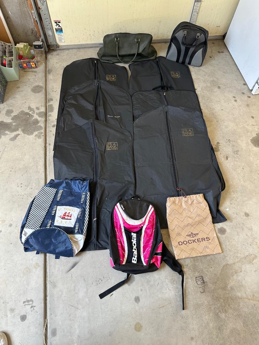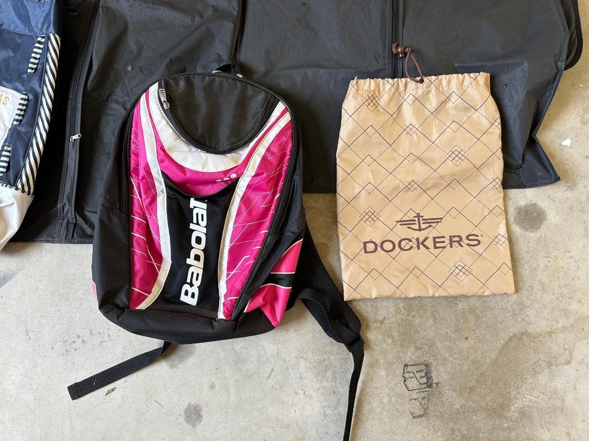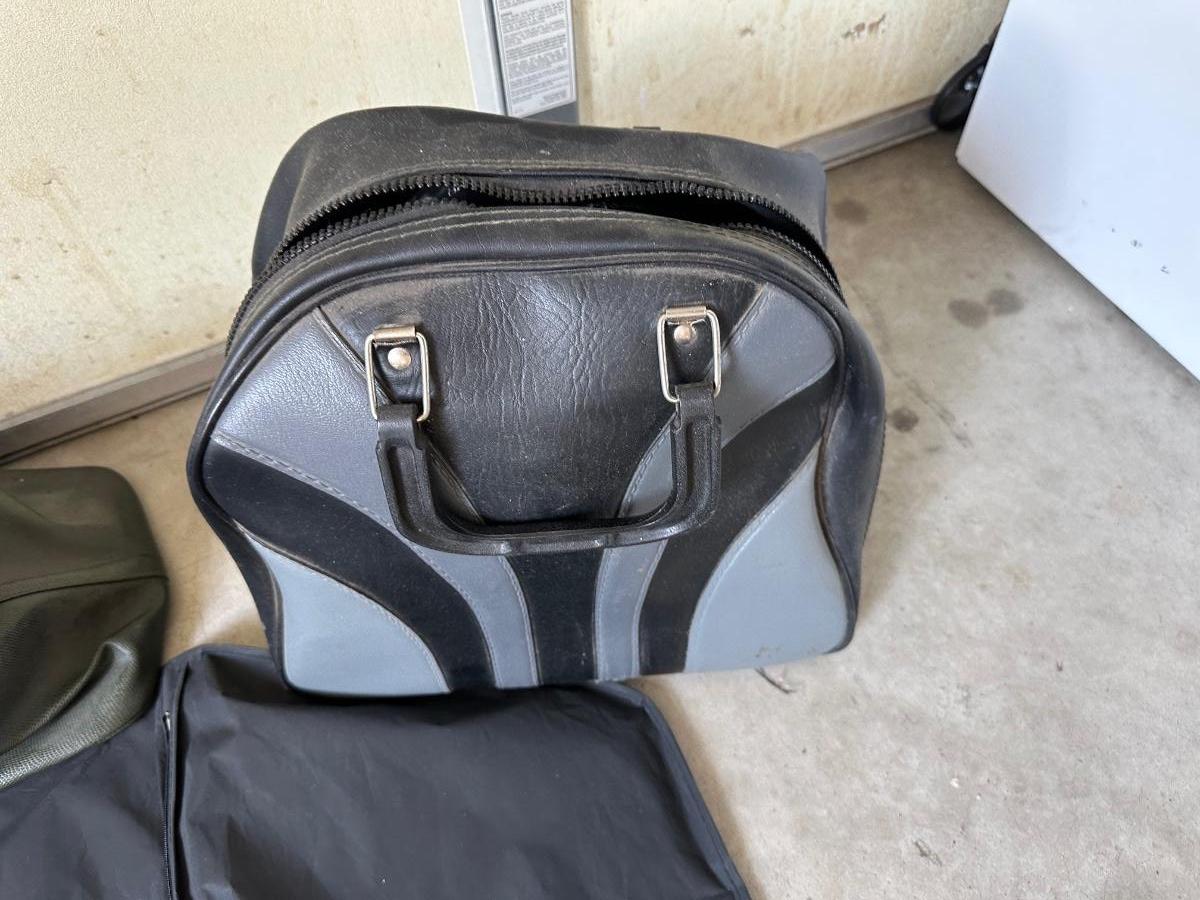 GARMENT BAGS, BACKPACK, BEACH BAG AND A BOWLING BALL