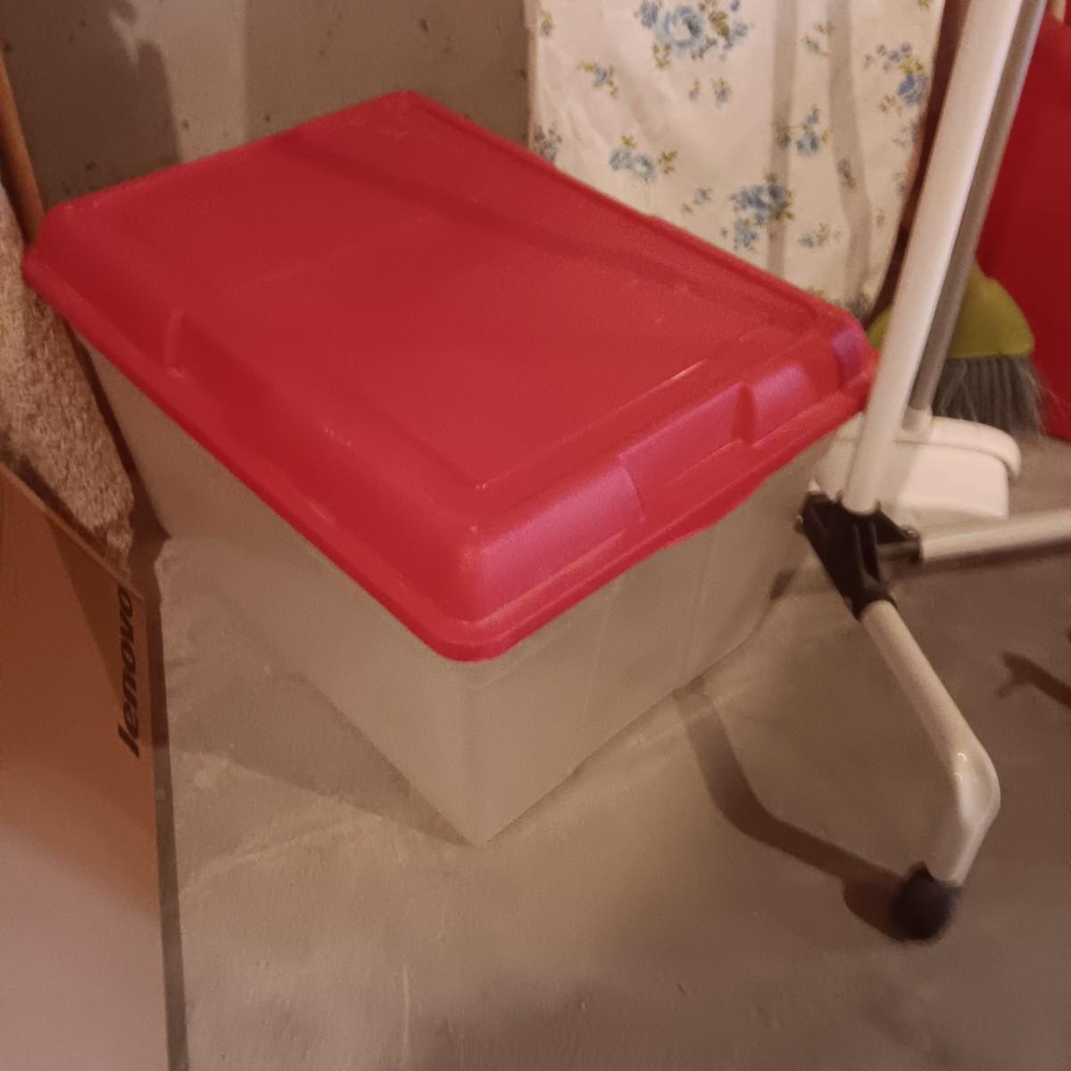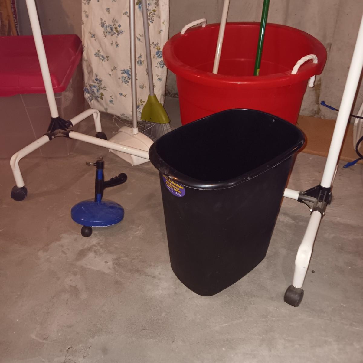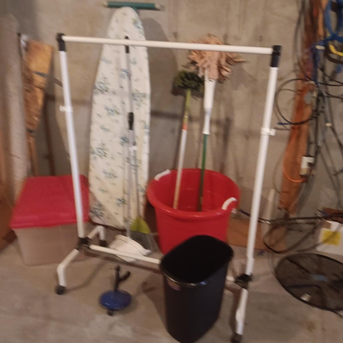 GARMENT RACK, IRONING BOARD, STORAGE TOTE AND PAIL PLUS MORE