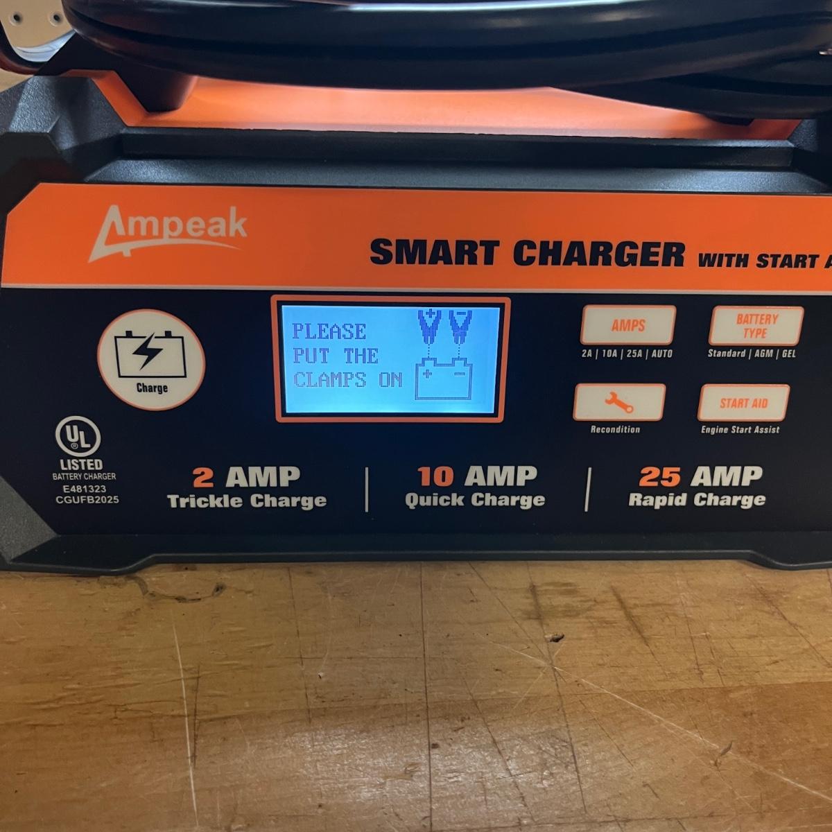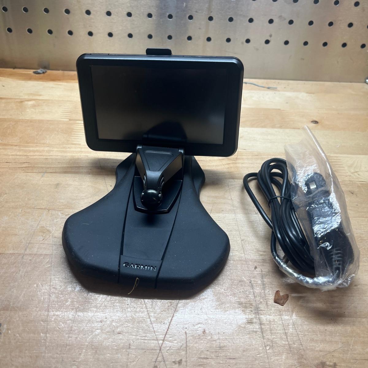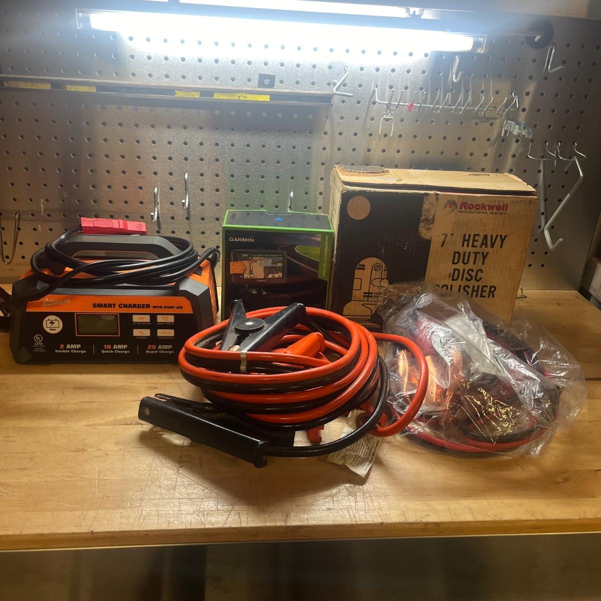 Lot includes a Garmin Nuvi 50LM, Ampeak smart battery charger, two pairs of jumper cables and a Rockwell 7” polisher. All items powered on when plugged in. Battery charger measures 10.5” x 8” x 7”H.