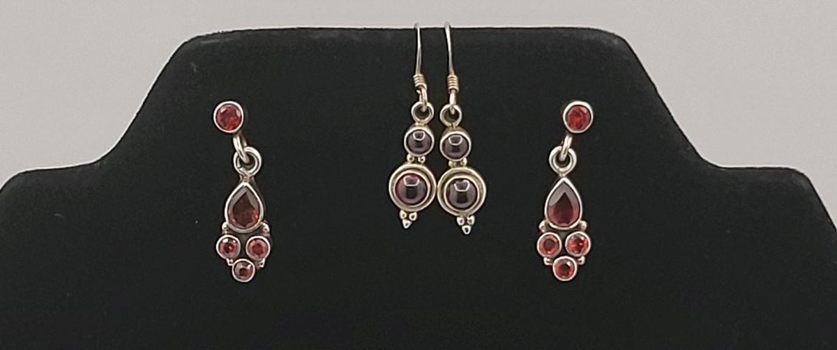 18" Necklace with garnet & moonstone (India) with pendant adding 2". Vintage, deep red garnet tennis bracelet, 7" long, featuring a nice box push clasp. Two pairs dangle garnet pierced earrings. 43.3 grams.