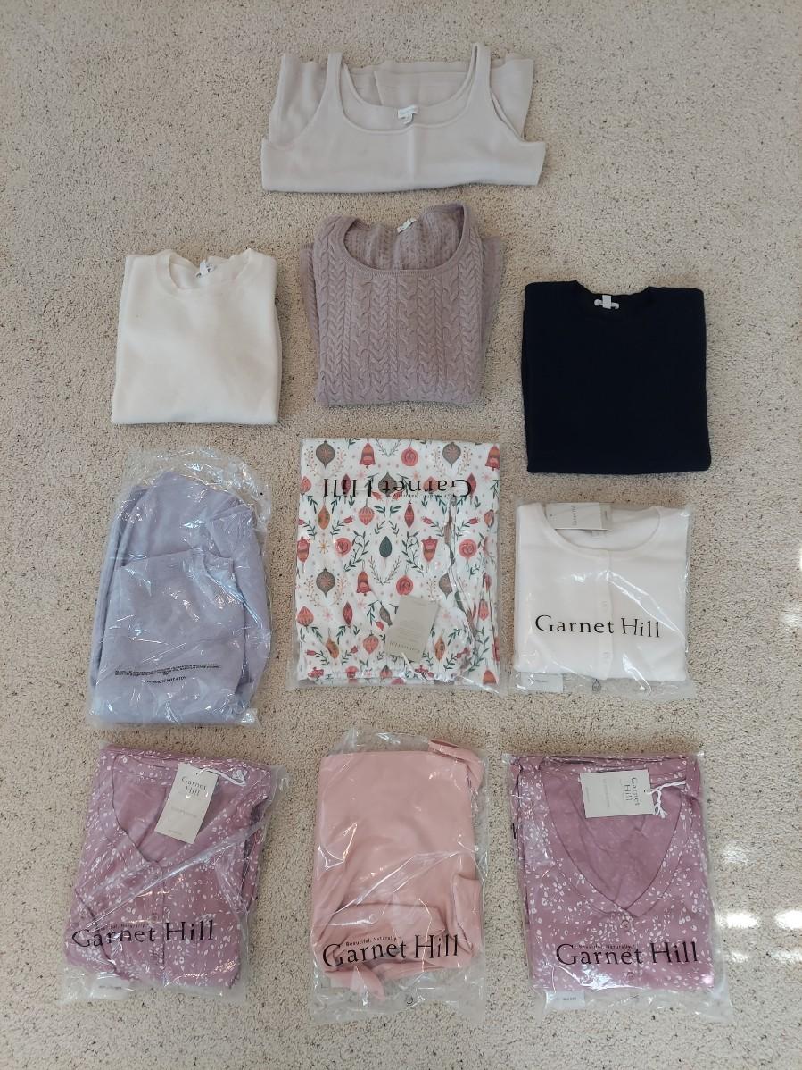Ten pieces of Garnet Hill clothing in size extra large. Some items are cashmere. Five items appear to be unopened, in original packaging, while the rest are in worn condition. Please see photos for details. Shipping available