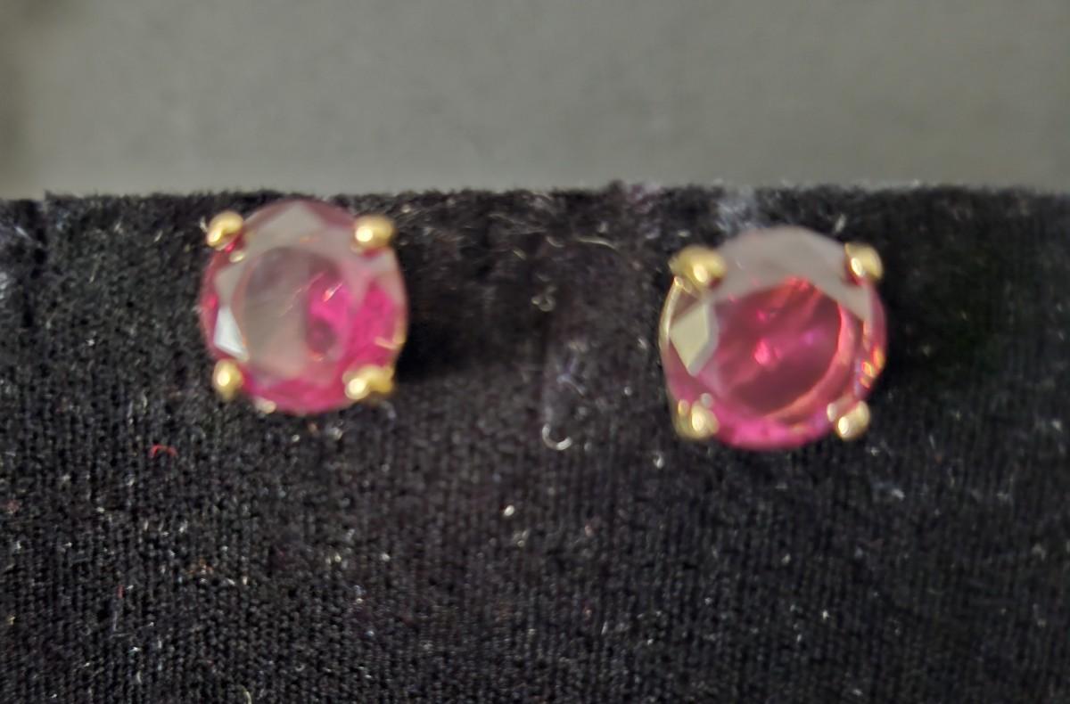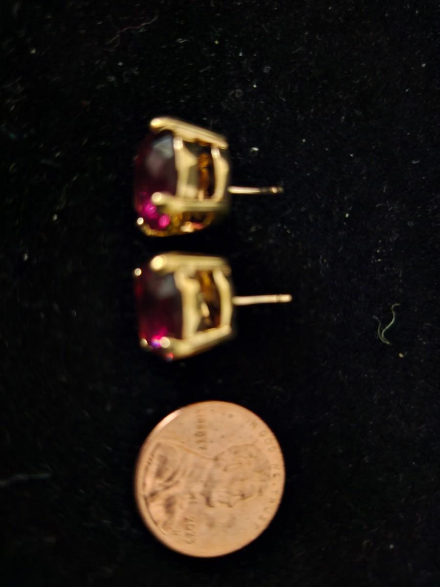 These are very pretty earrings set in 10K gold. The photos show the garnets with the flash on, they are a dark rich red in normal light. The stones are measuring 11.31 mm to 11.72 mm., ~ 6mm deep. It was difficult to measure in the heavy setting.