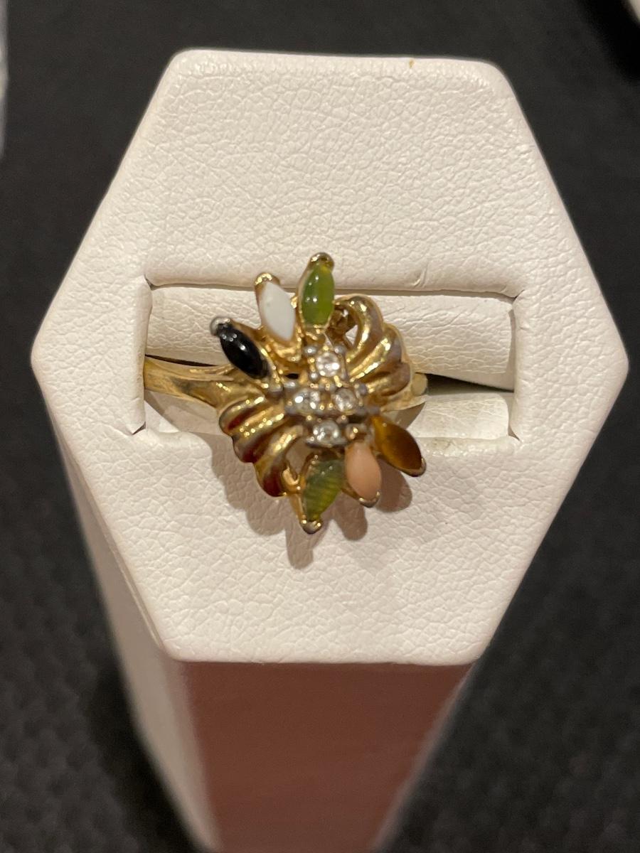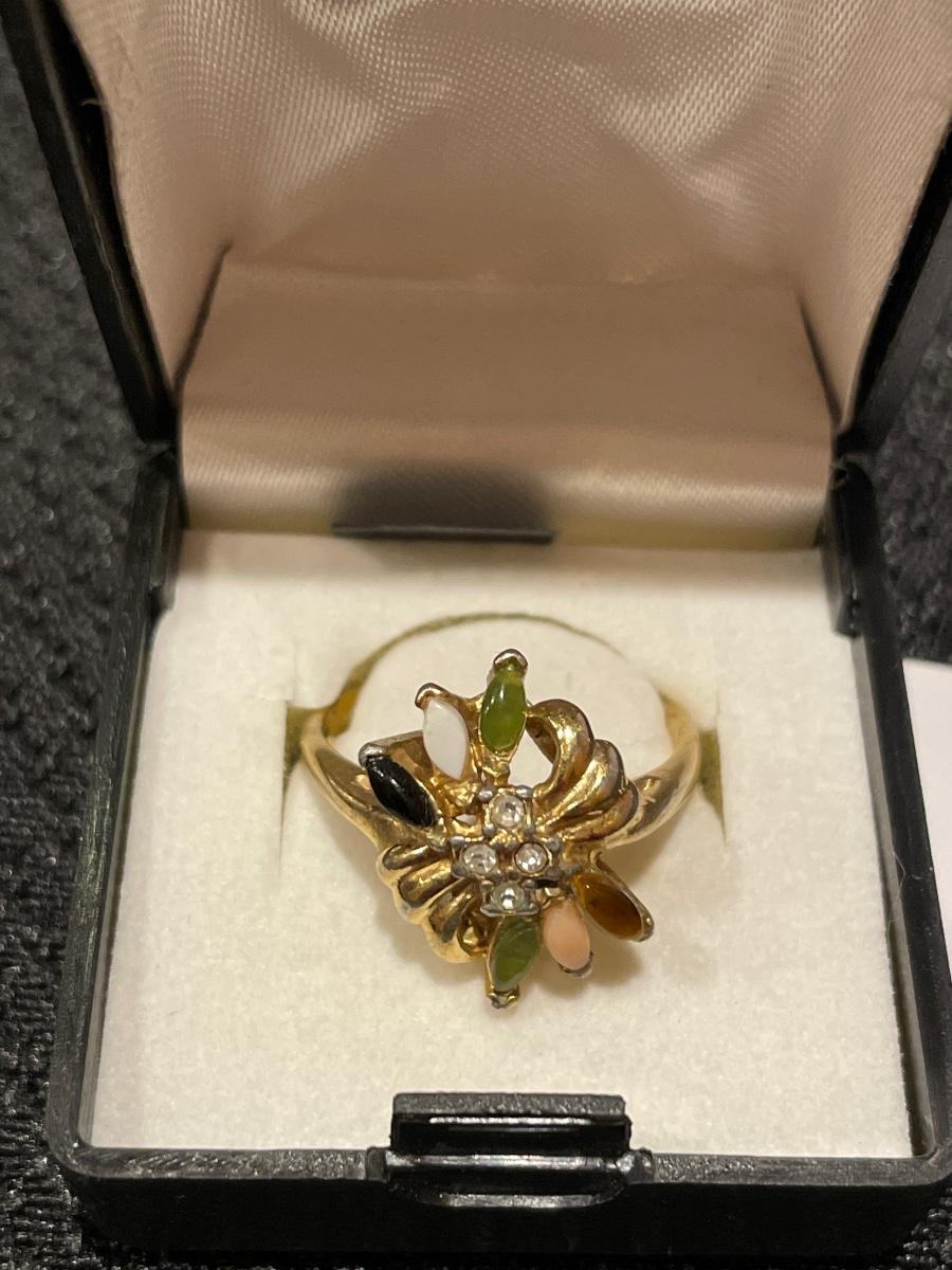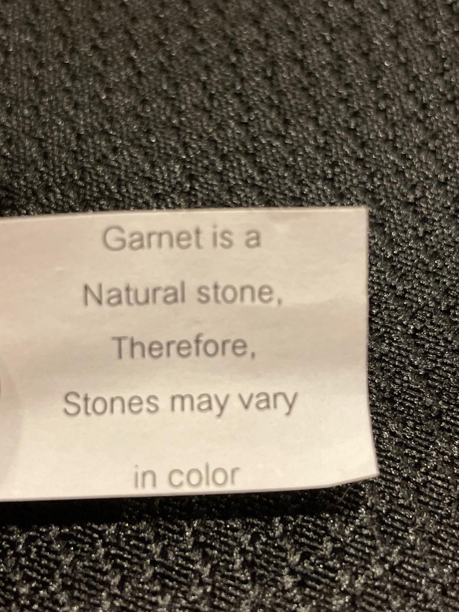 Ring comes with a paper stating garnet is real. No other markings are visible