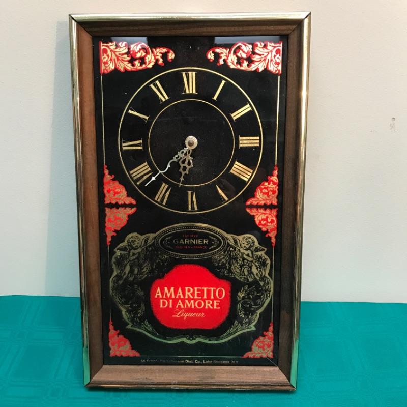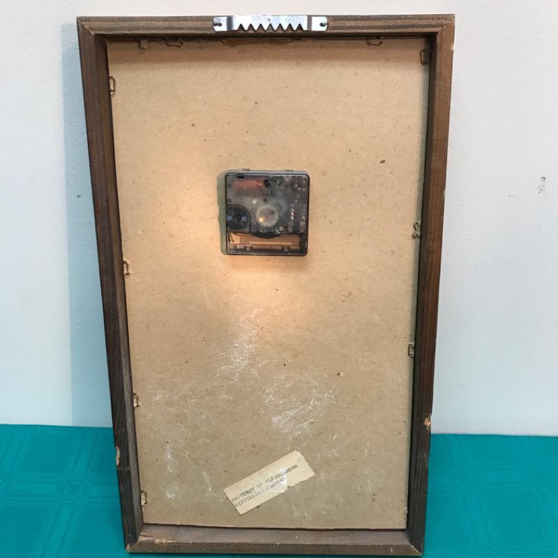 Cannot guarantee the functionality of the clock. The gold rim is missing from the bottom portion of the frame. Measures approximately 15.75“ X 8.75“.