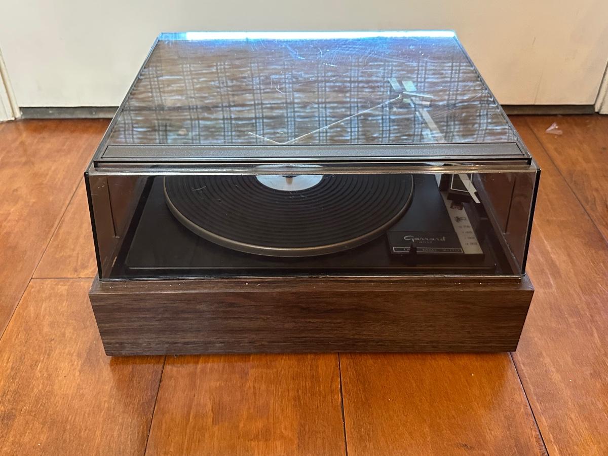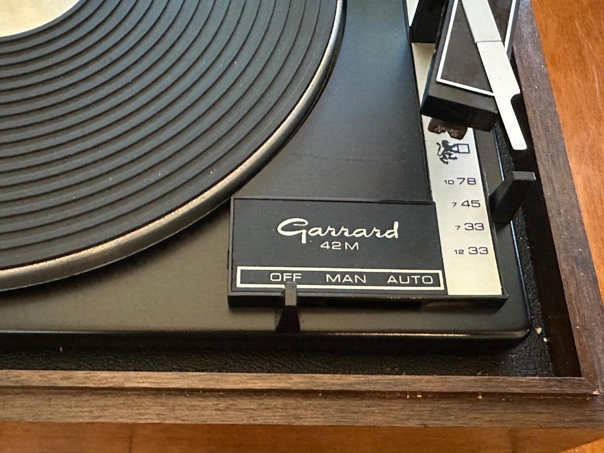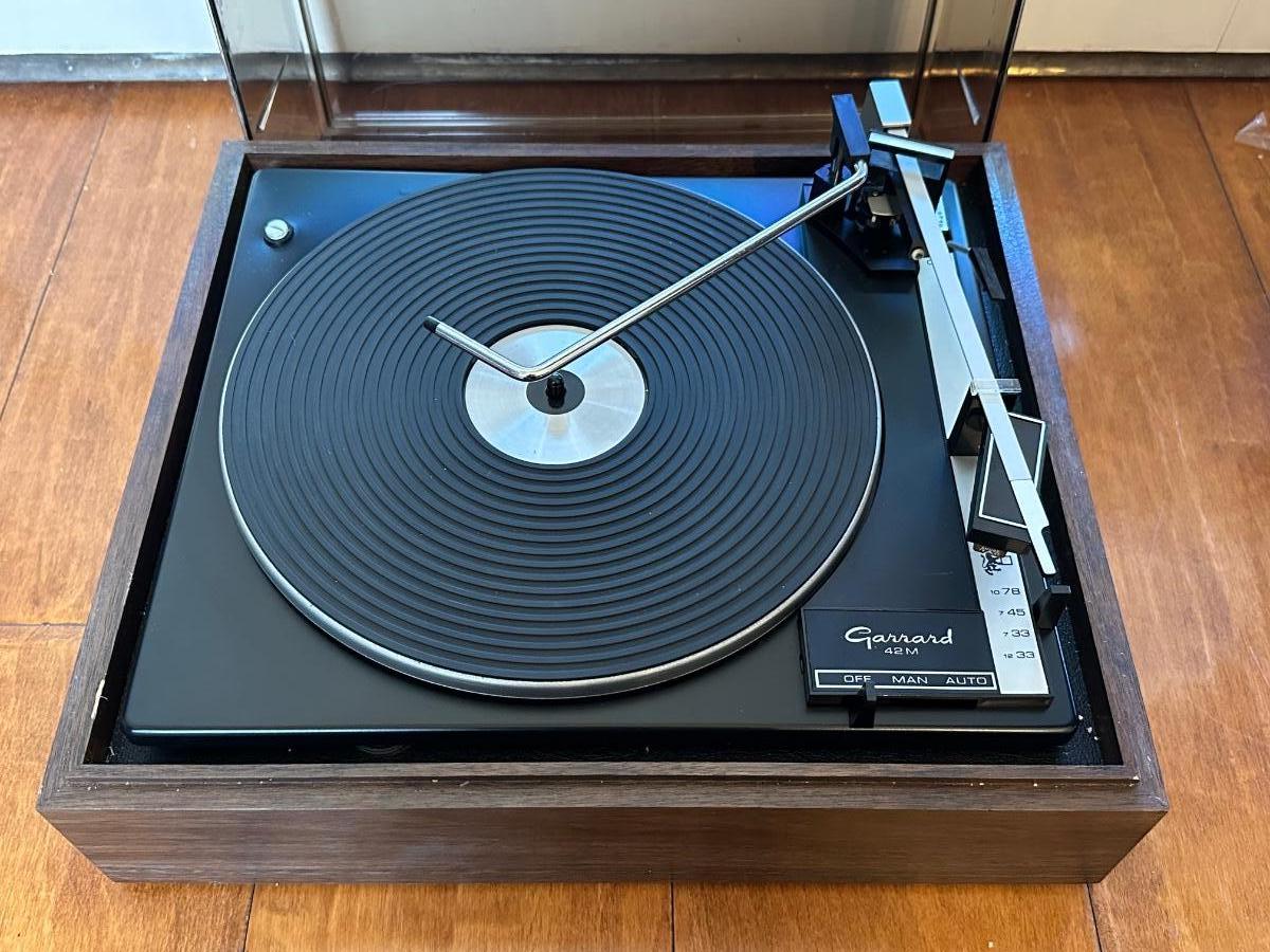 Vintage Garrard Model 42M turntable set into a walnut-tone wood base with smoked acrylic dust cover.