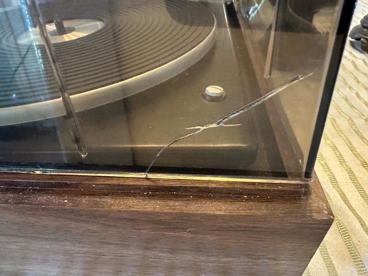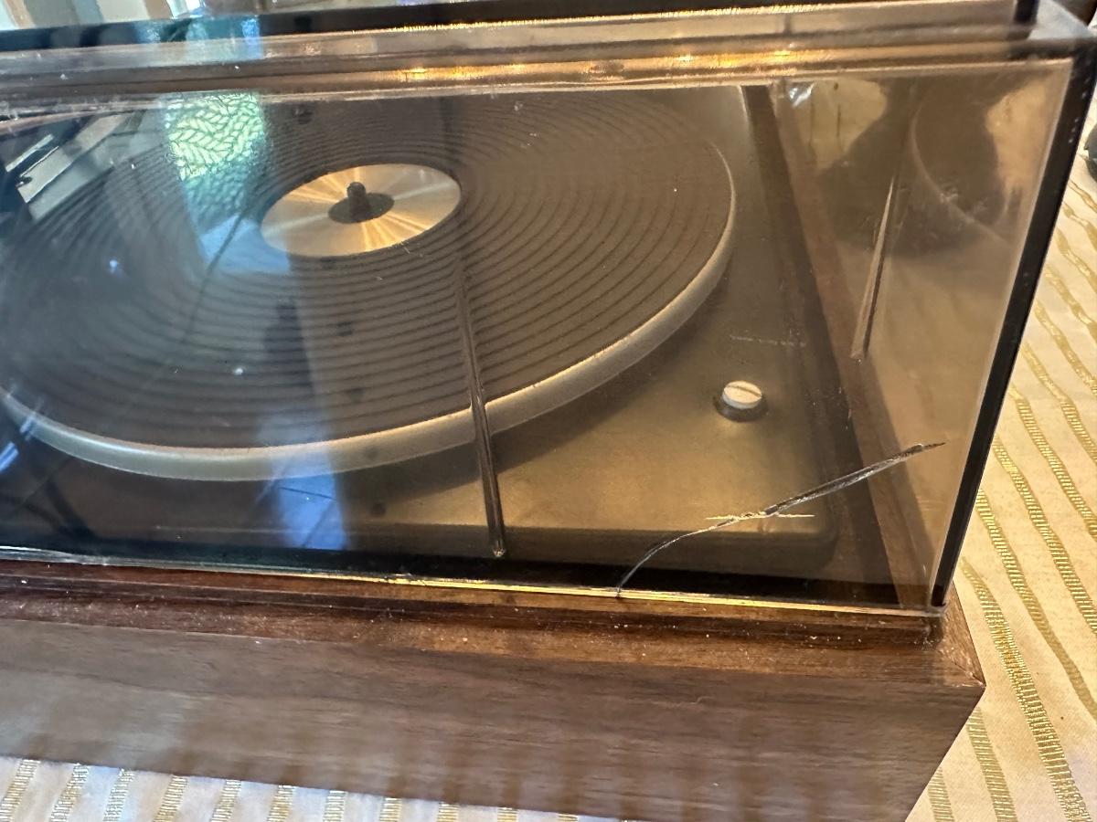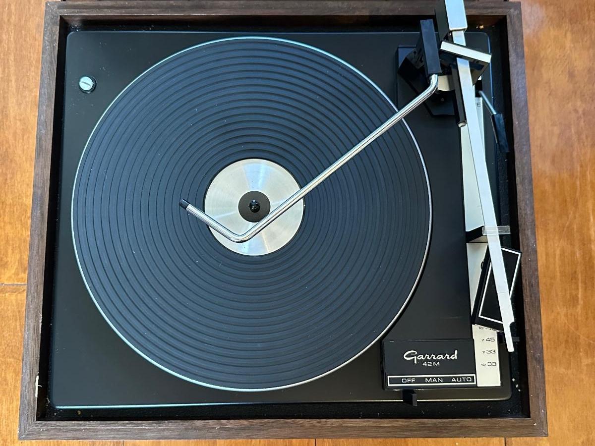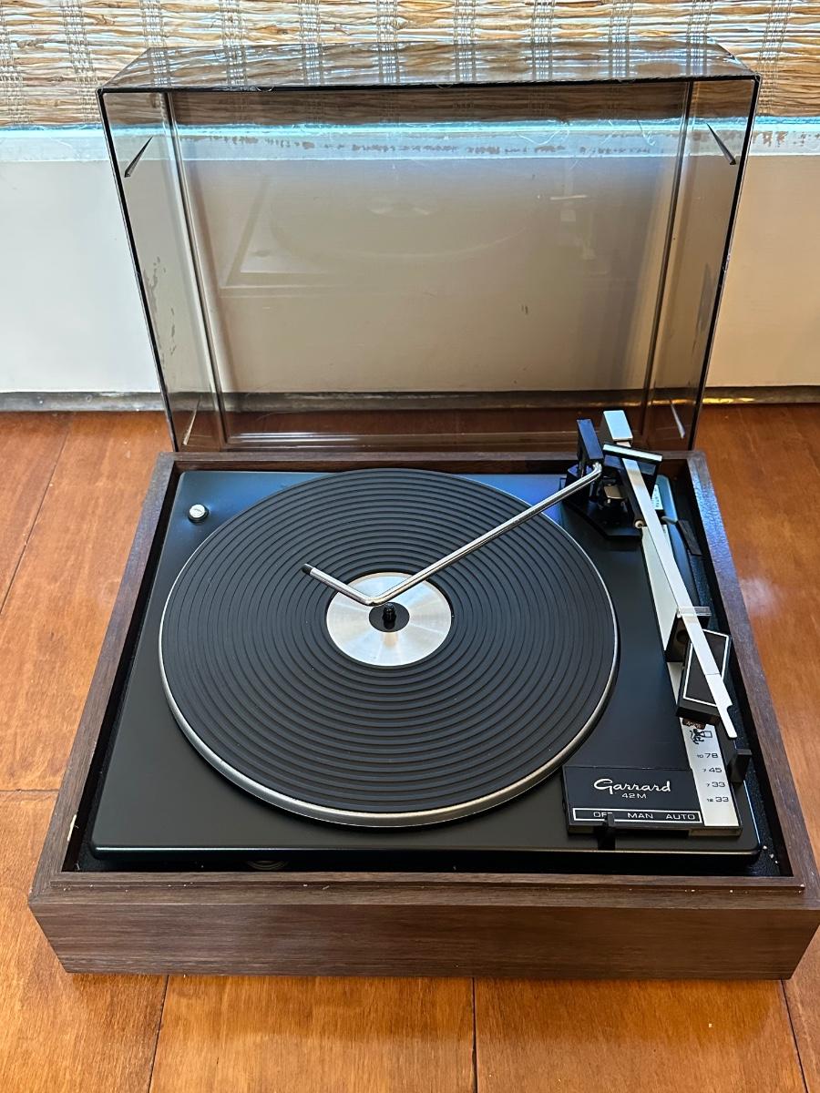 Vintage Garrard Model 42M turntable set into a walnut-tone wood base with smoked acrylic dust cover.