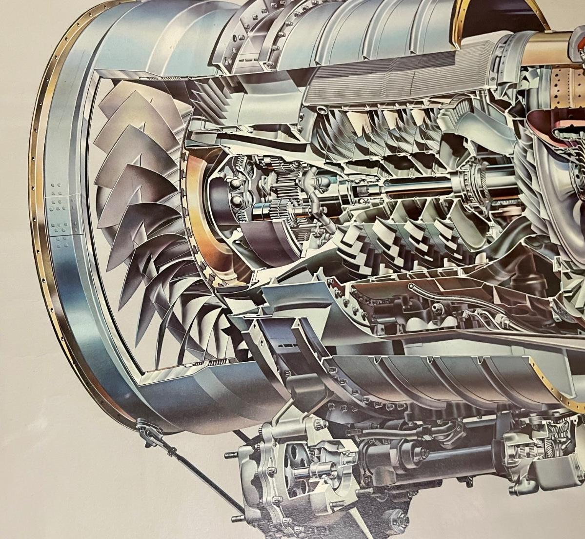 Color cut-away view of the Garrett Airesearch TFE-731-2 Turbofan Jet Engine, showing internal components and shroud structure. Suitable for framing, poster size is approx. 22x 17".